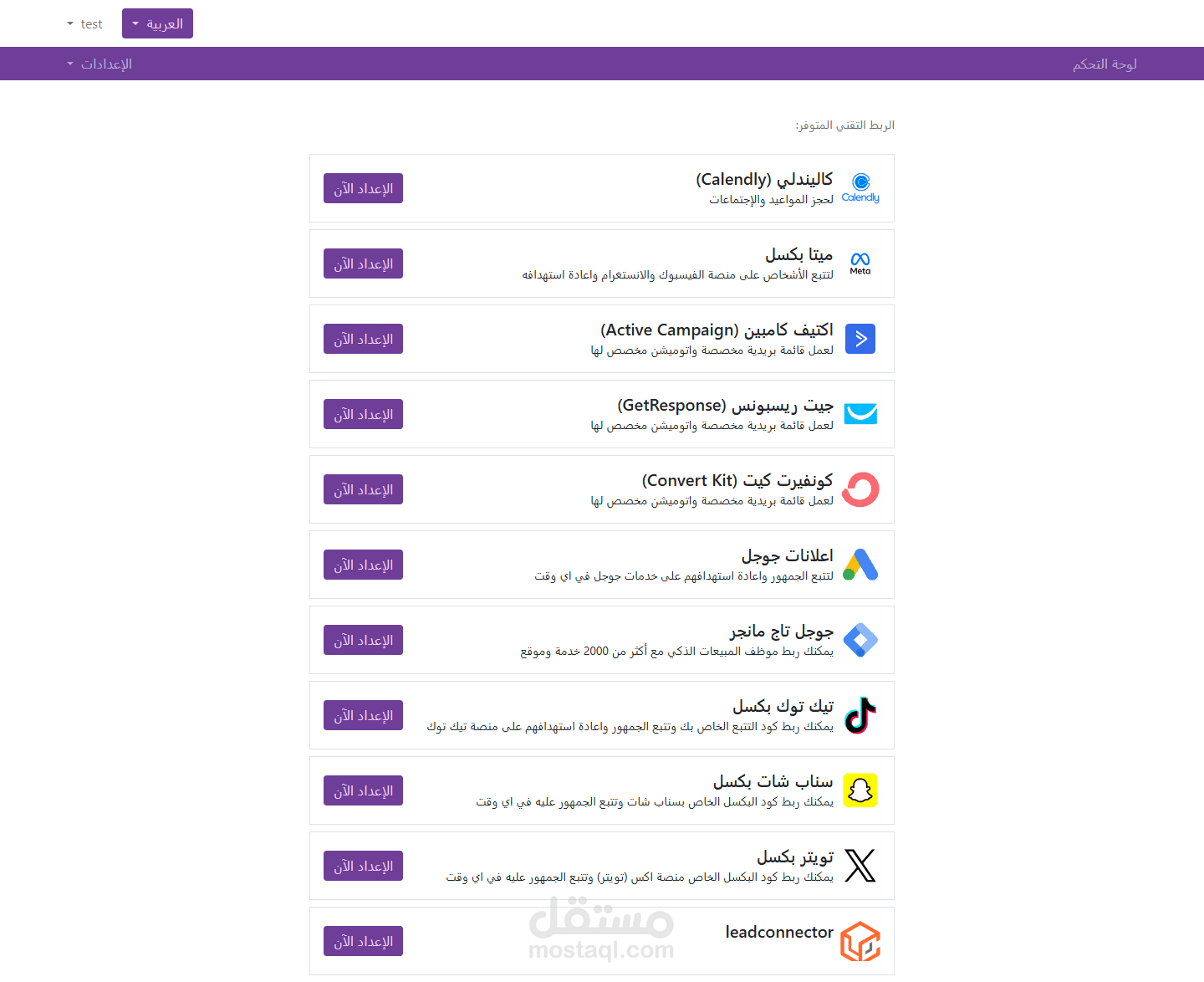 - وبط وتكامل (Integration) مع أكثر من 10 أدوات تسويقية مثل Meta Pixel وGoogle Ads وTikTok Pixel ومنصات تسويقية مثل GetResponse و ActiveCampaign وغيرها.