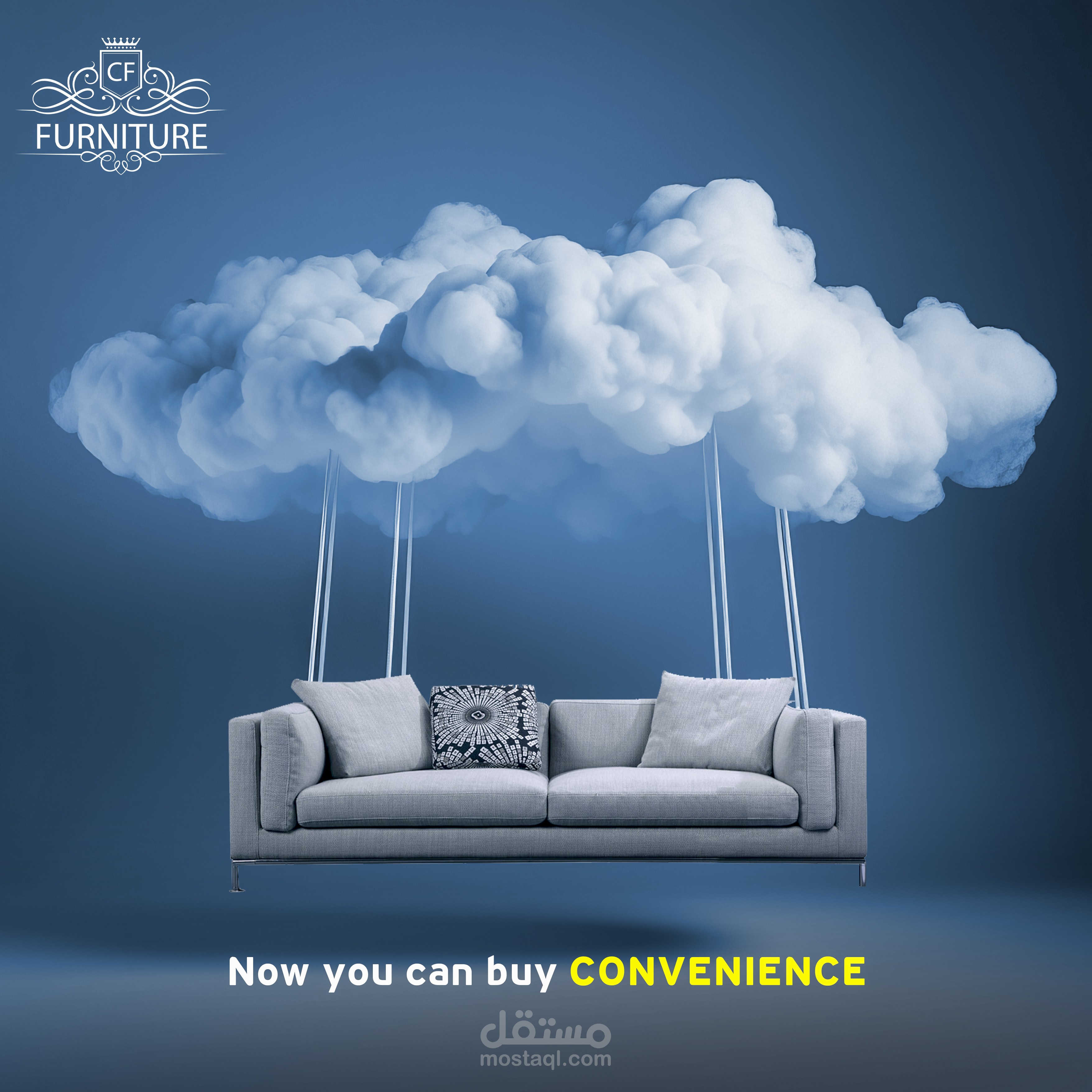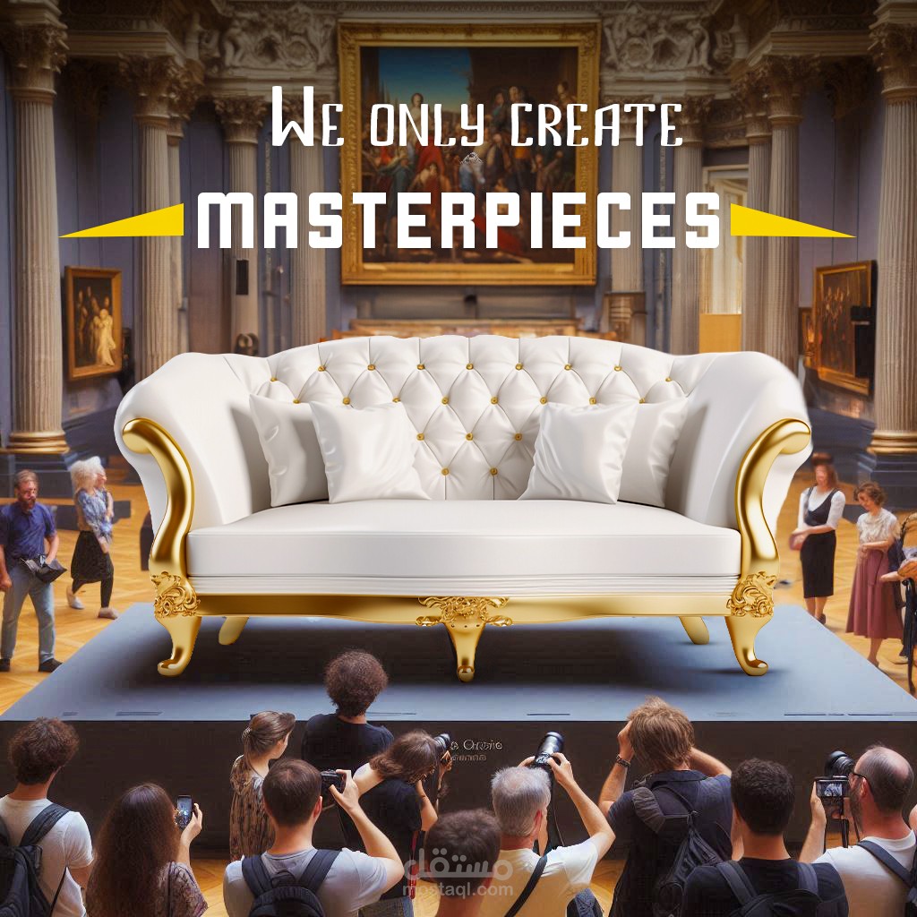A large, ornate, white sofa with gold detailing is centrally positioned on a raised platform, surrounded by a crowd of people. The sofa has tufted upholstery and large, light cream-colored pillows. The gold frame has elaborate carvings and curves, creating a grand and regal appearance. The sofa is situated within a grand, classical-style museum hall, with tall columns and a large artwork on the wall behind it. Many people, various ethnicities, mostly young to middle-aged, are observing the sofa, mostly from a slightly lower angle and taking pictures with cameras. The crowd is positioned around the sofa. The colors are primarily white, gold, and muted tones of gray and beige, reflecting light from the windows in the background. A large text "We only create masterpieces" is visible in a yellow font against the museum background. The perspective is low, showing the crowd and the sofa in proportion, giving a sense of grandeur and a promotional image of the furniture piece. T