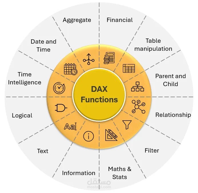 وظائف الجدولة الزمنية (Time Intelligence): مثل TOTALYTD, SAMEPERIODLASTYEAR لتحليل الاتجاهات الزمنية.