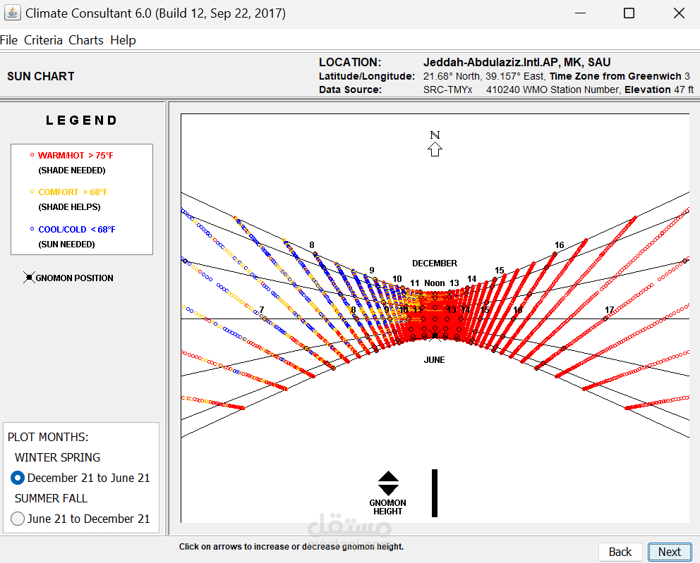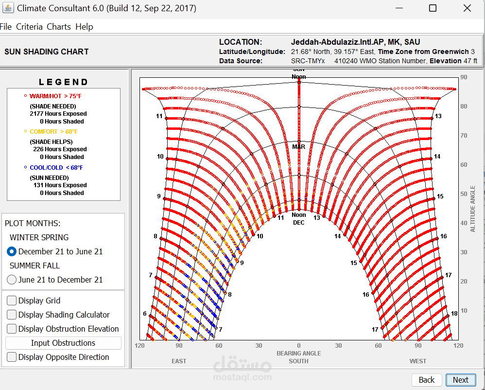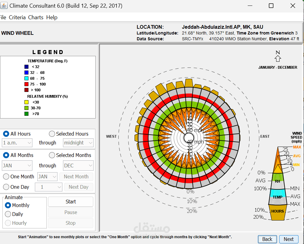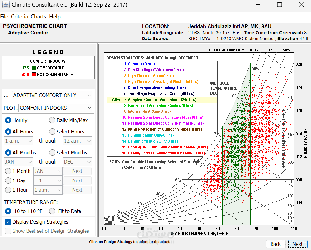 تنفيذ تحليل Climate لاختيار الموقع المناسب لمسجد، حيث يتم تقييم نقاط القوة مثل موقع المشروع، البنية التحتية المتاحة، وحجم الأرض، بالإضافة إلى التحديات القانونية، الازدحام المروري، وتأثير الضوضاء. بناءً على هذا التحليل، يتم تطوير استراتيجيات تصميمية تهدف إلى تحسين الراحة الحرارية، الاستدامة، وإمكانية الوصول، مثل استخدام التهوية الطبيعية، أنظمة التبريد السلبي، وتظليل المساحات الخارجية. بعد اختيار الموقع، يتم تحميل بيانات الطقس في برنامج Climate Consultant 6.0 لتحليل المناخ وفق نموذج الراحة التكيفية ASHRAE 55-2010، مما يساعد في اتخاذ قرارات تصميمية مستدامة، مثل تحسين تدفق الهواء، تقليل استهلاك الطاقة، وتوظيف أنظمة التبريد الطبيعي، مما يضمن بيئة مريحة للمصلين مع تقليل التأثير البيئي والتكاليف التشغيلية.