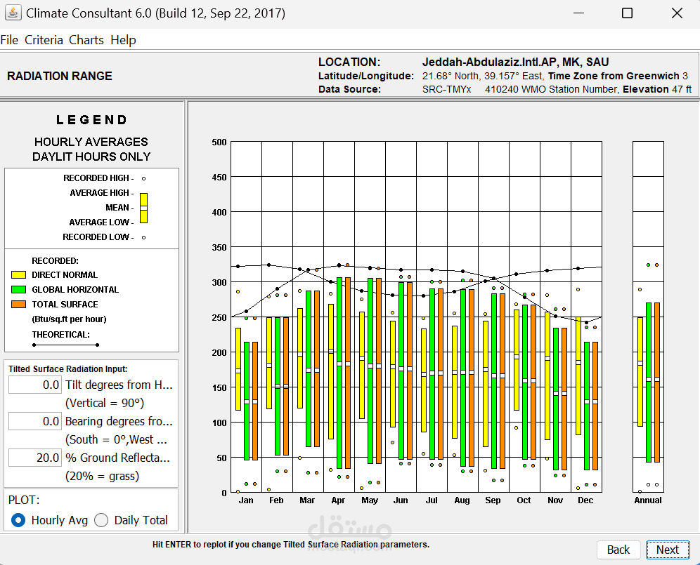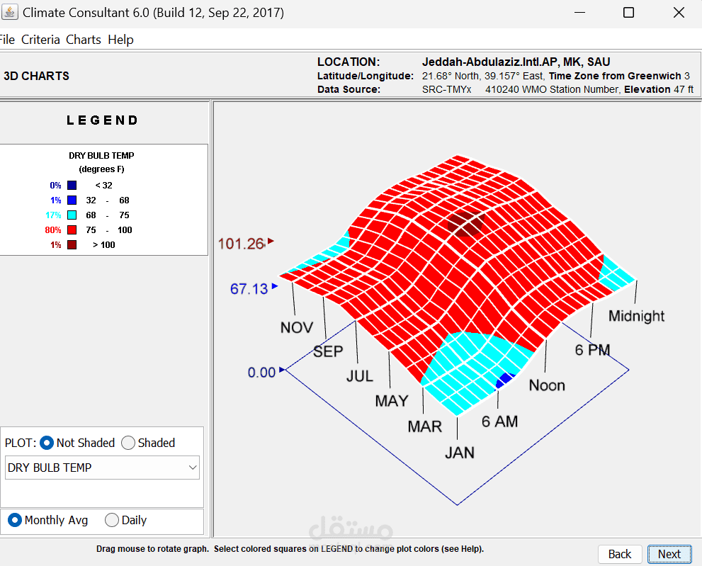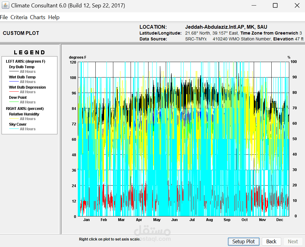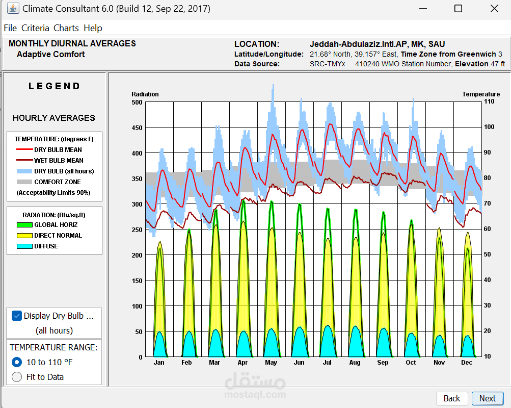 تنفيذ تحليل Climate لاختيار الموقع المناسب لمسجد، حيث يتم تقييم نقاط القوة مثل موقع المشروع، البنية التحتية المتاحة، وحجم الأرض، بالإضافة إلى التحديات القانونية، الازدحام المروري، وتأثير الضوضاء. بناءً على هذا التحليل، يتم تطوير استراتيجيات تصميمية تهدف إلى تحسين الراحة الحرارية، الاستدامة، وإمكانية الوصول، مثل استخدام التهوية الطبيعية، أنظمة التبريد السلبي، وتظليل المساحات الخارجية. بعد اختيار الموقع، يتم تحميل بيانات الطقس في برنامج Climate Consultant 6.0 لتحليل المناخ وفق نموذج الراحة التكيفية ASHRAE 55-2010، مما يساعد في اتخاذ قرارات تصميمية مستدامة، مثل تحسين تدفق الهواء، تقليل استهلاك الطاقة، وتوظيف أنظمة التبريد الطبيعي، مما يضمن بيئة مريحة للمصلين مع تقليل التأثير البيئي والتكاليف التشغيلية.