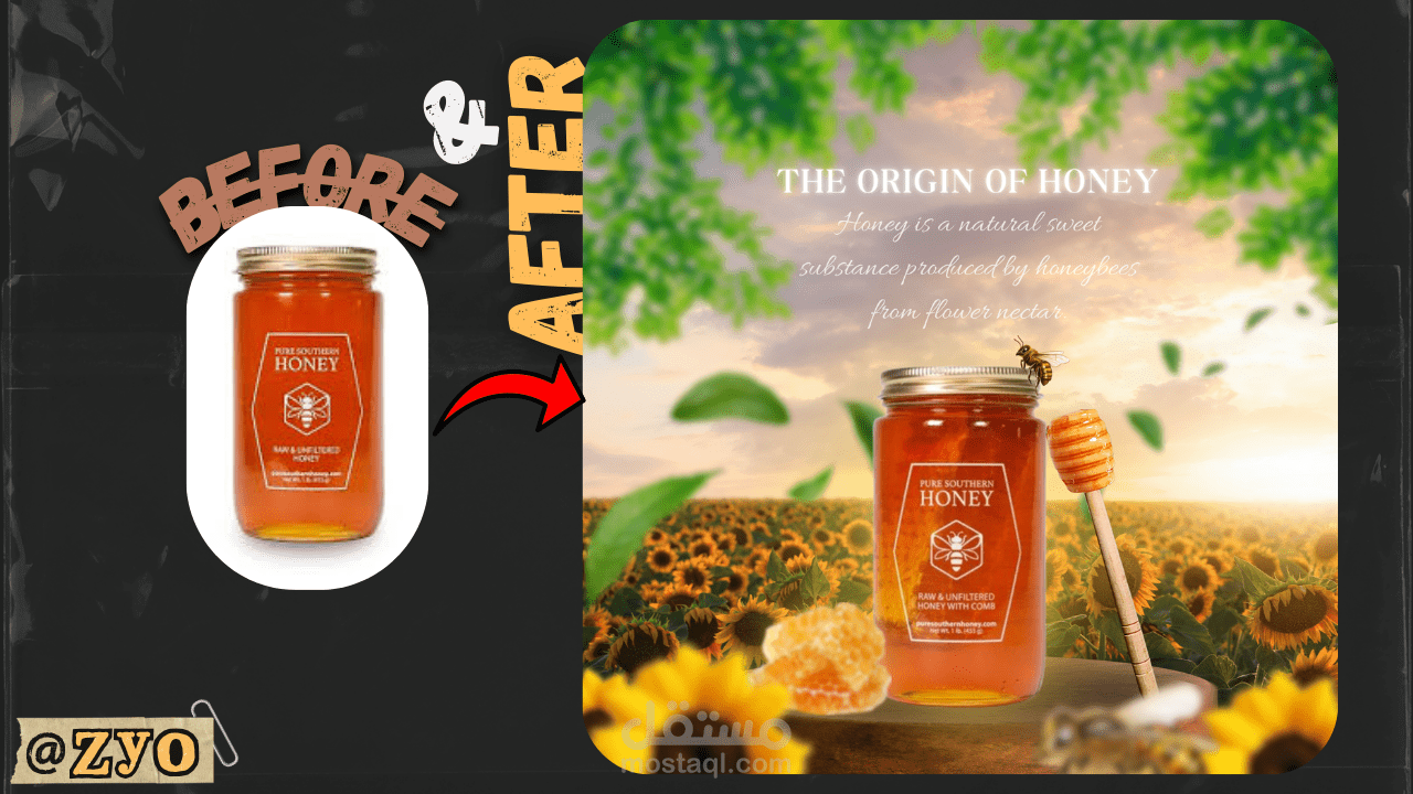 حيث تم استخدام ألوان دافئة مثل الذهبي و ضوء الشمس لإبراز قوام العسل الغني.