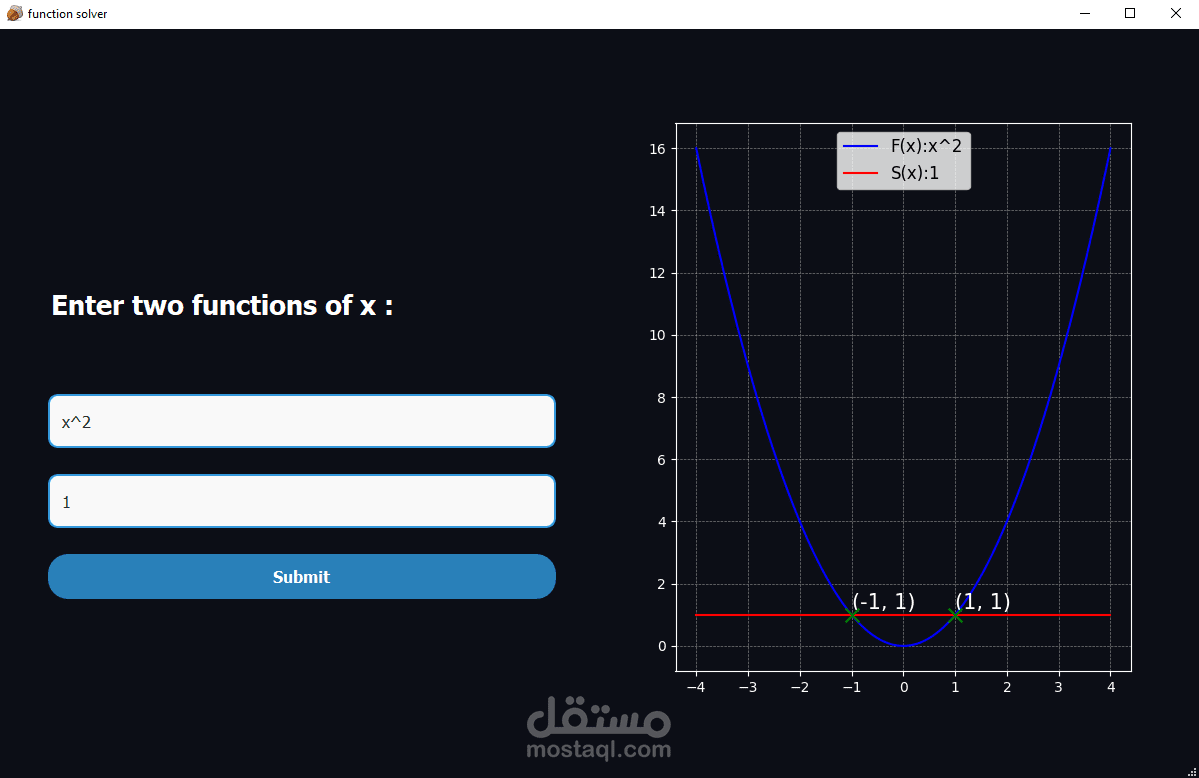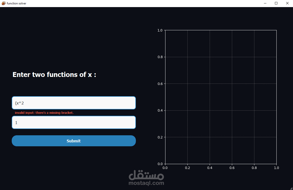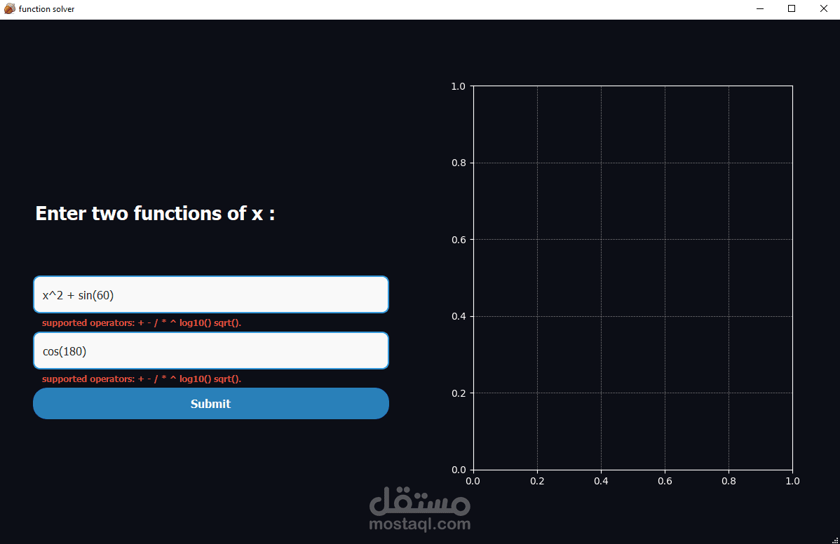 Function Solver is a PySide2-based application designed to solve two user-provided mathematical functions. SymPy for symbolic computation, and Matplotlib for graphical visualization. The UI is built using Qt Designer, and the application is tested using pytest and pytest-qt. While the application is developed using PySide2, the UI components are created using Qt Designer.