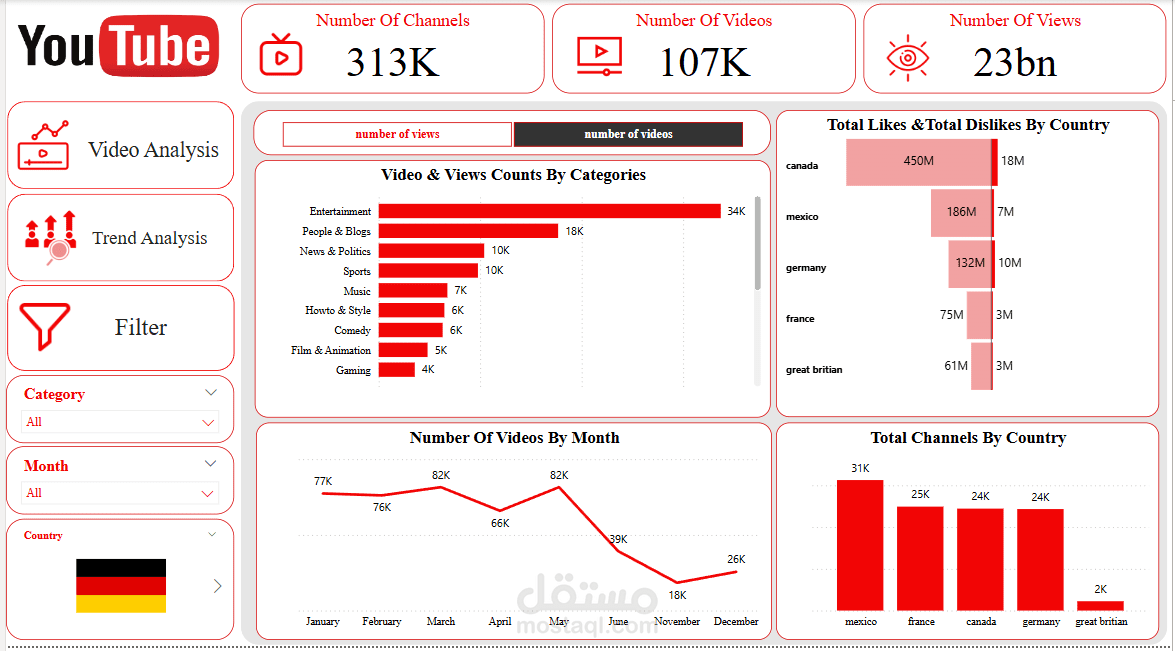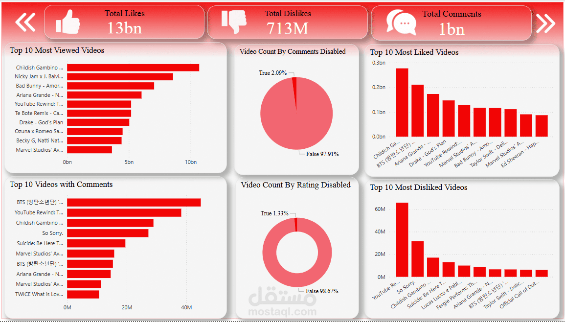 -أخيرًا، قمت بتصميم وبناء ال Dashboard والتي توضح أكثر أنواع الفيديوهات التي تتصدر الترند، العلاقة بين عدد الفيديوهات والزمن، بالإضافة إلى قائمة الفيديوهات الأكثر والأقل مشاهدة، مما يمكّن المستخدمين من فهم الأنماط والاتجاهات بشكل واضح ودقيق لاتخاذ قرارات استراتيجية مدروسة.