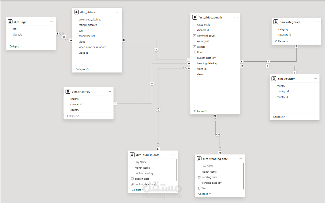 -بعد ذلك، قمت بإضافة أعمدة مخصصة (Custom Column)مثال علي ذلك: إنشاء عمود مفتاح التاريخ (Date Key Column) الذي يعد جزءًا أساسيًا من عملية التحليل. قمت بتقسيم البيانات إلى عدة جداول منفصلة تشمل الفئات (Categories)، التواريخ (Dates)، الفيديوهات (Videos)، القنوات (Channels)، الدول (Countries)، بالإضافة إلى جدول الحقائق (Fact Table).