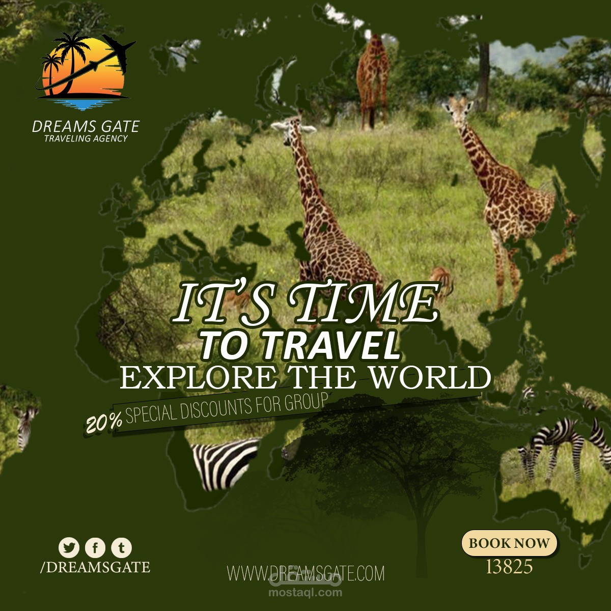 A visually engaging advertisement for Dreams Gate Traveling Agency, designed to inspire travel enthusiasts to explore the world. The ad features a creative world map concept, where wildlife images seamlessly blend with the continents, symbolizing adventure and nature. The earthy green color palette reinforces a connection to nature, making it perfect for promoting safari and eco-tourism. Bold typography highlights the call to action, encouraging travelers with the phrase "It’s Time to Travel – Explore the World", while a 20% special discount for groups adds an incentive for bookings. The agency’s logo, website, and contact details are clearly positioned to enhance brand identity and accessibility. This ad effectively captures the essence of adventure, exploration, and exclusive travel experiences, making it an eye-catching and persuasive promotional piece