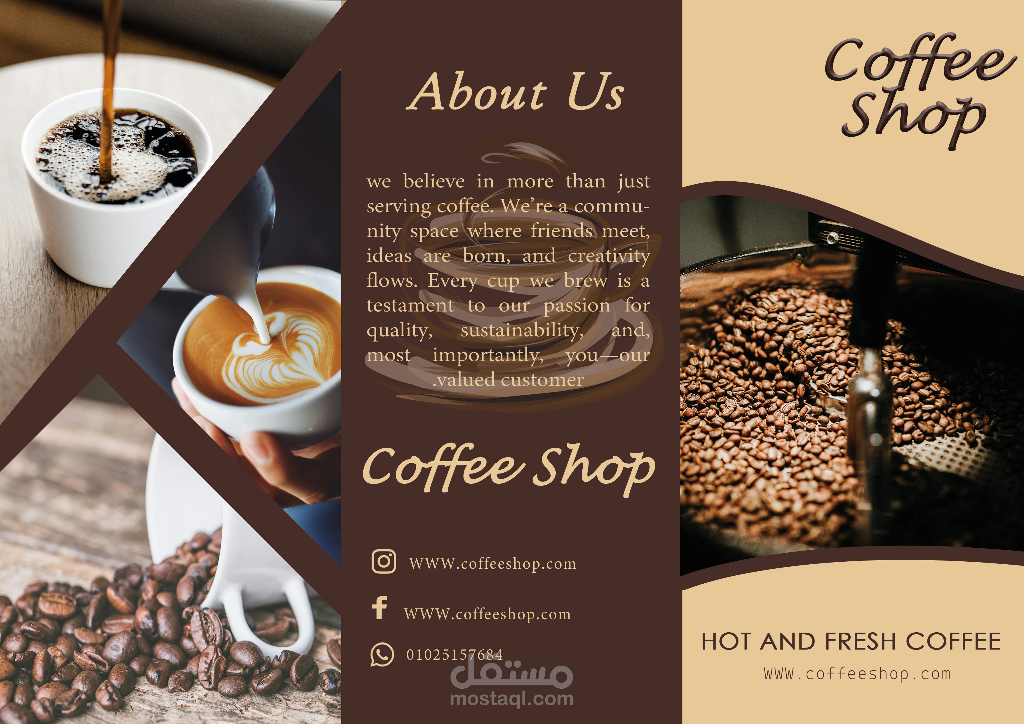 يعتمد التصميم على تنسيق أنيق ومنظم يسهل قراءة الأصناف والأسعار، مع تقسيم واضح للأقسام مثل المشروبات الساخنة، الباردة، الحلويات، والإضافات. تم استخدام ألوان دافئة تتناسب مع أجواء القهوة مثل درجات البني، البيج، والأسود، مما يعكس الإحساس بالدفء والراحة. بروشور
