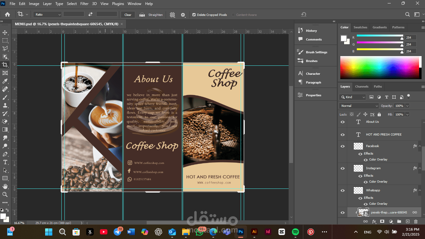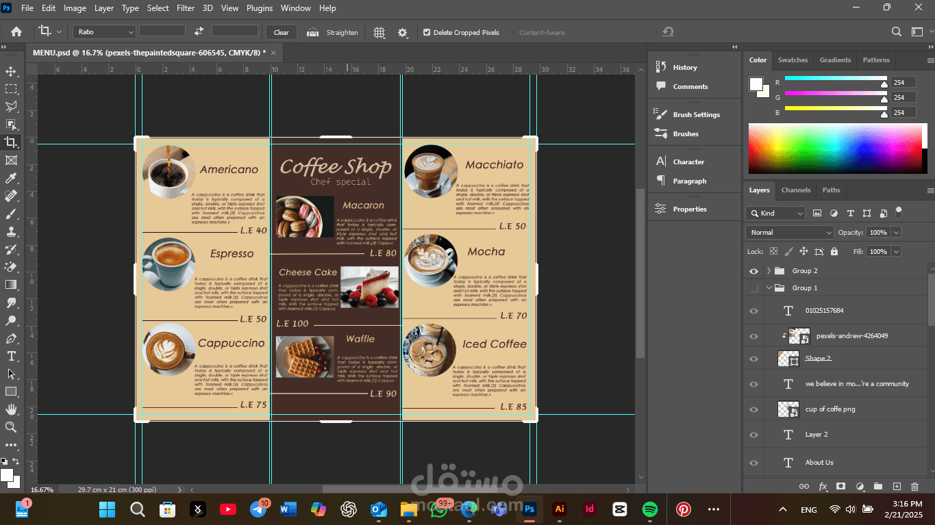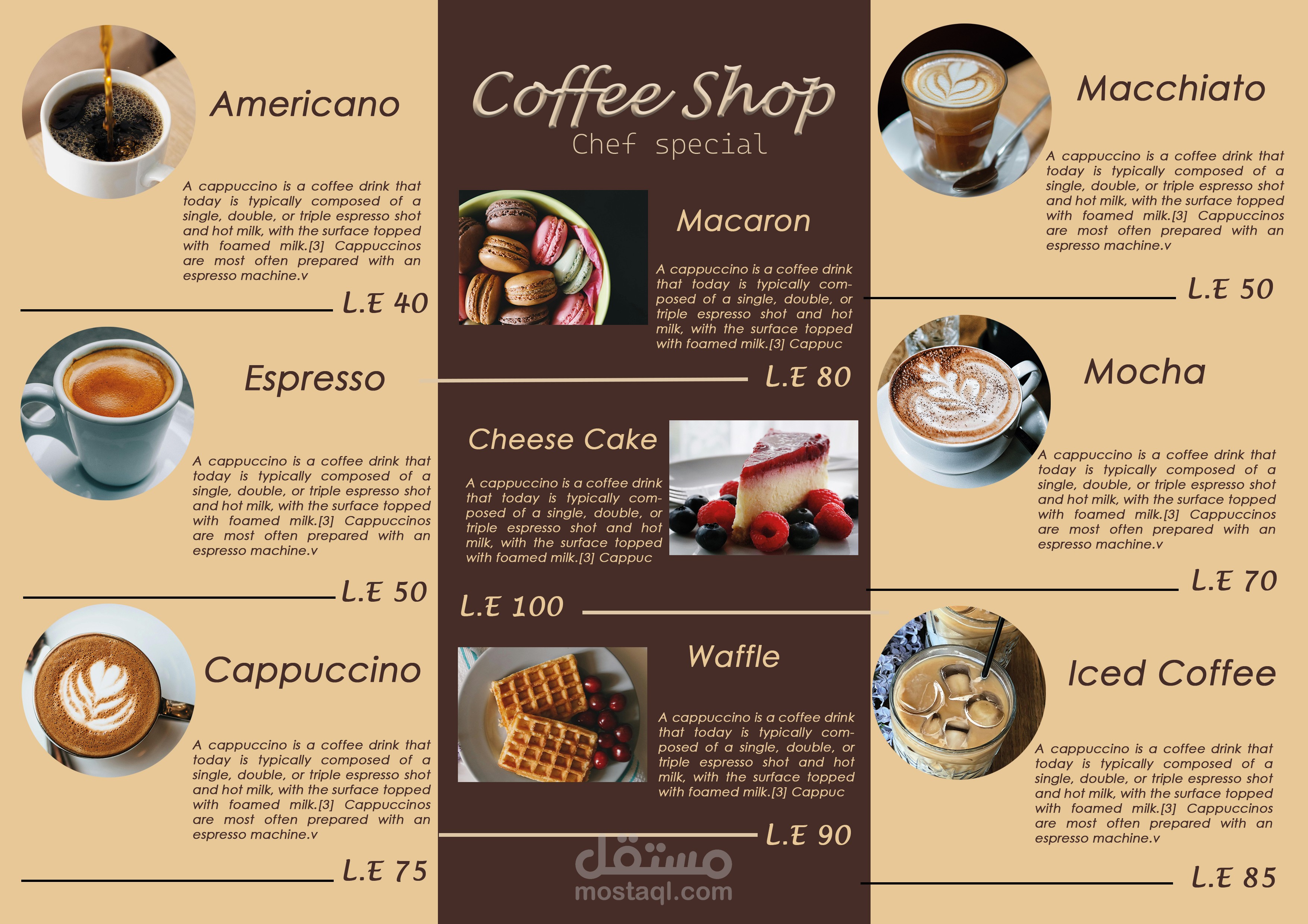 هذا التصميم هو منيو (قائمة طعام ومشروبات) لكوفي شوب، تم تنفيذه باستخدام Adobe Photoshop بأسلوب عصري وجذاب يعكس هوية المقهى ويجعل تجربة العملاء أكثر متعة.