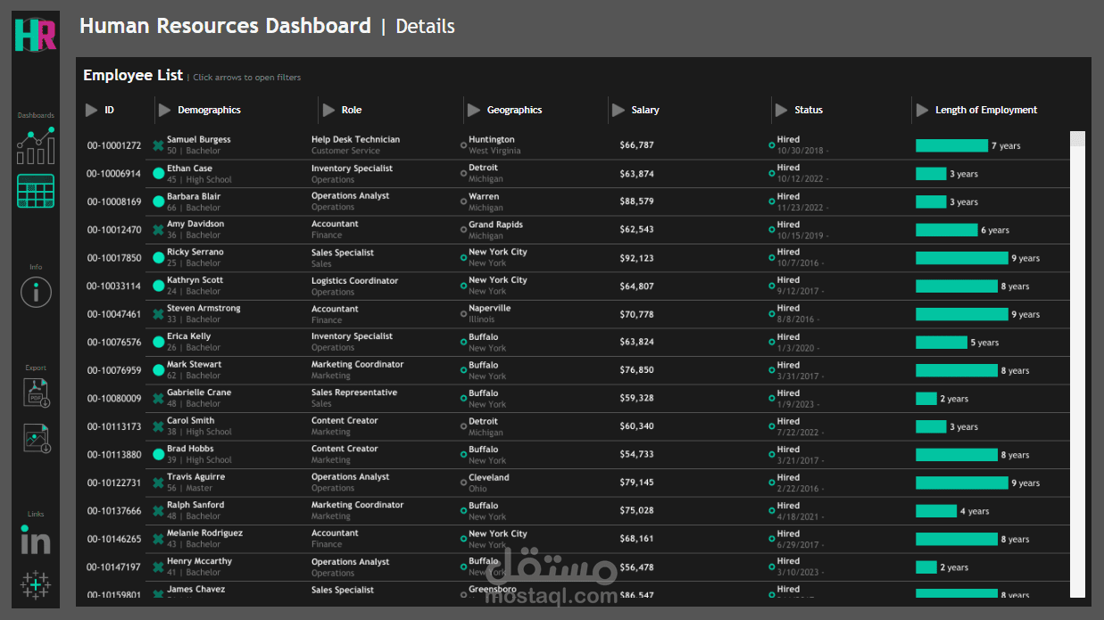 لحل مشكلة عدم وجود أداة مركزية لفريق الموارد البشرية لتحليل مقاييس القوى العاملة، قمت بتصميم وتطوير لوحة تحكم تفاعلية باستخدام Tableau تحتوي على نظرات عامة (نظرة عامة، التركيبة السكانية، تحليل الدخل) وسجلات موظفين تفصيلية مع إمكانيات التصفية، مما مكّن مدير الموارد البشرية من الحصول على رؤى قابلة للتنفيذ حول اتجاهات التوظيف، تكوين القوى العاملة، وأنماط الرواتب لتحسين التخطيط الاستراتيجي والكفاءة التشغيلية.