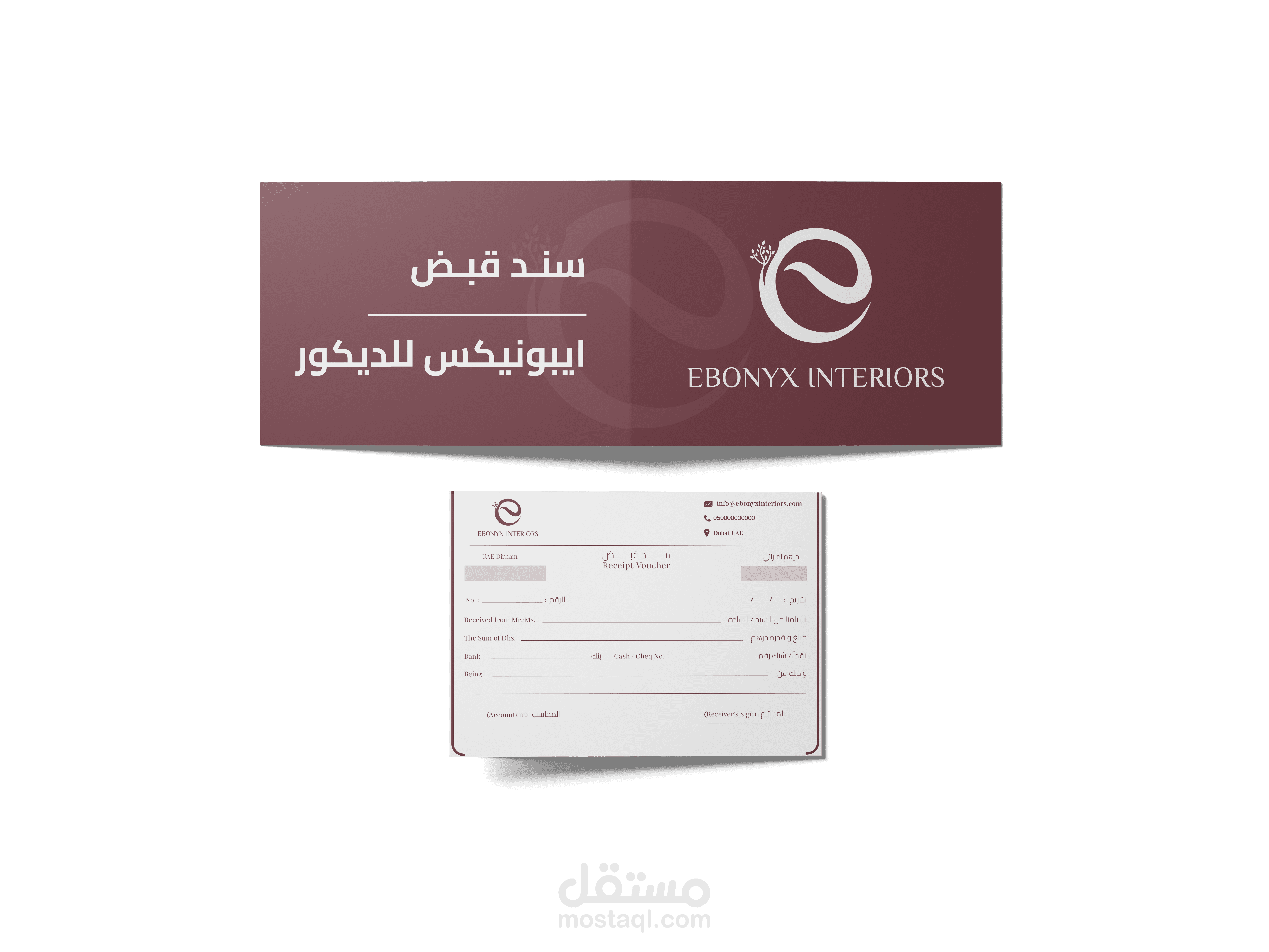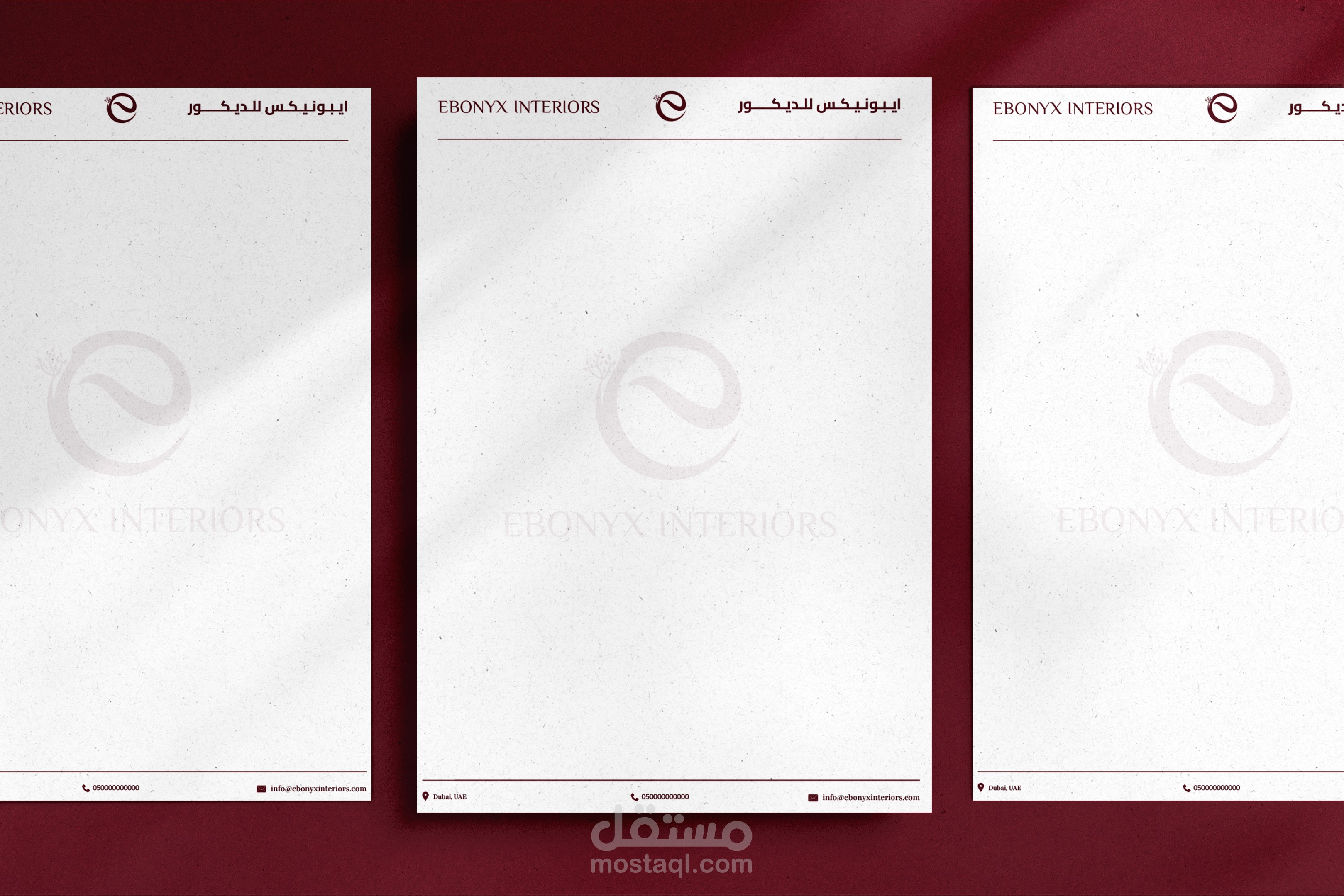 4- اختيار الخطوط: تم اختيار خط عصري وأنيق يناسب طبيعة شركة EBONYX INTERIORS التي تقدم تصاميم داخلية راقية. كان الخط المختار سلسًا وواضحًا، مع إضافة بعض اللمسات الرفيعة في العناوين لزيادة التميز. تم الحرص على جعل الخطوط مرنة وسهلة القراءة مع الحفاظ على لمسة من الفخامة.