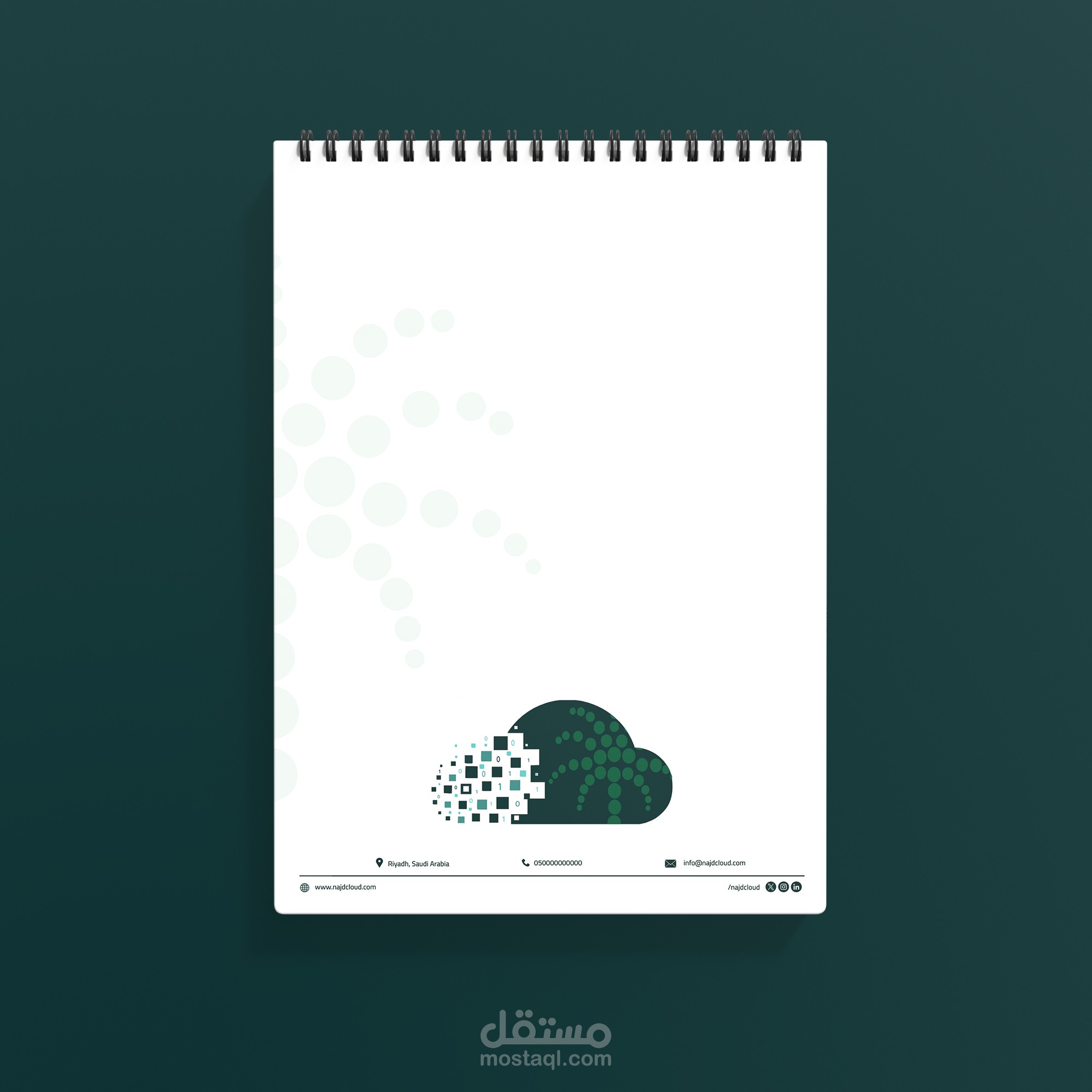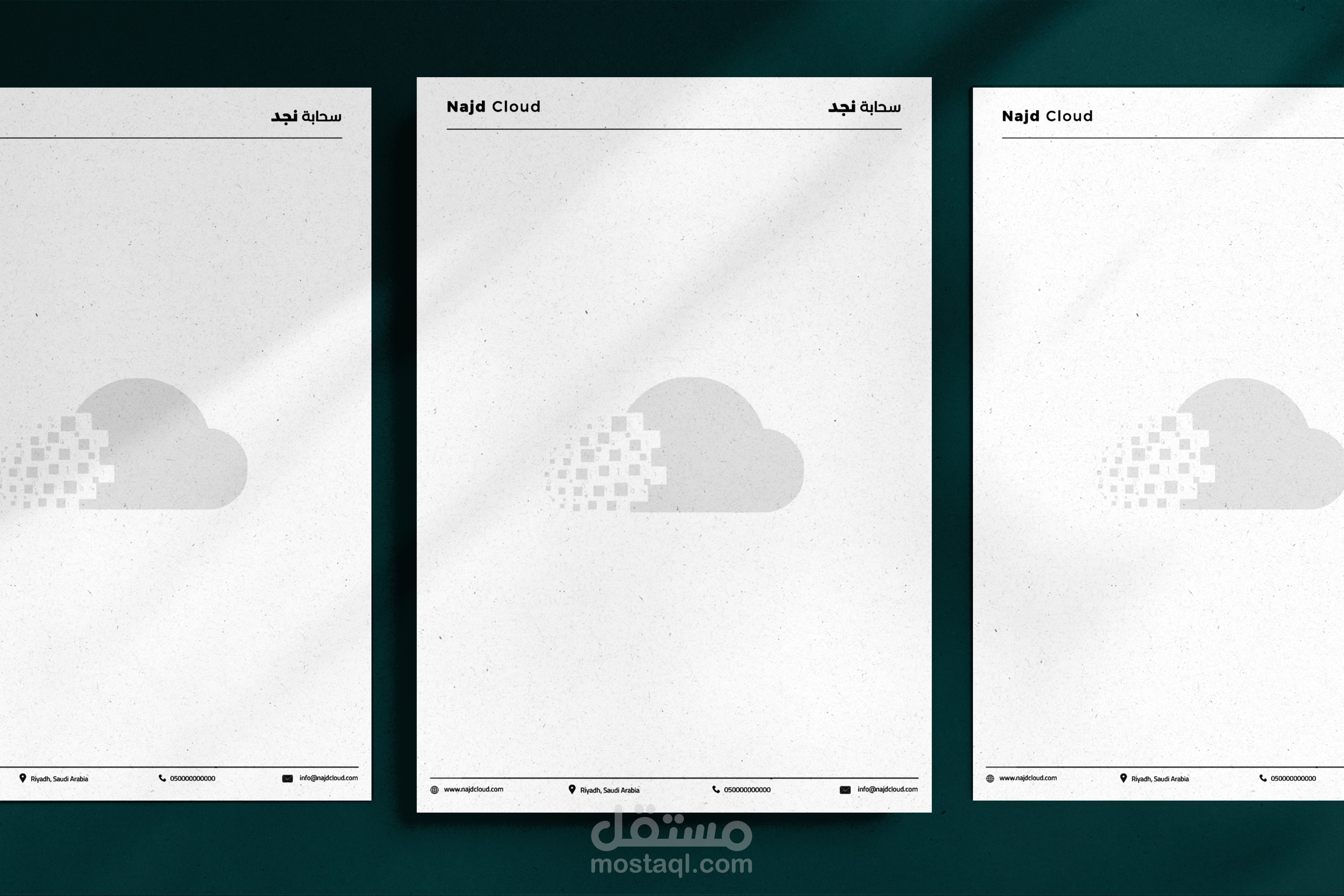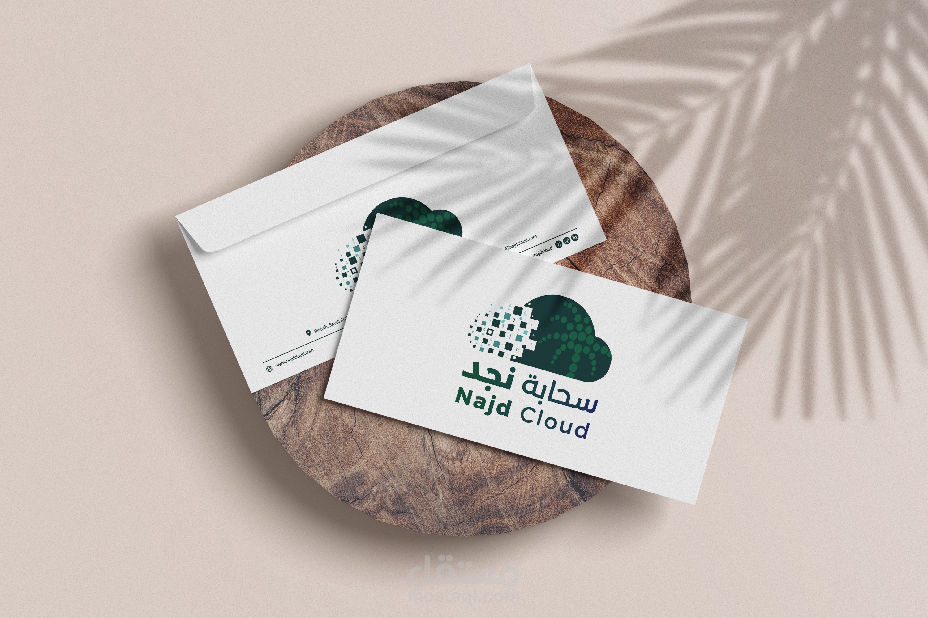 3- تطوير عناصر الهوية البصرية: بناءً على الشعار، قمنا بتطوير عناصر الهوية البصرية التي تتناسب مع شخصية "Najd Cloud" وتعكس استراتيجيتها في تقديم حلول سحابية موثوقة. هذه العناصر تضمنت: