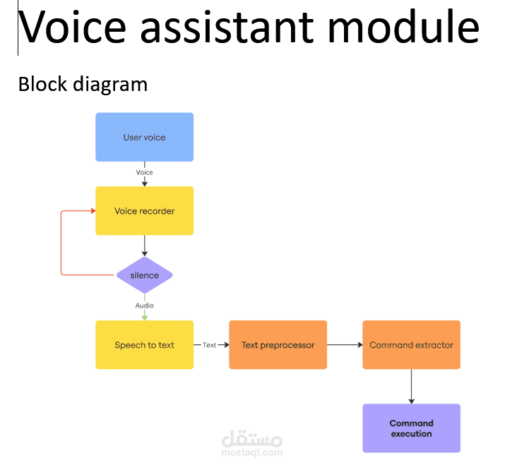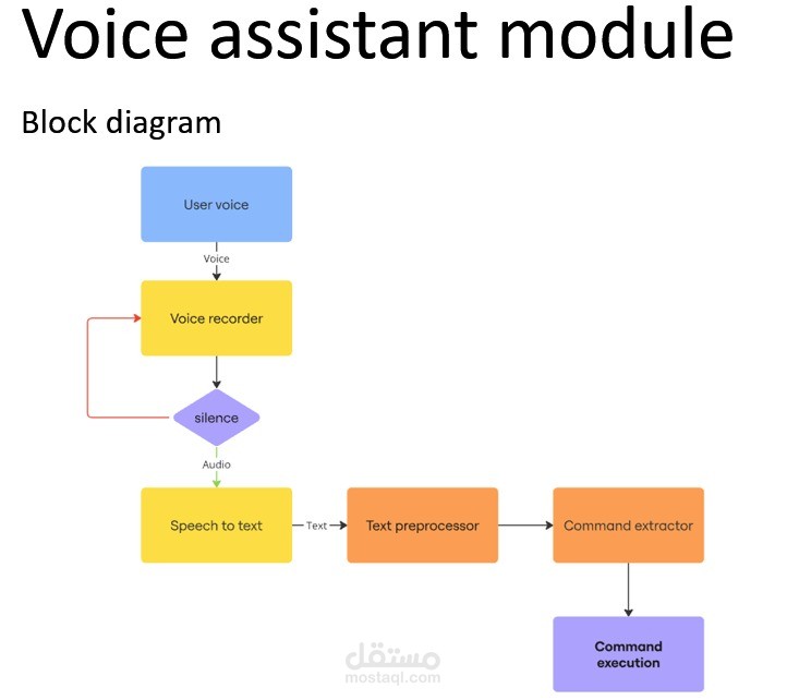 This project presents a voice-controlled smart home assistant designed to execute user commands efficiently. The system follows a structured voice processing pipeline, ensuring accurate command recognition and execution.