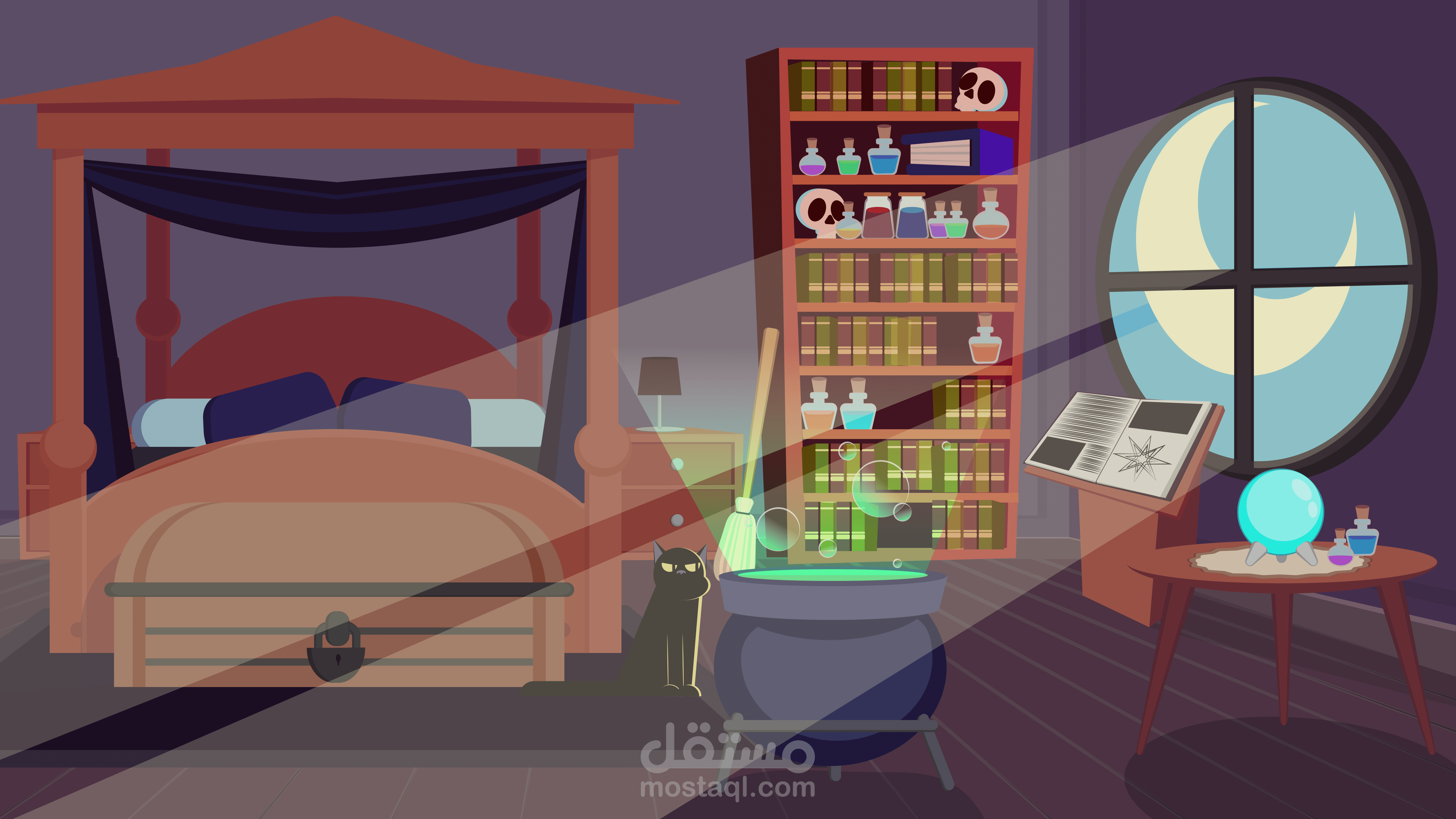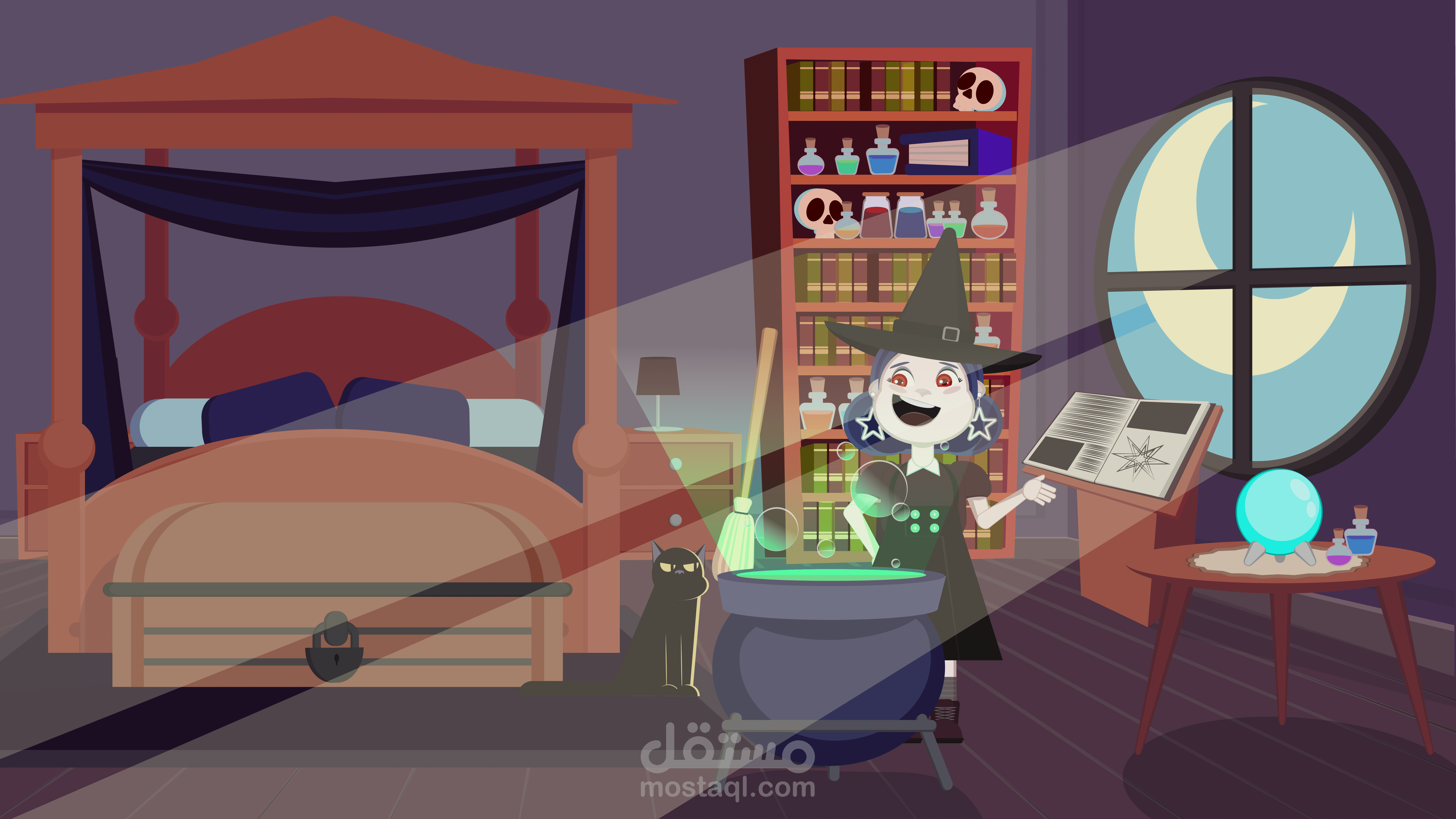 الألوان: استخدام ألوان هادئة ومتناسقة، مع التركيز على اللون الأسود لإبراز طابع الساحرة، واللون الأبيض لإضافة لمسة من النقاء.