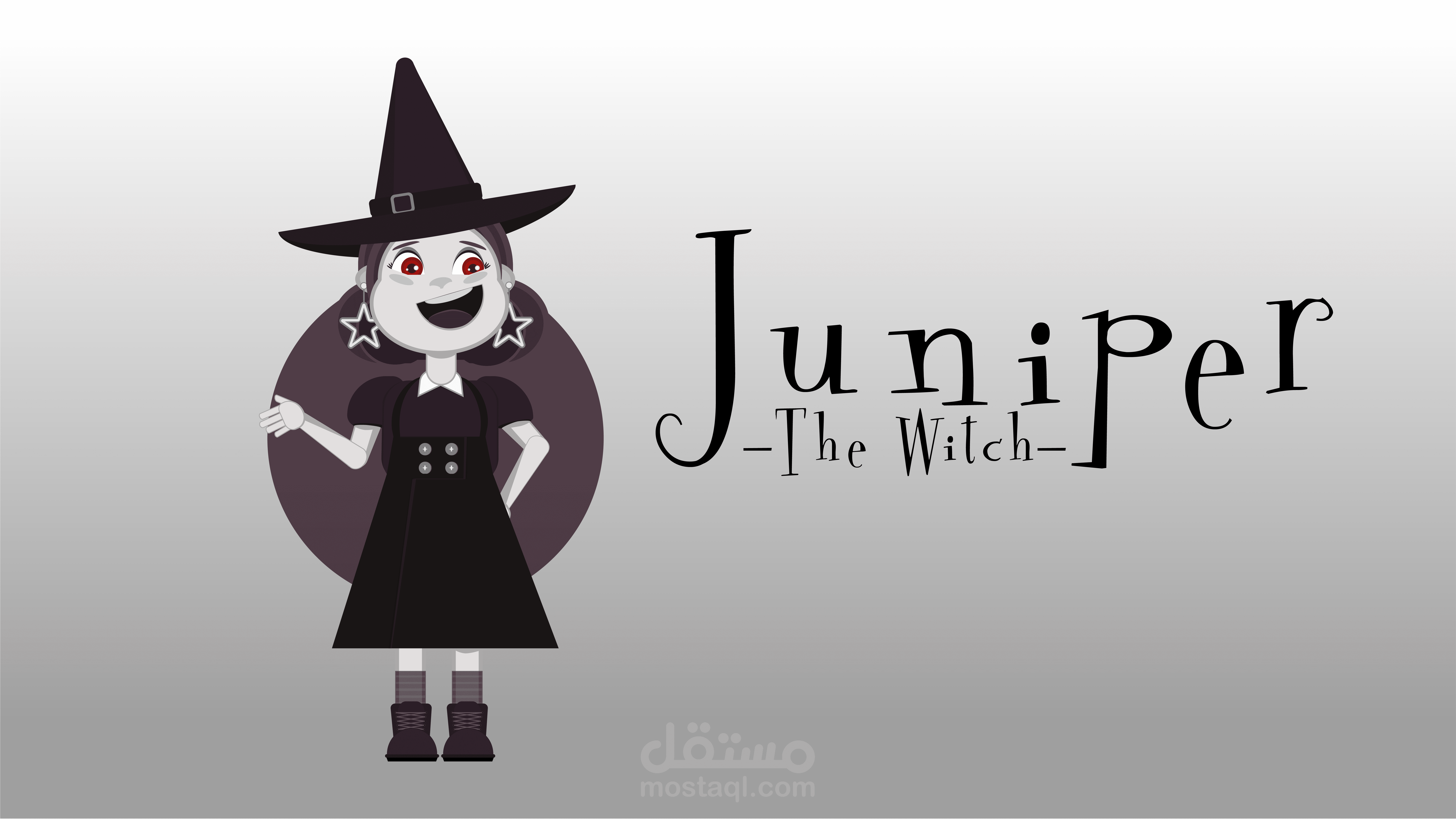 -الشخصية الرئيسية: تصميم لشخصية جونيبر بملامح وجه بريئة وعيون واسعة، ترتدي قبعة ساحرة سوداء وفستانًا أسود بسيطًا.