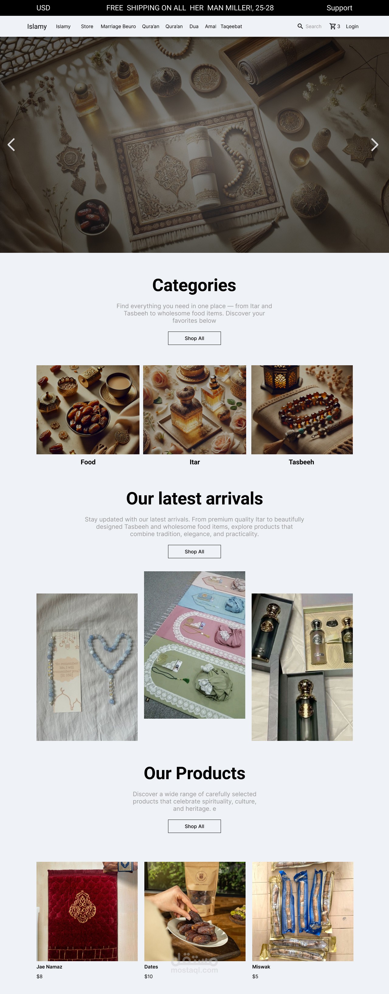 إسلامي هو تصميم أنيق لمتجر إلكتروني يجمع بين الروحانية والتقاليد والحداثة، مما يخلق تجربة تسوق سلسة وغامرة. يتميز التصميم بتنسيق نظيف وجذاب بصريًا، مما يضمن للمستخدمين سهولة استكشاف وشراء المنتجات التي تعكس هويتهم الدينية والثقافية. تبدأ الصفحة الرئيسية بقسم رئيسي مصمم بعناية، يرحب بالزوار ويوفر لهم تجربة تصفح مريحة وأنيقة منذ اللحظة الأولى.