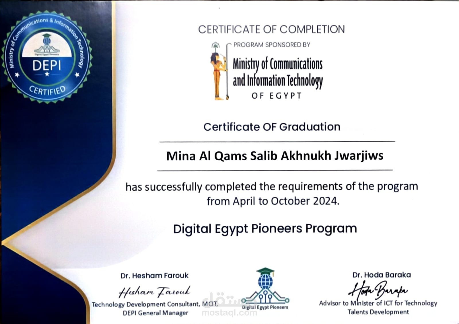 This Certificate of Completion is awarded to Mena El Komos Saleeb Akhnoukh Gwargious for successfully completing the Digital Arts - UI & UX Web Designer track. This certification acknowledges proficiency in user interface (UI) and user experience (UX) design, covering essential skills such as wireframing, prototyping, usability testing, and web design principles.
