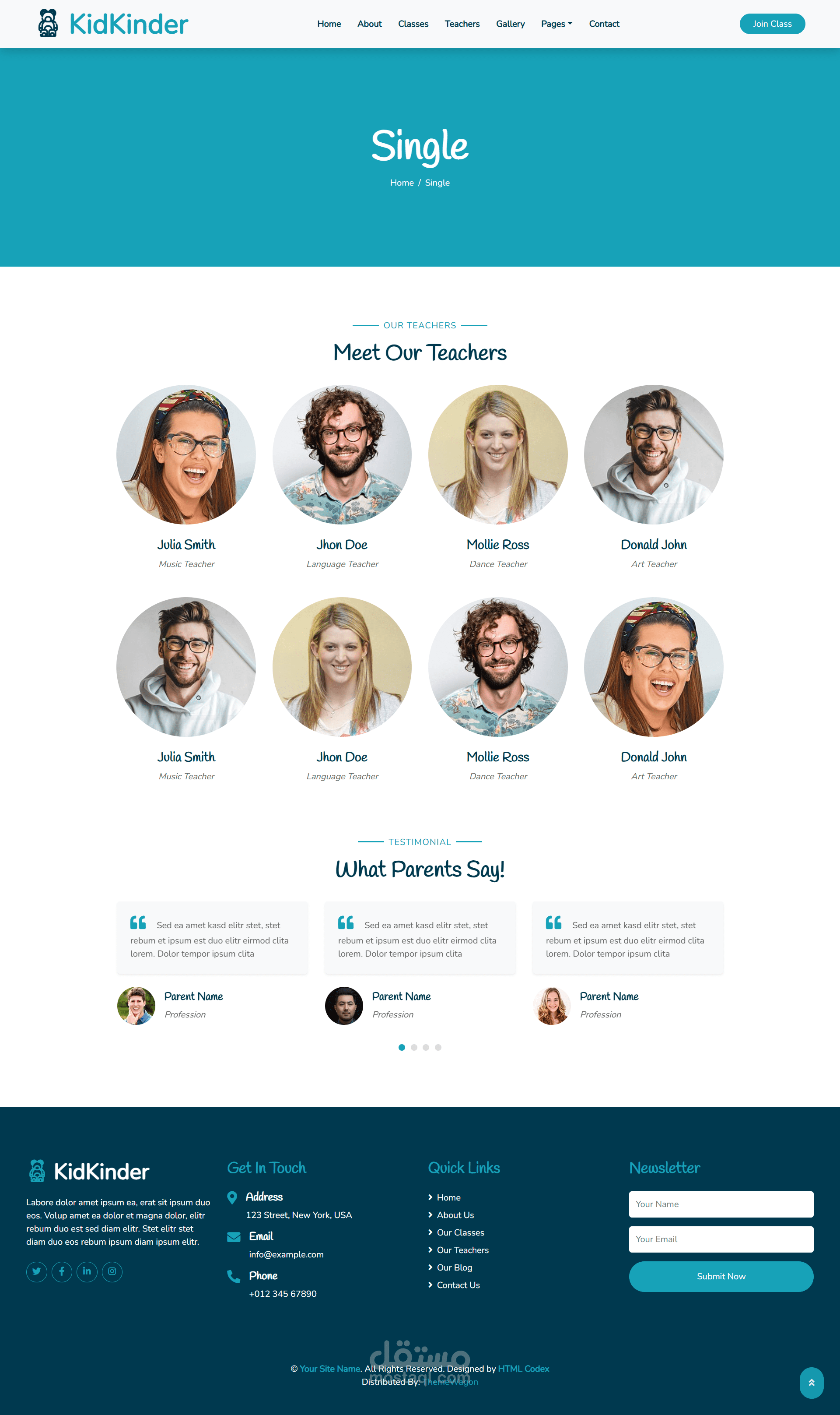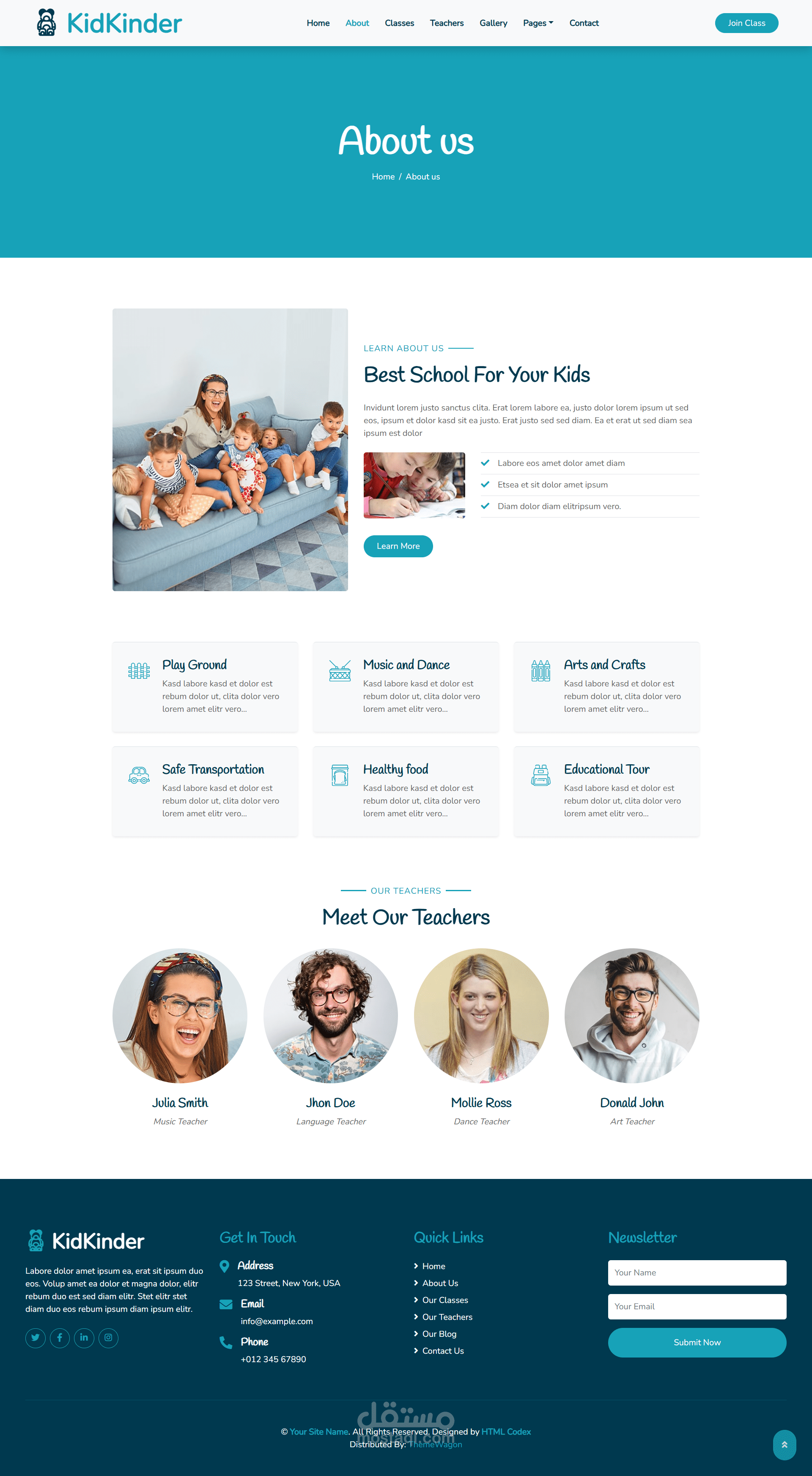 فريق المعلمين: يعرض معلومات عن المعلمين المؤهلين في مجالات مختلفة مثل الموسيقى واللغة والرقص والفن، مع صورهم ووصف مختصر عن خبراتهم.