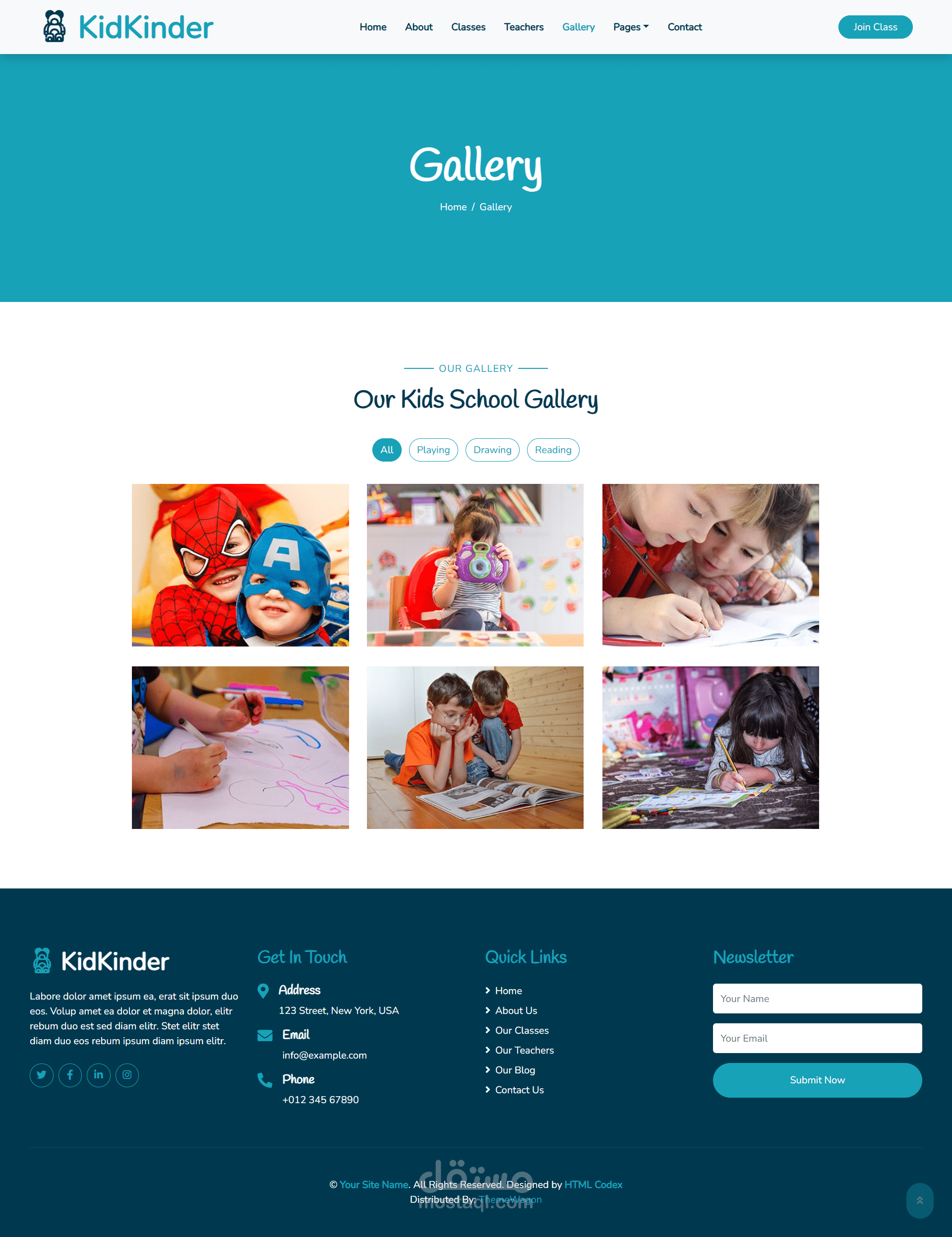 معرض الصور: يعرض أنشطة الأطفال في المدرسة مثل الرسم والقراءة واللعب، مع إمكانية تصنيف الصور حسب النشاط.
