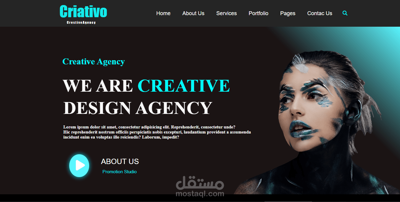 يحتوي على أقسام: About Us، Portfolio، Services، و Contact Us.