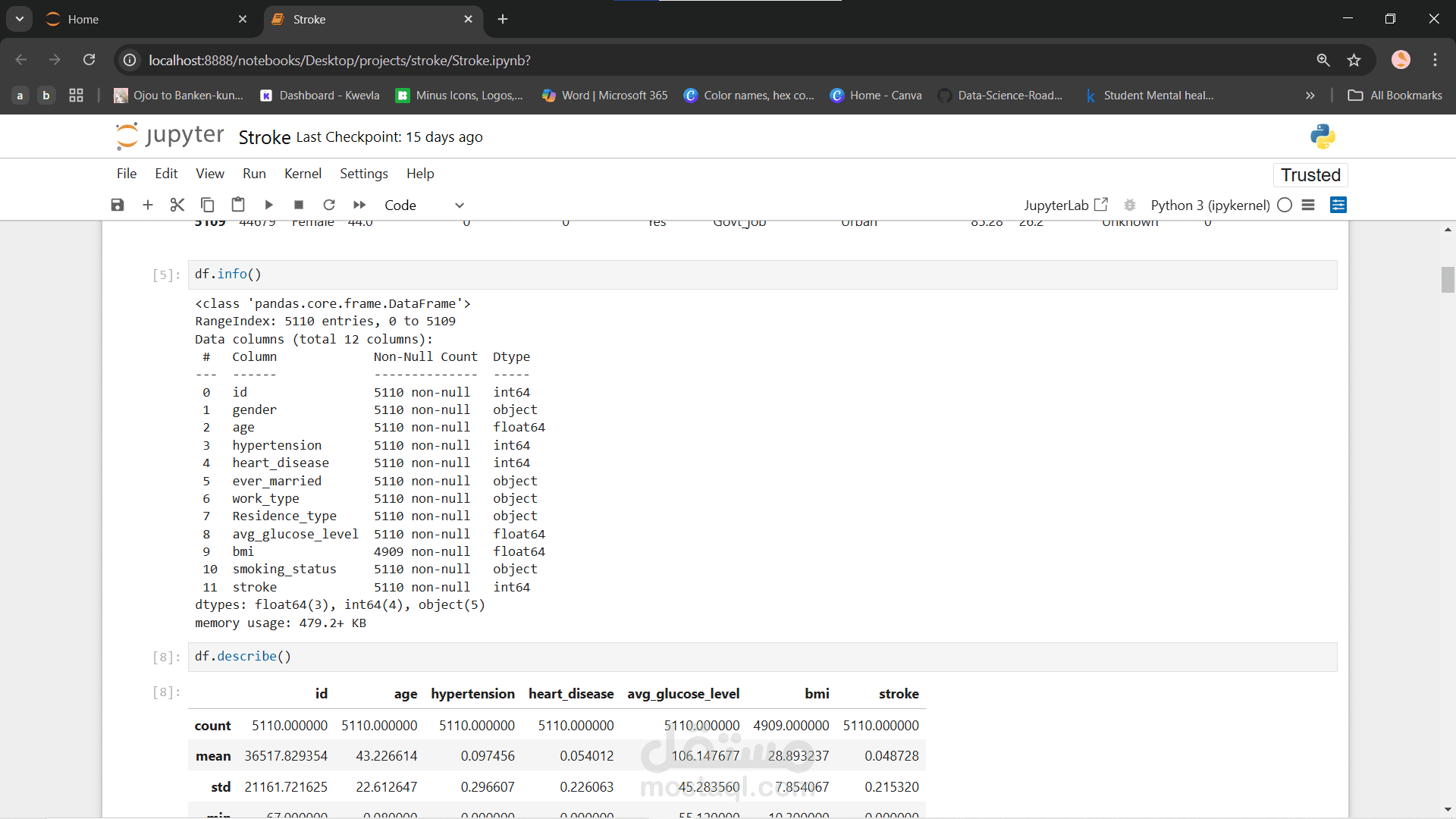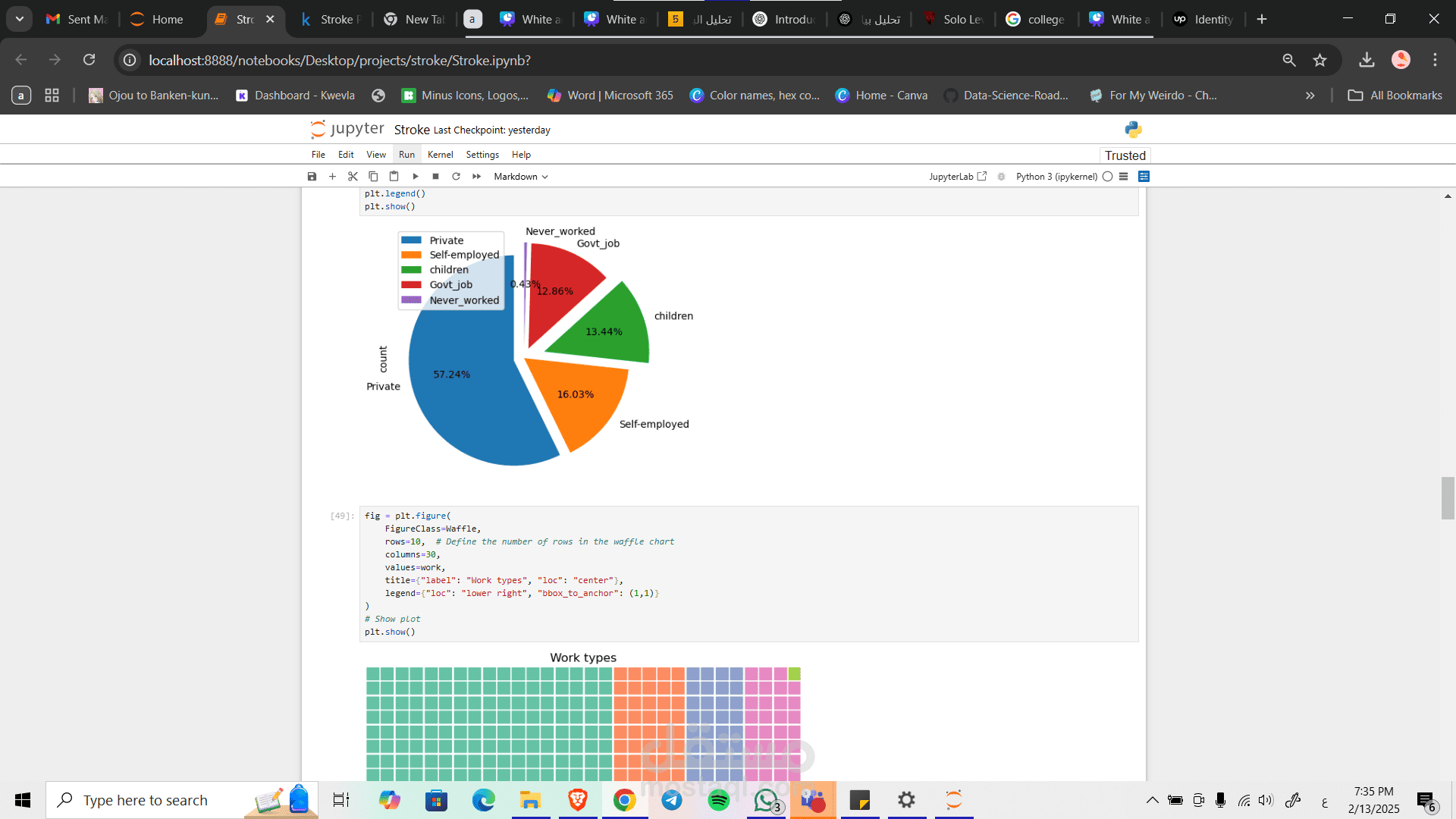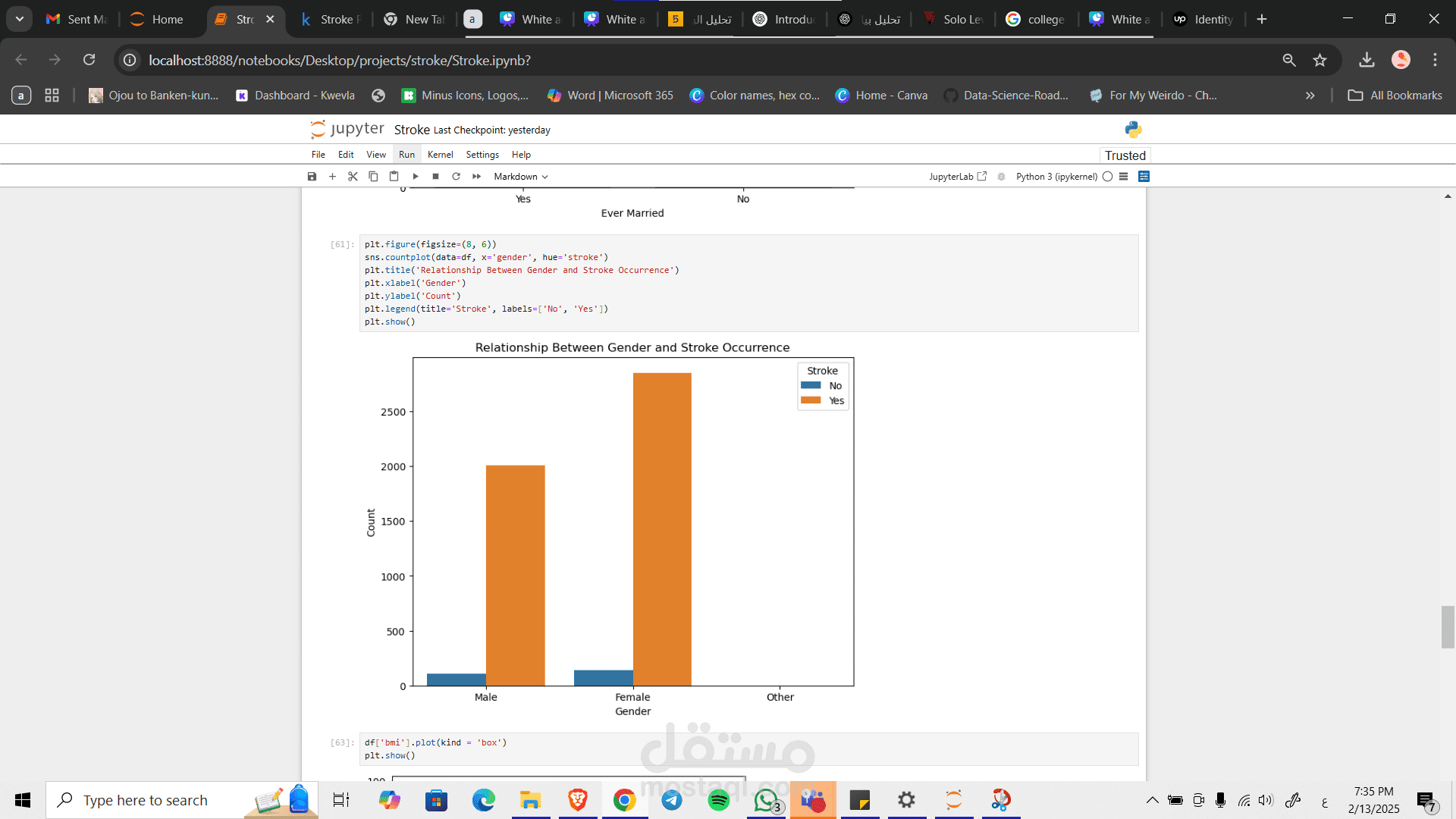 في هذا المشروع تم العمل لى مجموعة بيانات تخص الحالة الصحية للفرد ان كان لديه سكتة دماغية ام لا وعلاقة هذا بالسن و الحالة الاجتماعة و اشياء اخرى لكي نستطيع ان نتنباء حصول شخص على سكتة دماغية ام لا ونسبتها