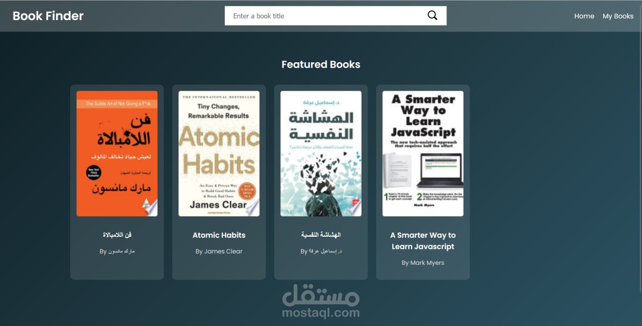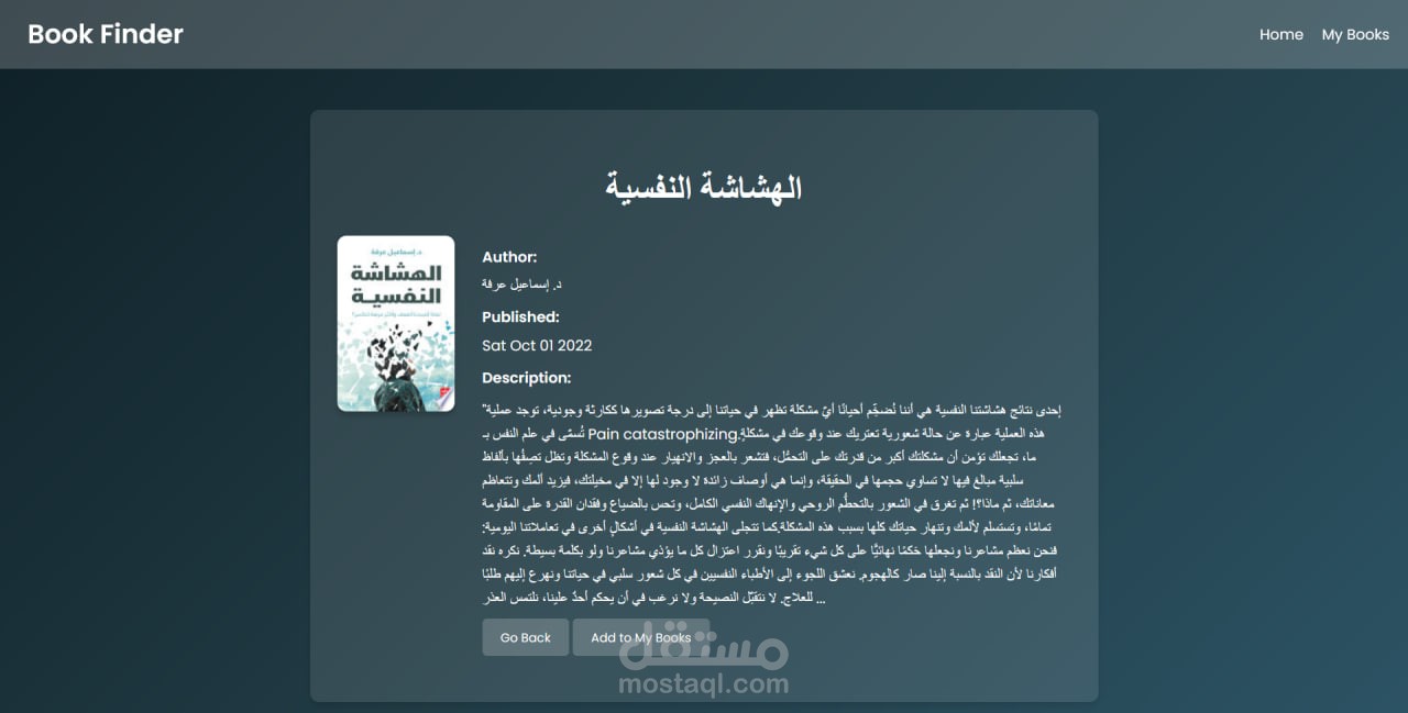 تطبيق ويب متكامل يساعد المستخدمين في البحث عن الكتب وعرض تفاصيلها مثل العنوان، المؤلف، الغلاف، وتاريخ النشر. يعتمد التطبيق على Google Books API لجلب البيانات ويتيح للمستخدمين إضافة الكتب إلى قائمة القراءة الخاصة بهم، مع إمكانية إدارتها لاحقًا. يتميز بواجهة جذابة وسهلة الاستخدام تدعم اللغتين العربية والإنجليزية.