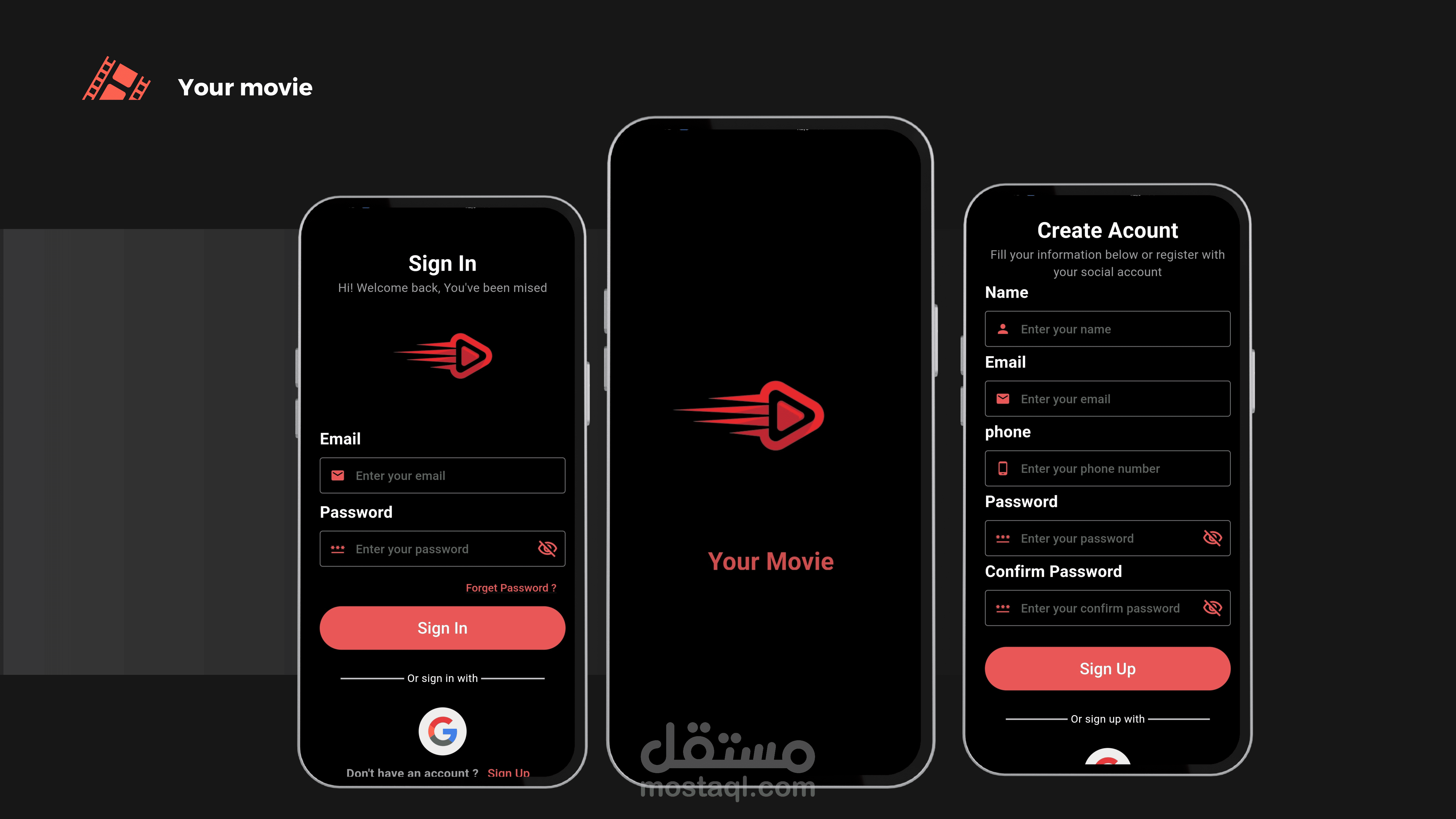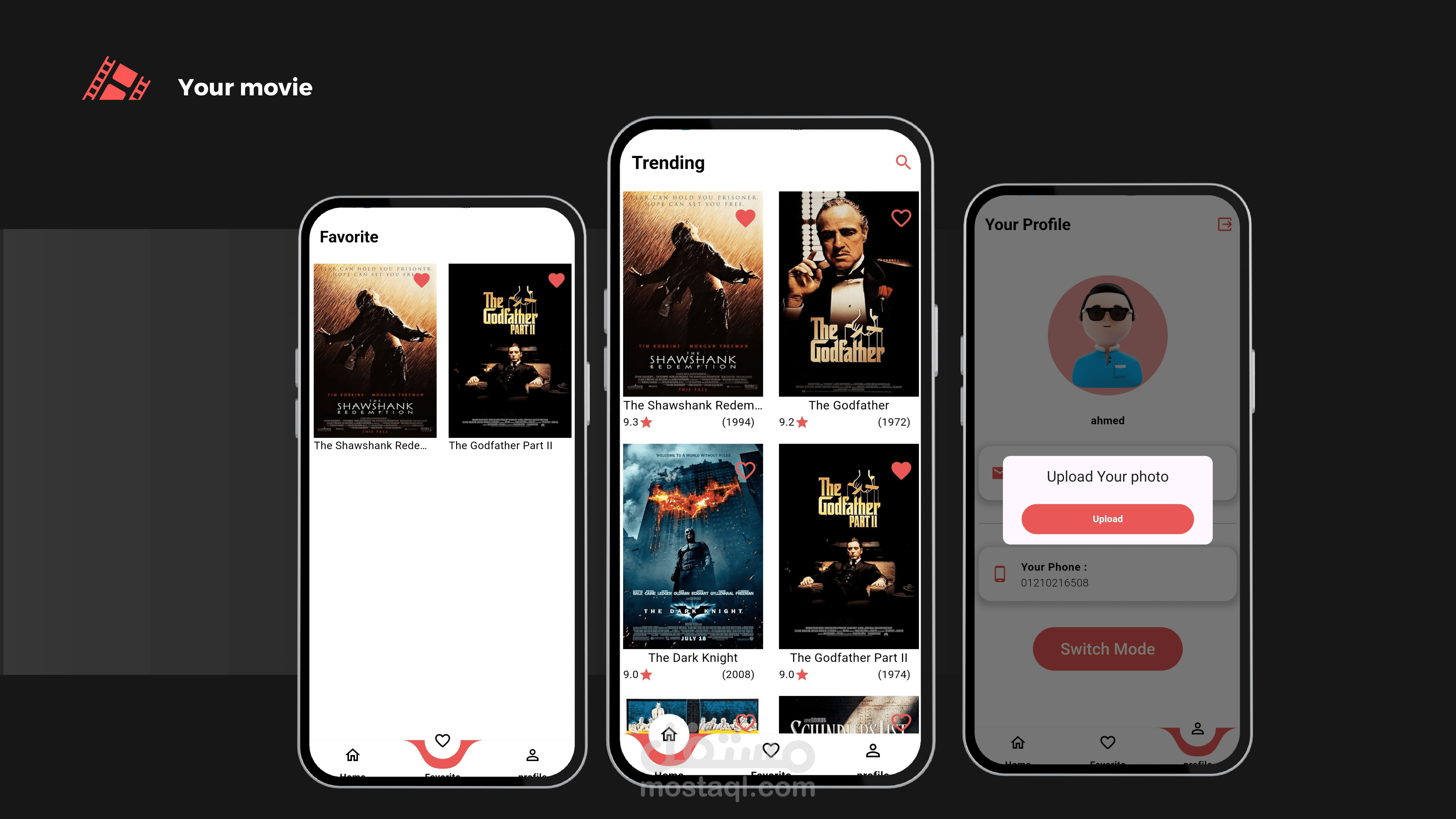 تطوير تطبيق أفلام (Movie App) متكامل باستخدام Flutter، حيث يتميز التطبيق بواجهة مستخدم جذابة وسهلة الاستخدام مع دعم كامل للوضع الليلي والنهاري (Dark Mode & Light Mode).