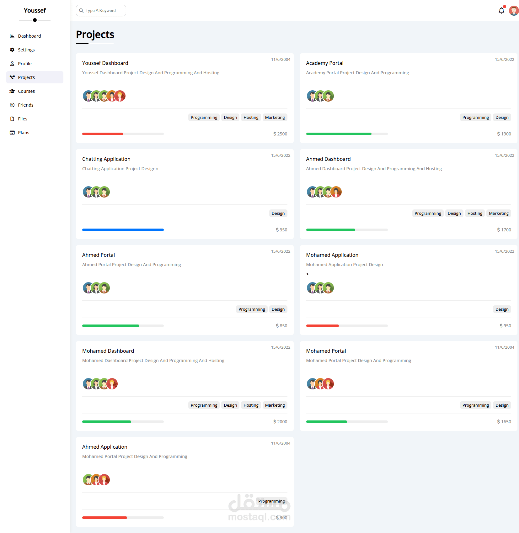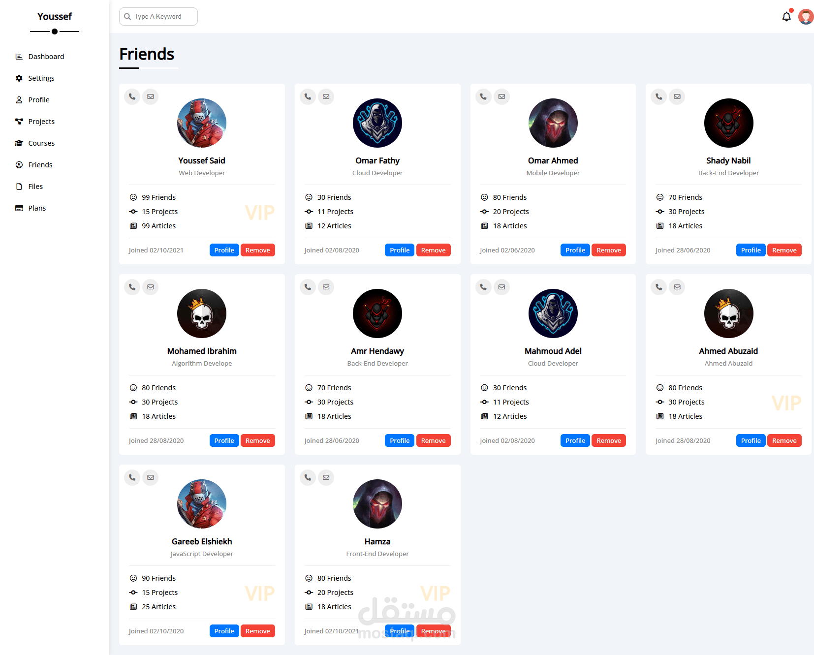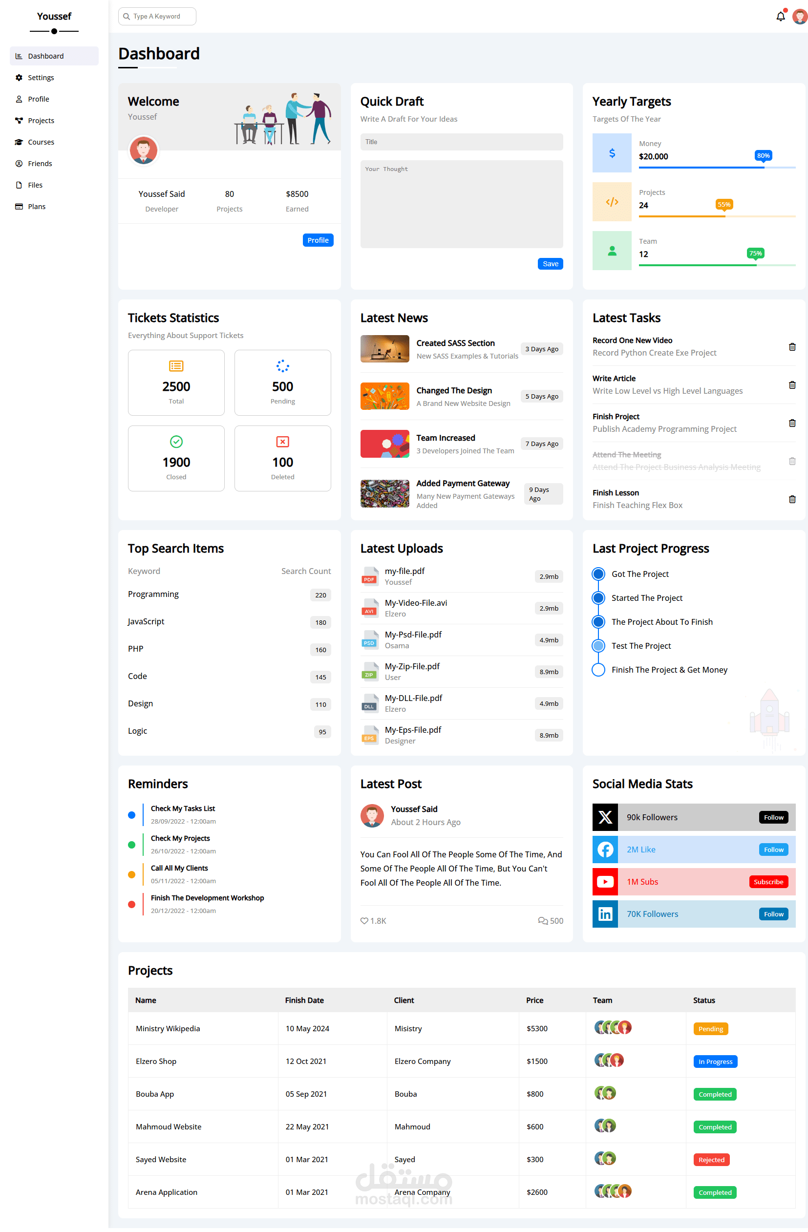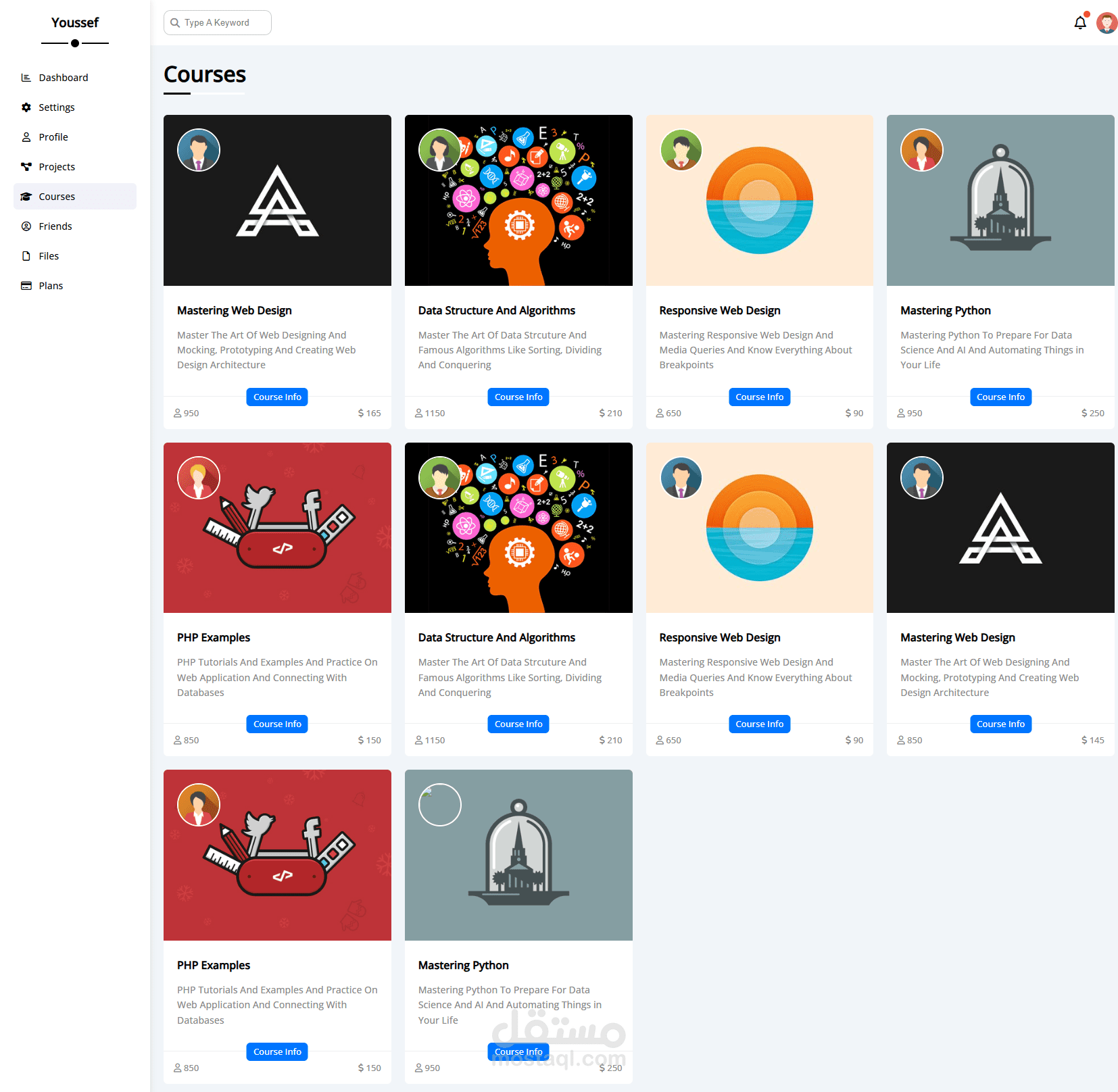صفحات متعددة: يحتوي على عدة صفحات مثل الرئيسية، الأصدقاء، المشاريع، الدورات، الخطط، الإعدادات، والملف الشخصي.