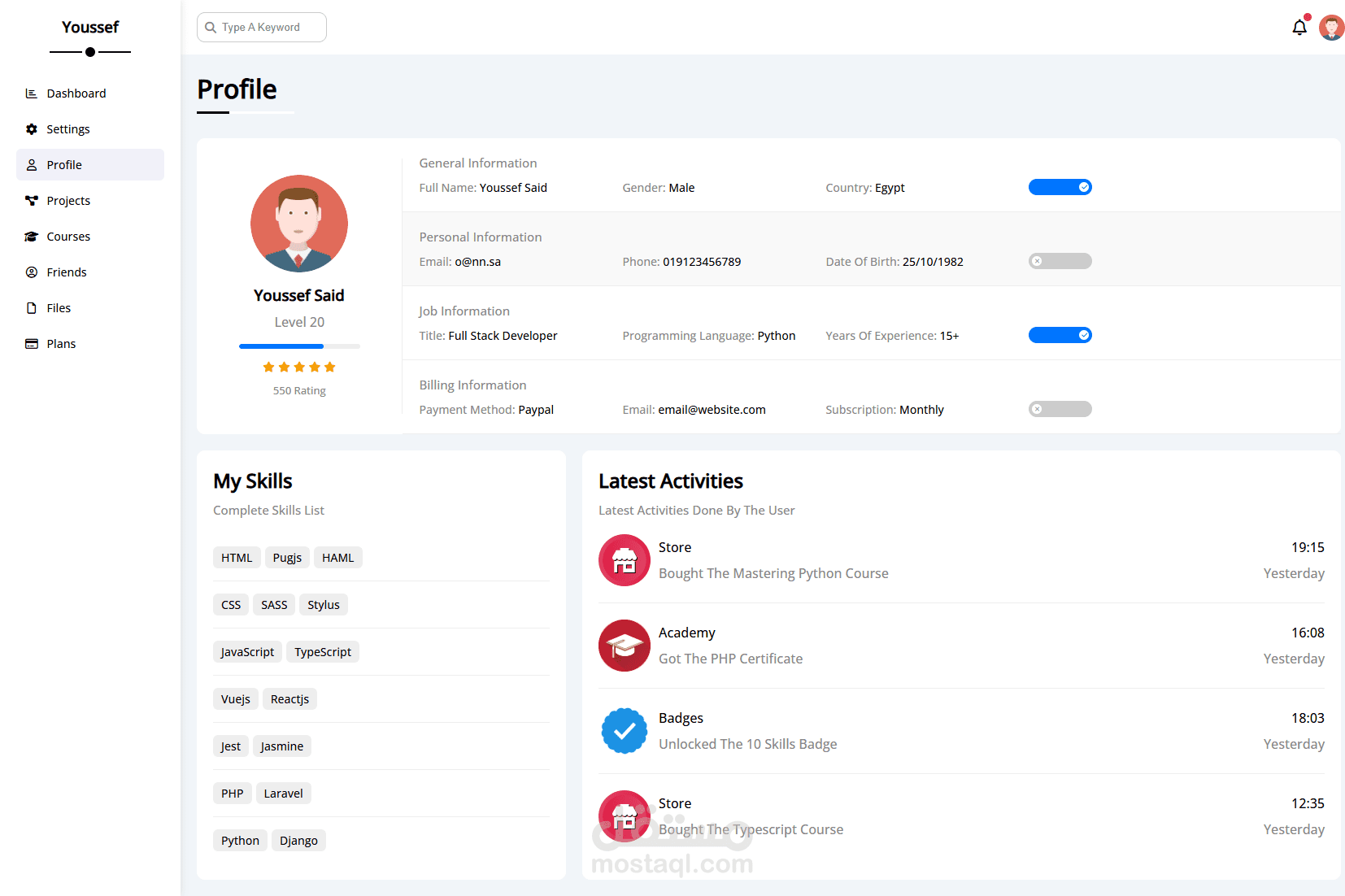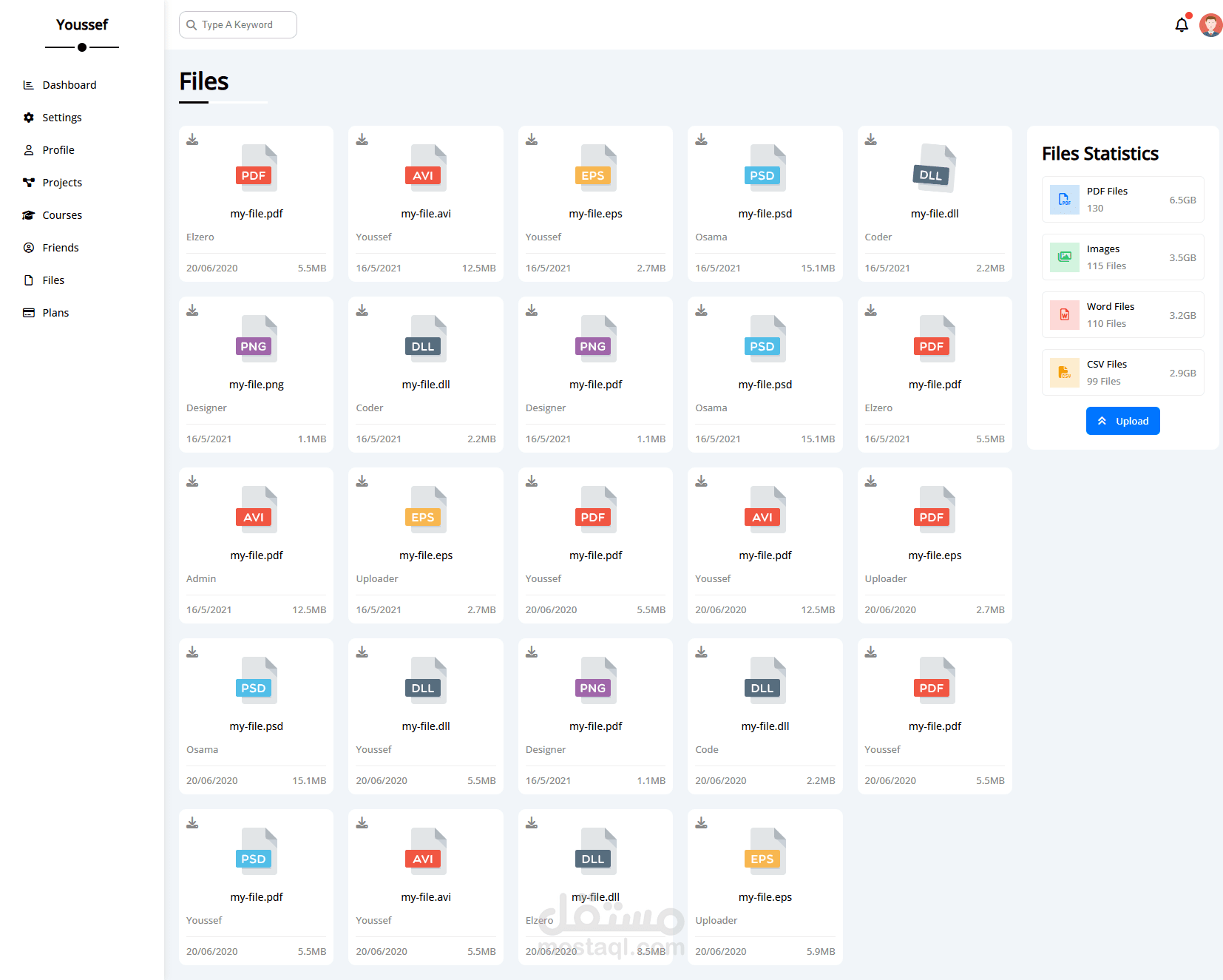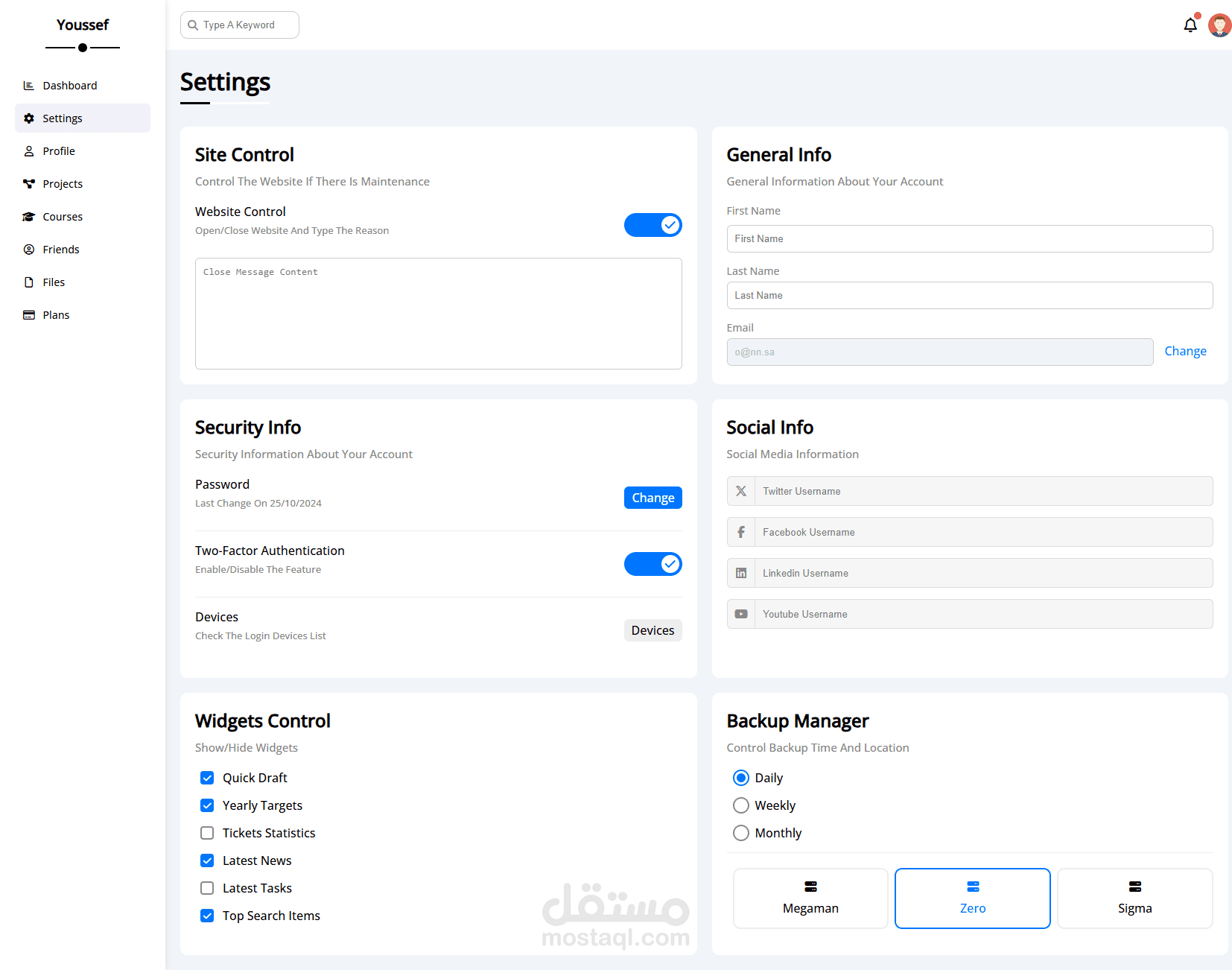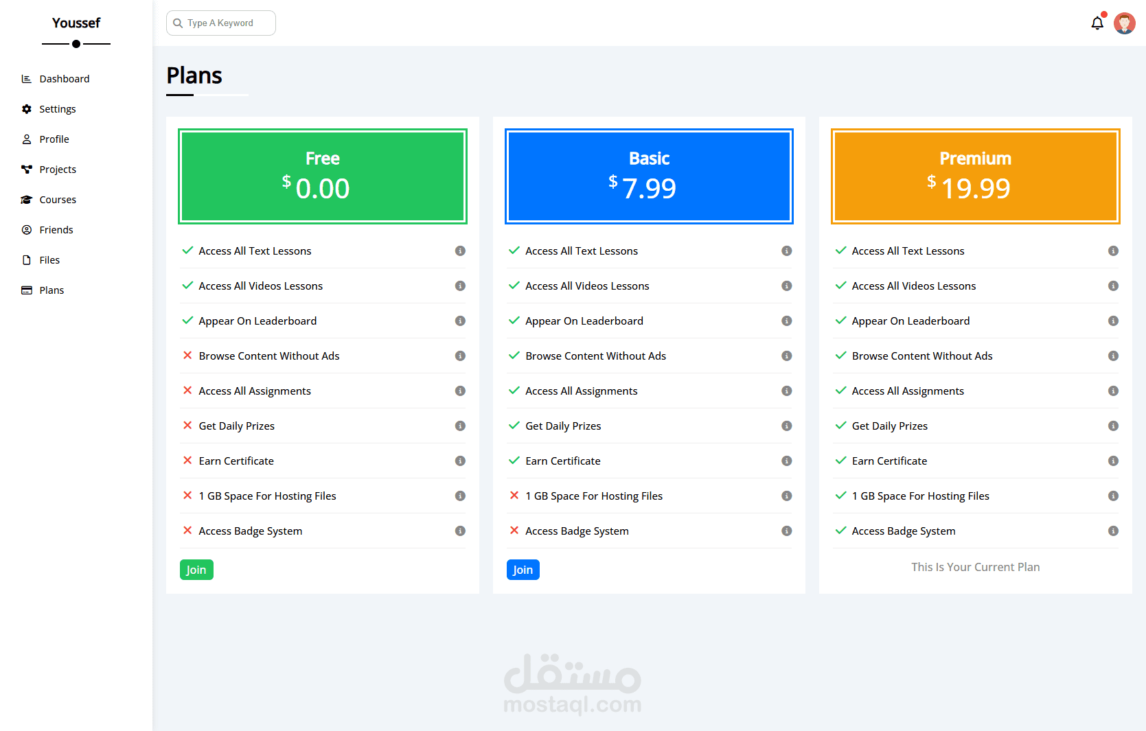 صفحات متعددة: يحتوي على عدة صفحات مثل الرئيسية، الأصدقاء، المشاريع، الدورات، الخطط، الإعدادات، والملف الشخصي.
