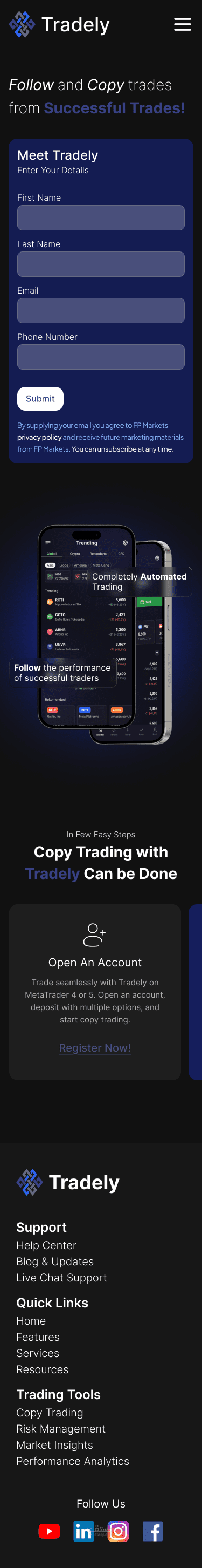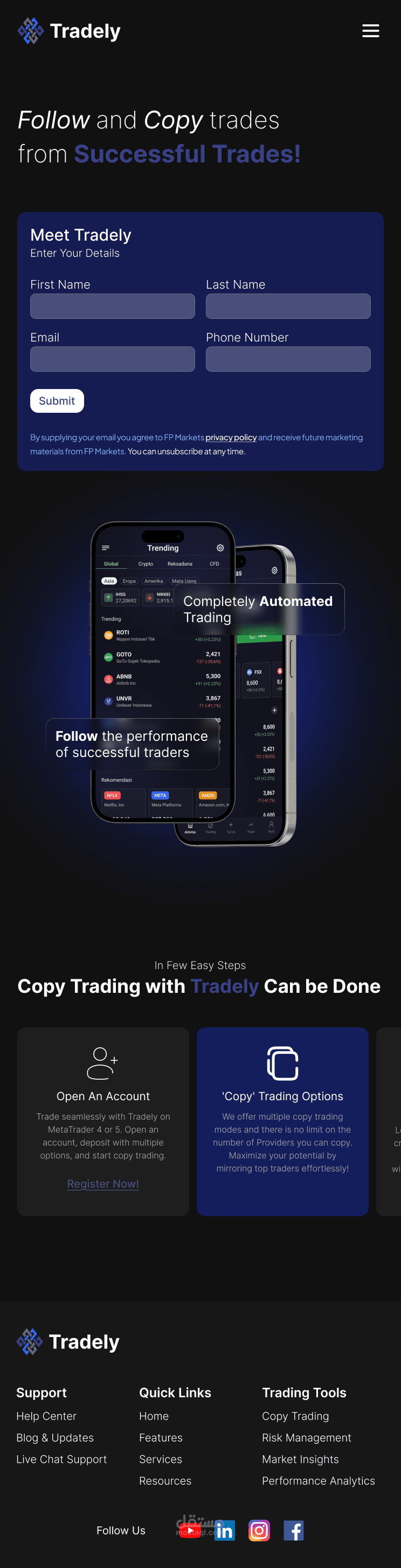 مشروع تصميم واجهة المستخدم/تجربة المستخدم – صفحة هبوط متجاوبة بالكامل لـ Tradely، وهي منصة تتيح للمستخدمين متابعة ونسخ الصفقات من التجار الناجحين. كان هذا المشروع يدور حول إنشاء تجربة مستخدم سلسة وجذابة لتحفيز التسجيلات وضم مستخدمين جدد.