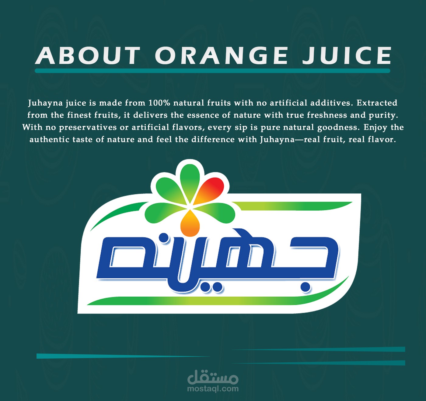تصميم يعكس نقاء الطبيعة وجودتها، حيث يجسد عصير جهينة بلمساته الطبيعية 100%، بدون أي مواد حافظة، ليمنحك المذاق الأصيل والطاقة النقية. مستوحى من خيرات الطبيعة، مقدم من جوهينة – علامة الثقة والجودة