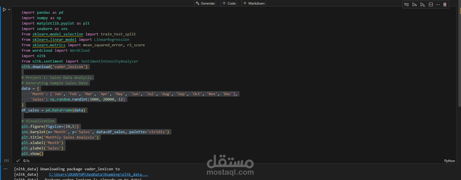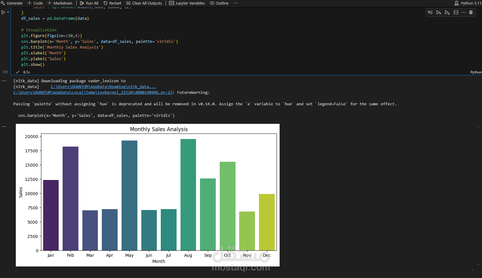 تحليل بيانات مبيعات شهرية باستخدام Pandas وSeaborn، مع تمثيلها في رسم بياني للأعمدة لفهم الاتجاهات الموسمية واتخاذ قرارات تسويقية بناءً على البيانات.