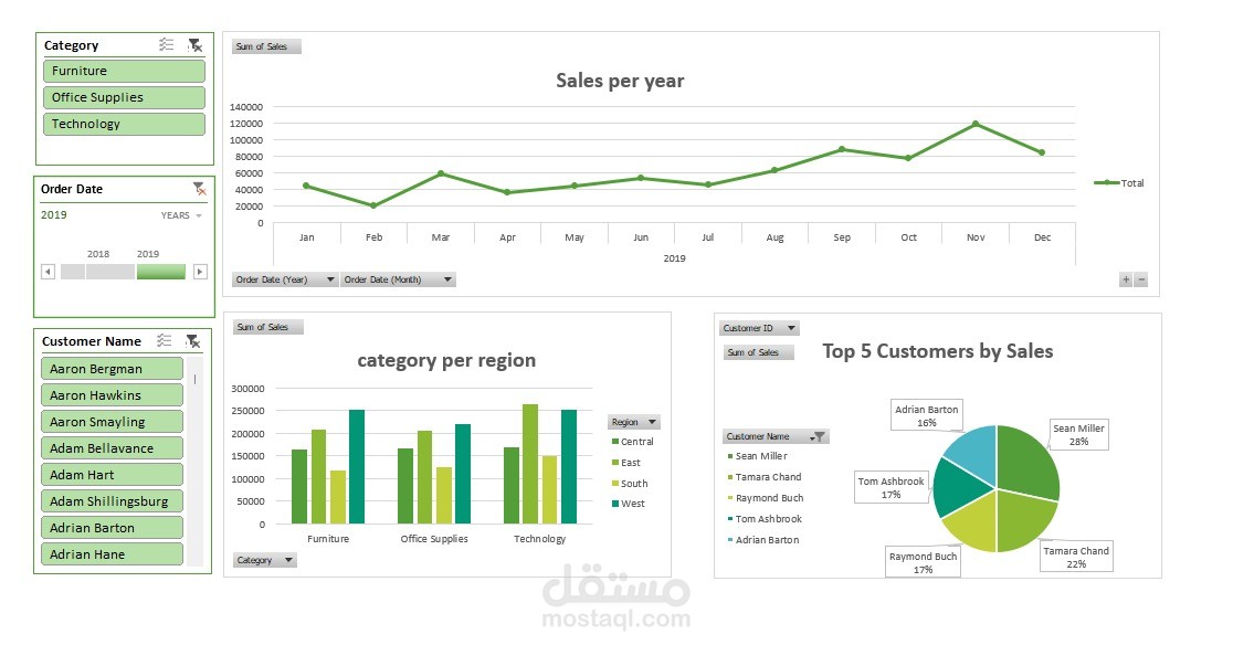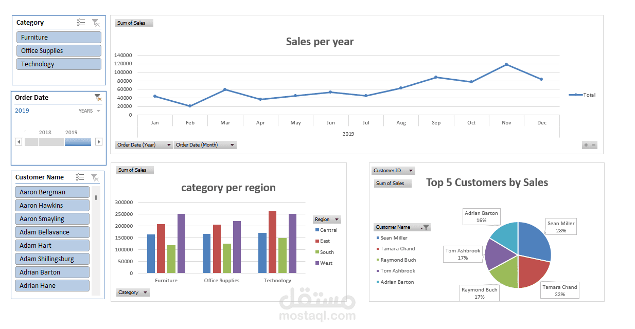 اللوحة تعرض بيانات مبيعات لعام 2019 وتتيح التفاعل مع البيانات من خلال فلاتر متعددة (Category، Order Date، Customer Name).