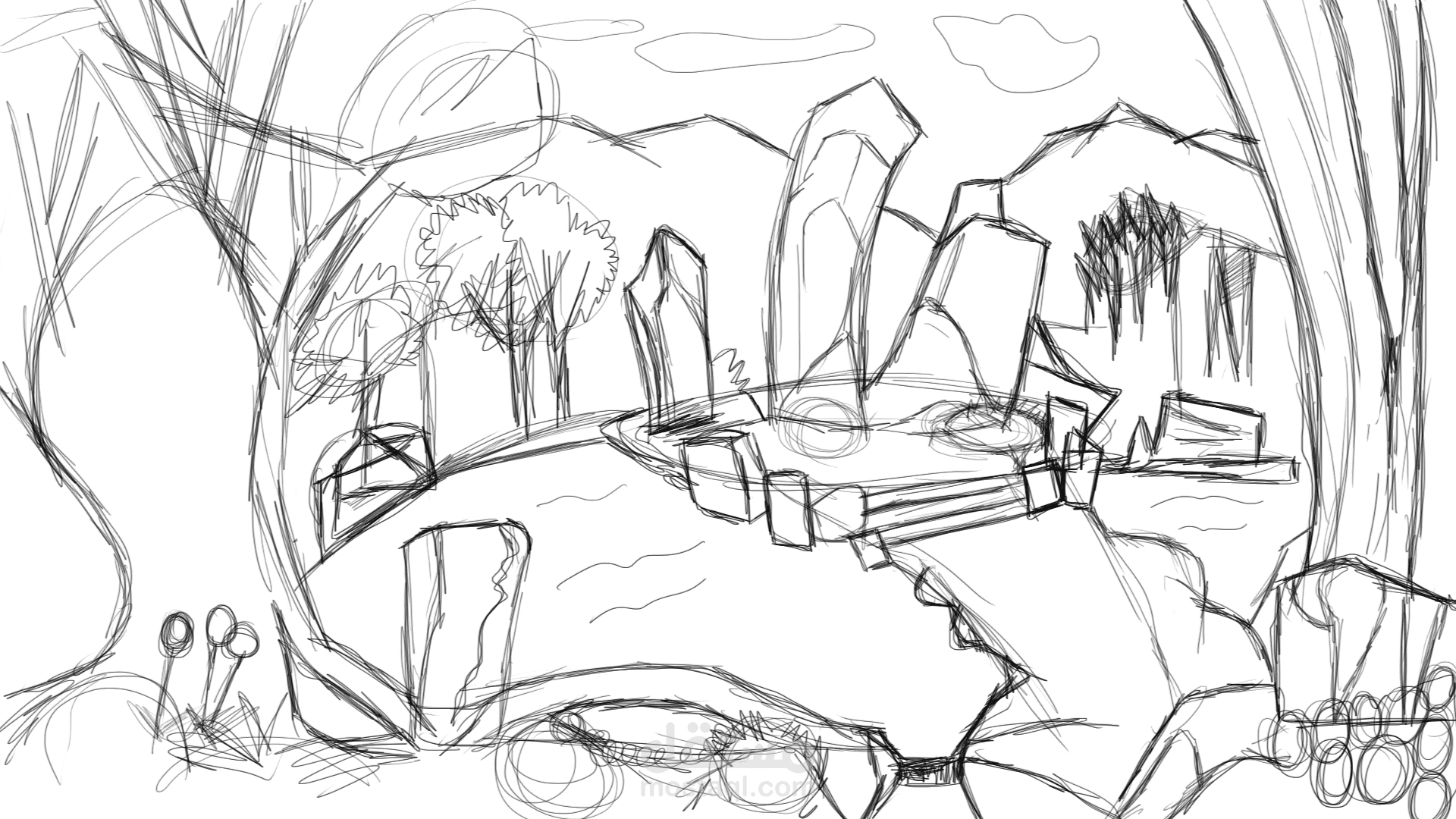التخطيط الأولي (Sketching): رسم تخطيطي للمشهد لتحديد التكوين الأساسي.