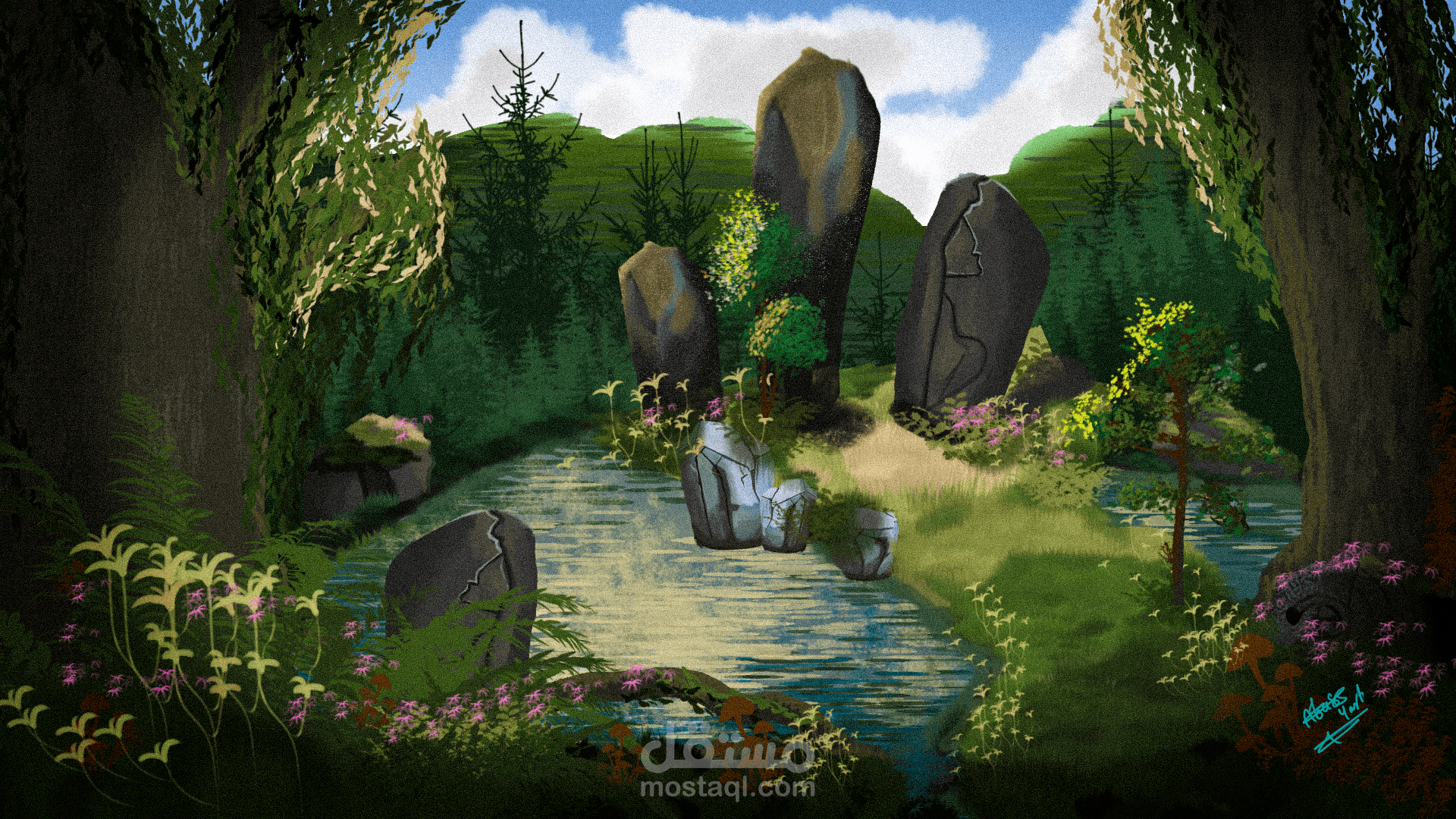 تم تنفيذ إعادة رسم لمشهد طبيعي خلاب بأسلوب فني مبتكر، مستوحى من المشهد الأصلي، مع إضافة لمسات إبداعية وتحسينات بصرية تعزز التفاصيل الجمالية.
