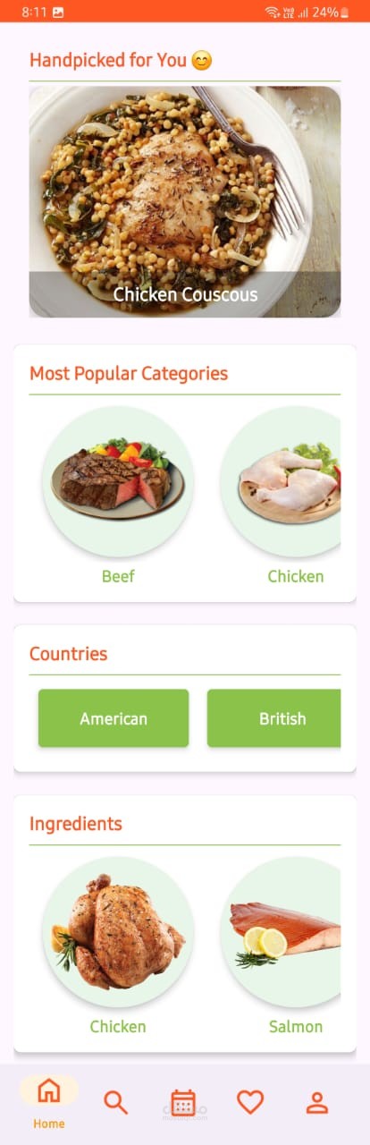 تطبيق موبايل أندرويد يساعد المستخدمين في تخطيط وجباتهم الأسبوعية. يتيح التطبيق أيضًا للمستخدمين تصفح فئات الوجبات، اقتراح وجبات عشوائية، والبحث عن وجبة معينة باستخدام العديد من الخيارات. يمكن للمستخدم حفظ الوجبات المفضلة ليمكنه تصفحها لاحقًا حتى بدون الاتصال بالإنترنت.