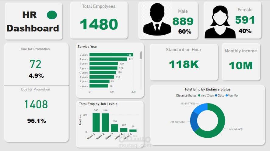 تم تصميم هذه لوحة التحكم التفاعلية لمساعدة فرق الموارد البشرية على تحليل بيانات الموظفين واتخاذ قرارات مبنية على البيانات. تقدم اللوحة نظرة شاملة على عدد الموظفين، التوزيع حسب الجنس، سنوات الخدمة، مستويات الوظائف، وحالة الترقية.