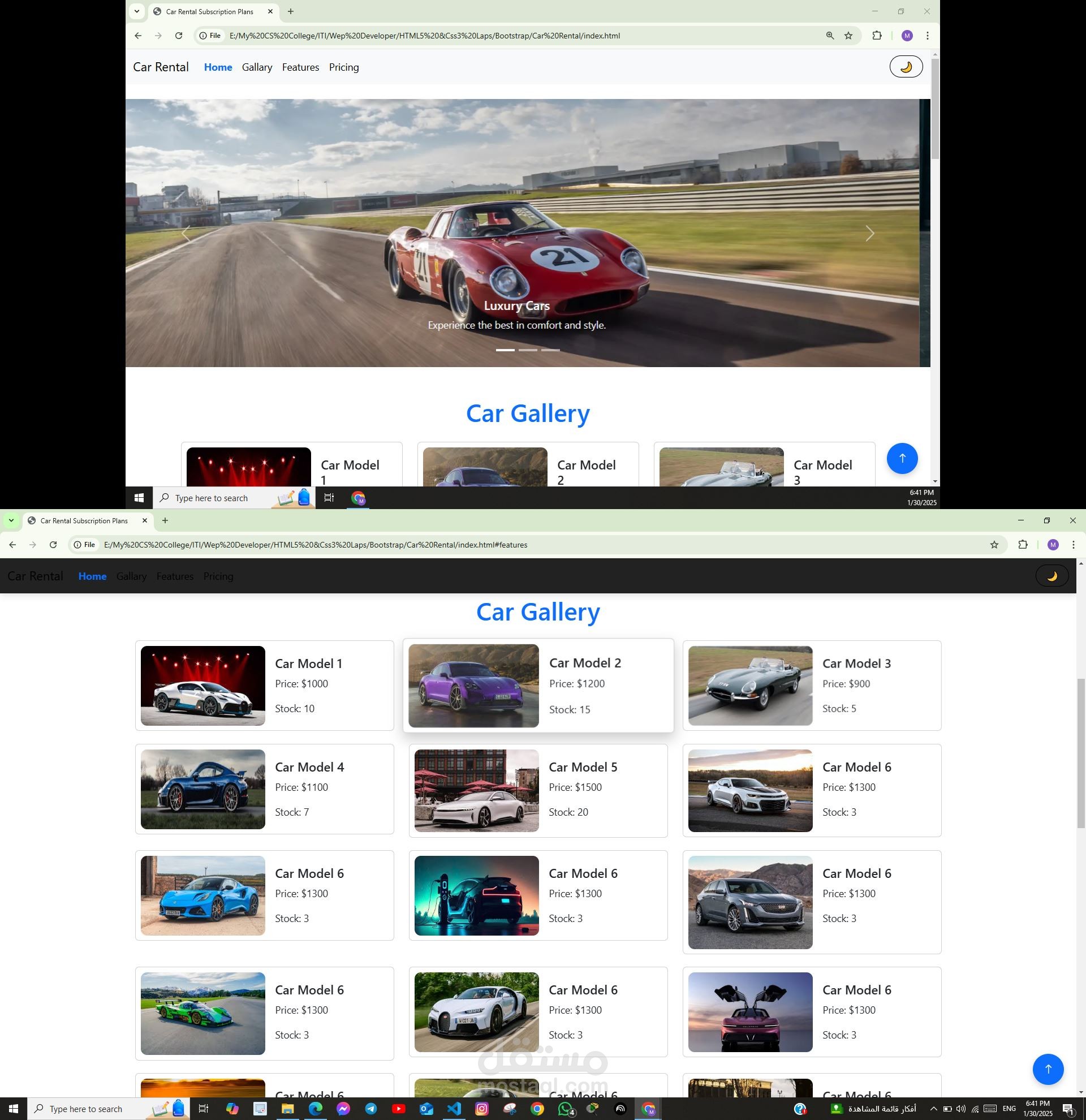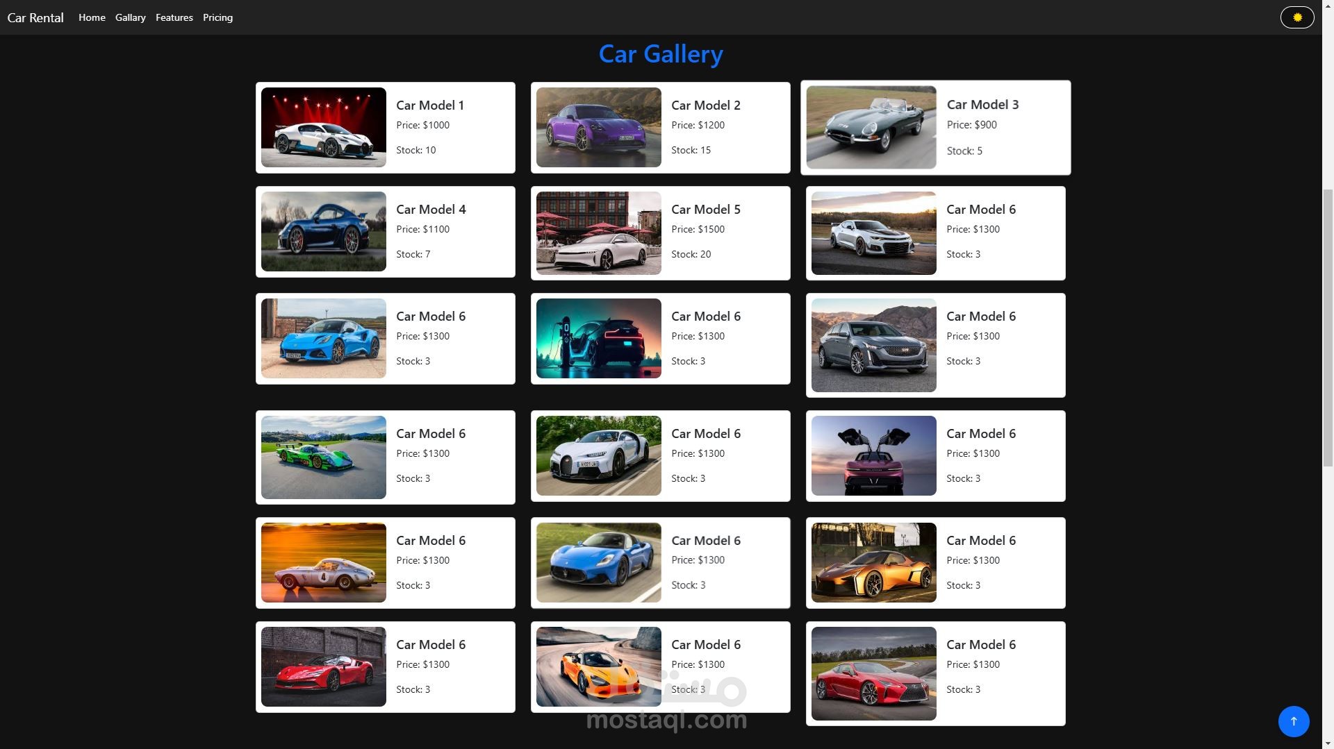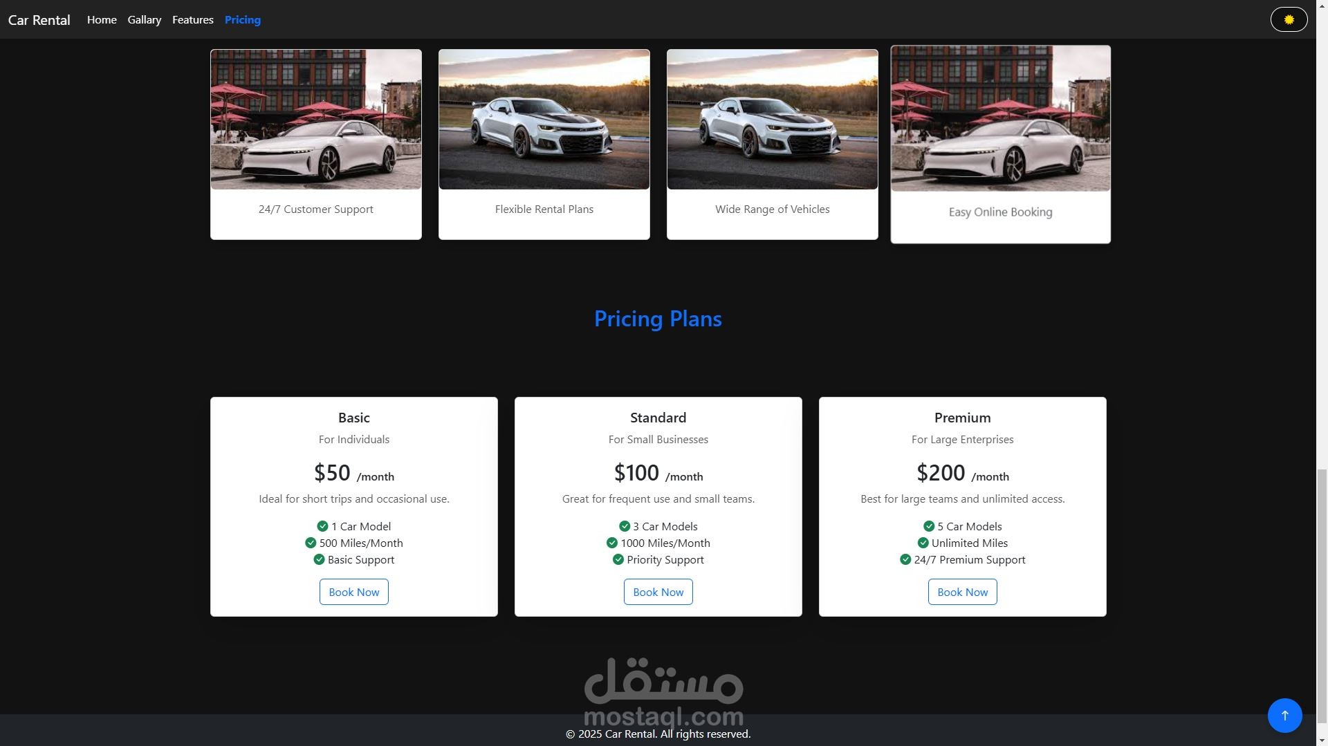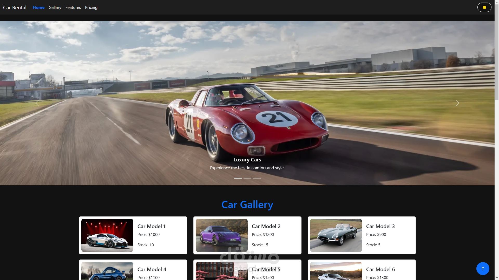 Car Rental Website هو موقع حديث ومتجاوب لتأجير السيارات، يتميز بواجهة مستخدم تفاعلية، دعم للوضع الداكن، وتأثيرات سلسة لتحسين تجربة المستخدم. يتيح تصفح السيارات المتاحة، الاطلاع على خطط الأسعار، والتفاعل مع الموقع بسهولة من خلال شريط التنقل الثابت وزر الوصول السريع. كما يتميز بوجود Preloader لتحسين تجربة التحميل.