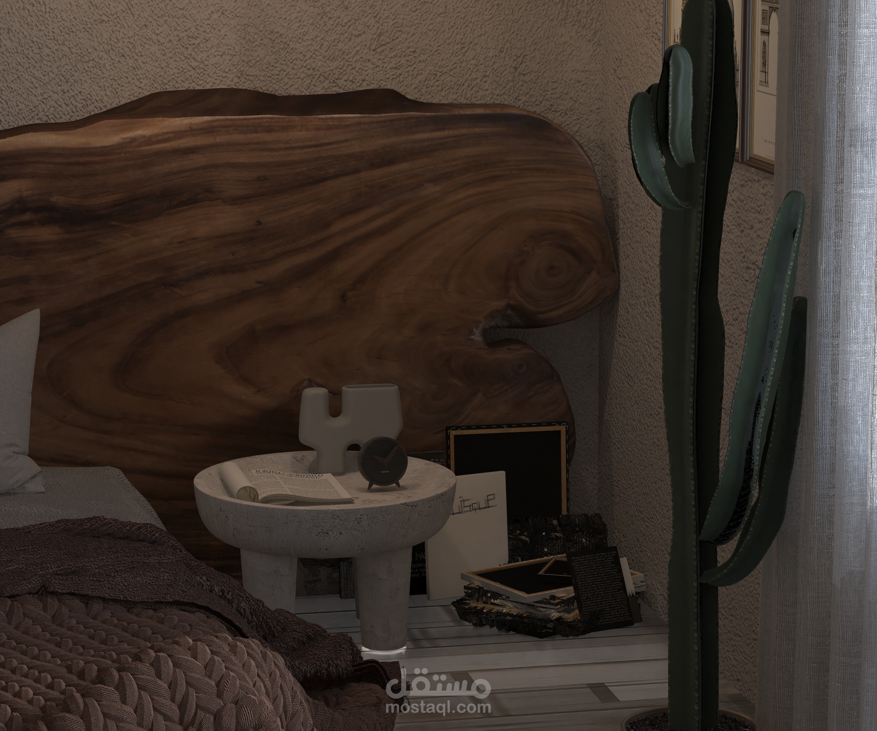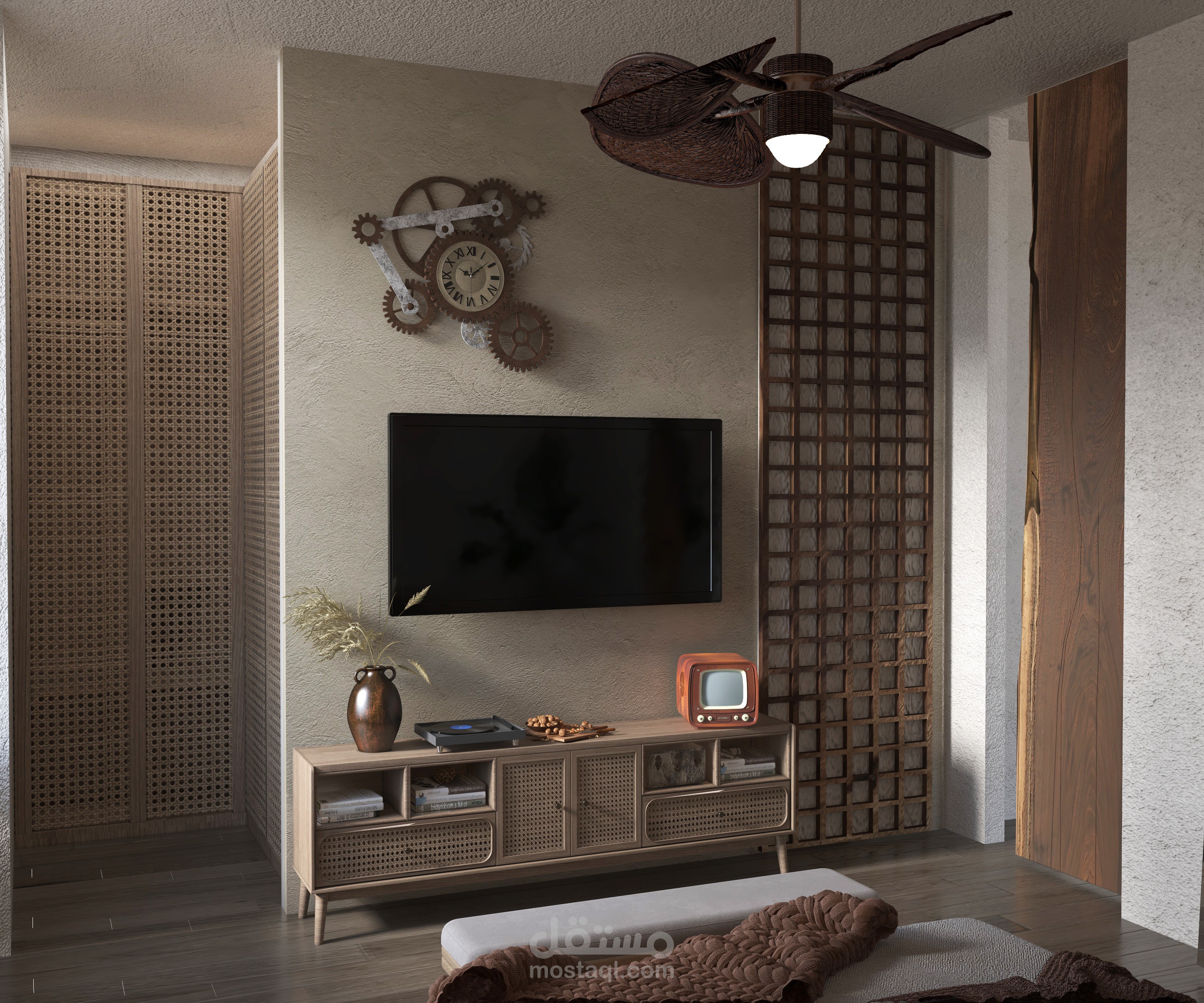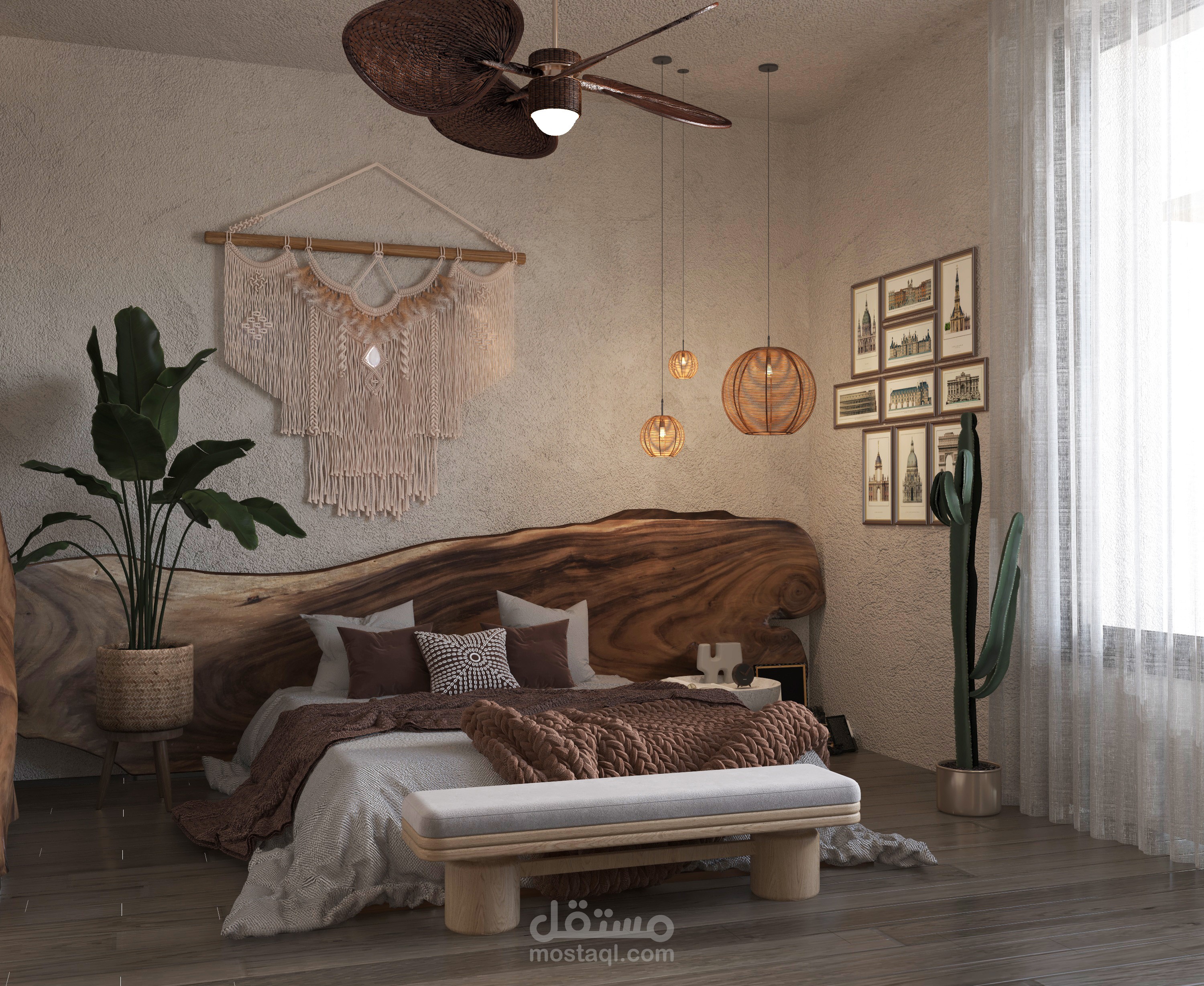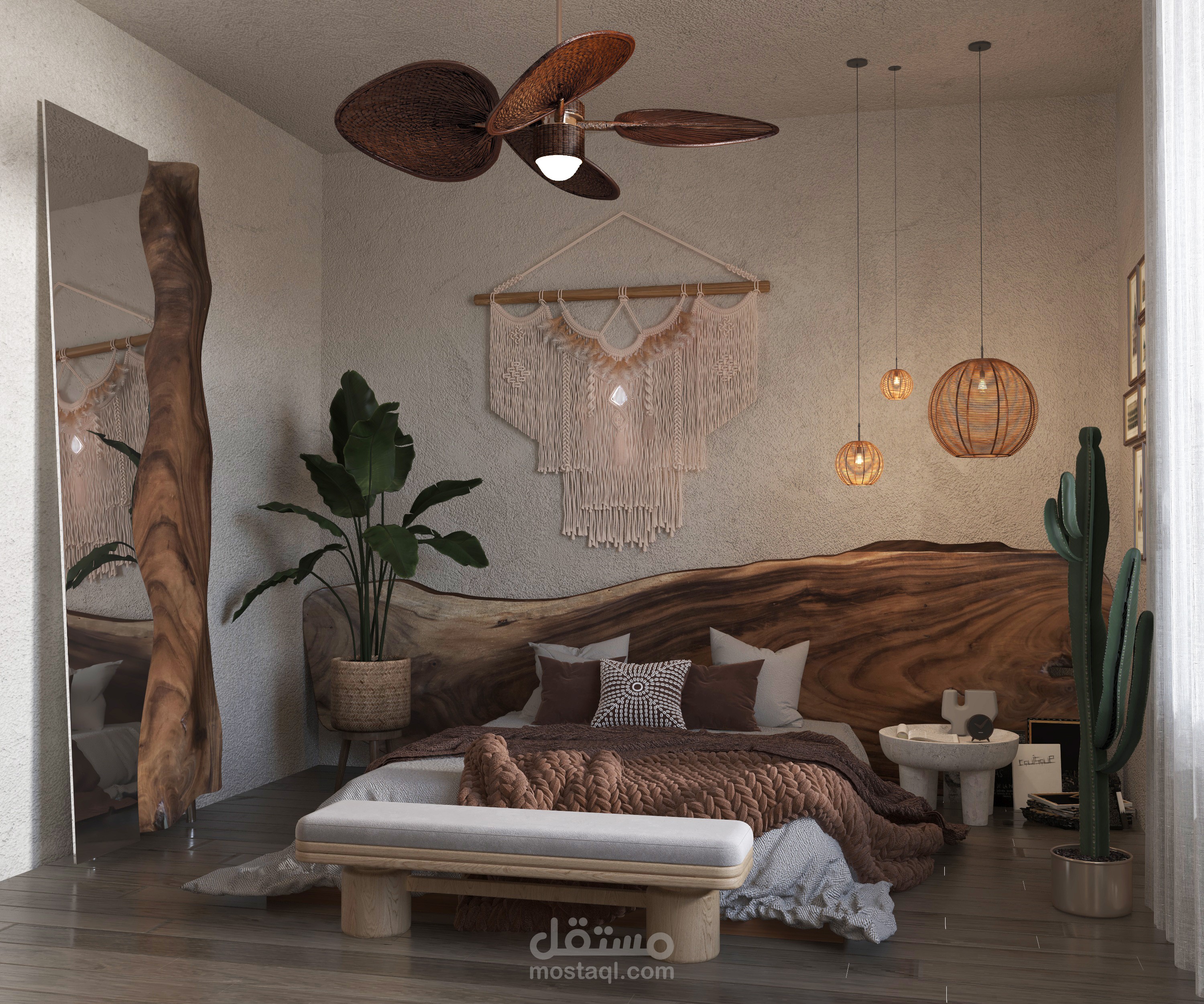 A serene blend of natural materials and modern comfort, featuring handcrafted lighting, organic textures, and lush greenery. This design embodies the essence of Bohemian Modern style, balancing simplicity and elegance
