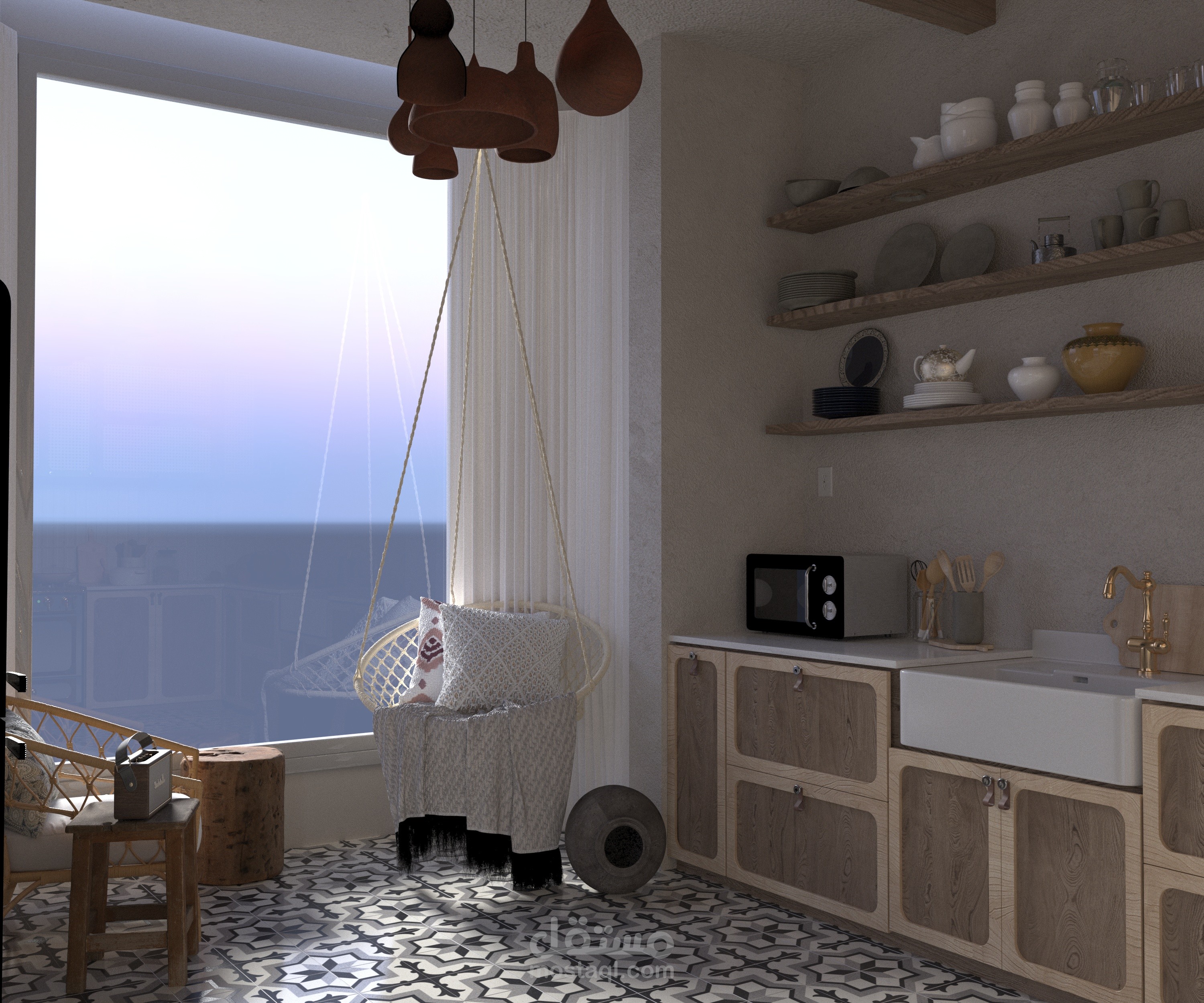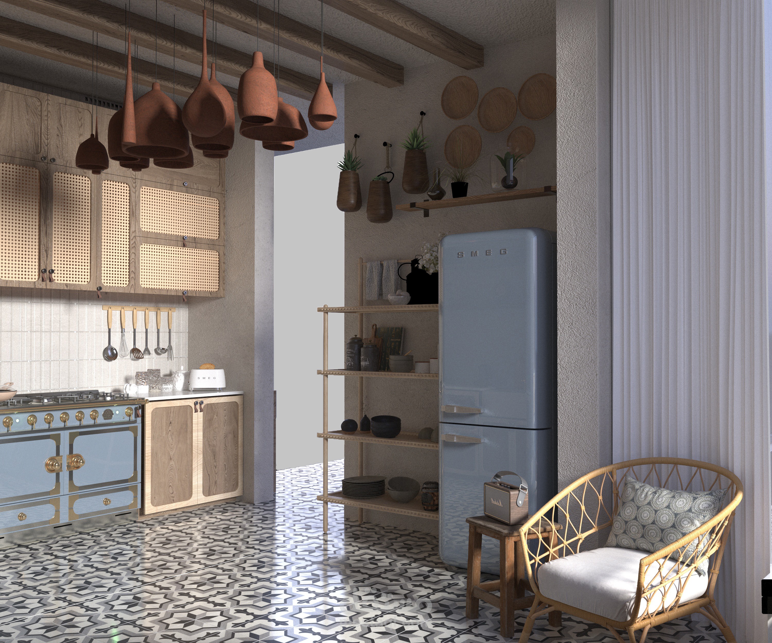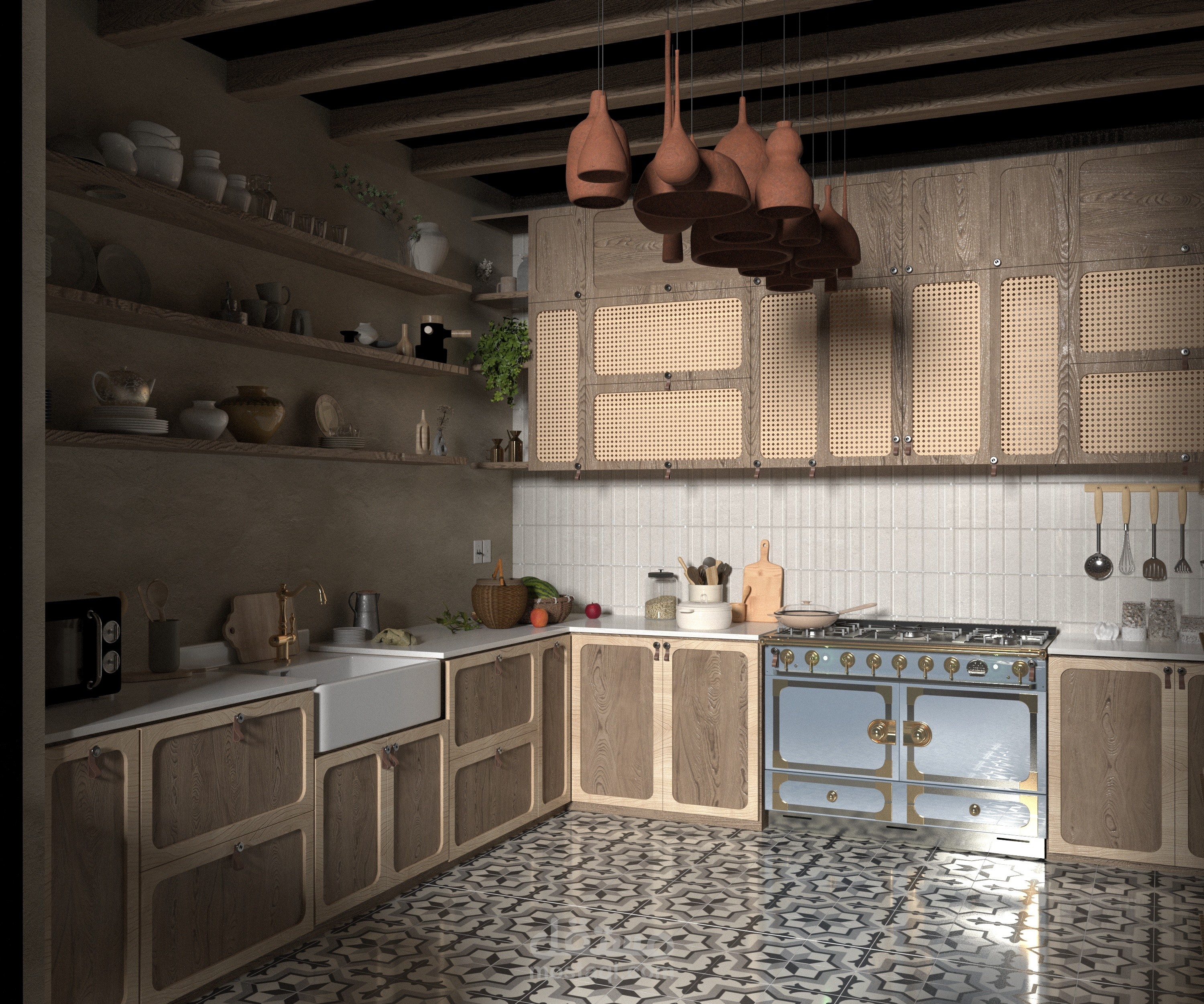 A warm and inviting kitchen that combines rustic wooden cabinetry with cane paneling and handcrafted terracotta pendant lights. The patterned tiles and open shelving enhance the traditional charm, while the modern appliances ensure functionality. This design celebrates simplicity and natural textures, creating a timeless and cozy atmosphere.