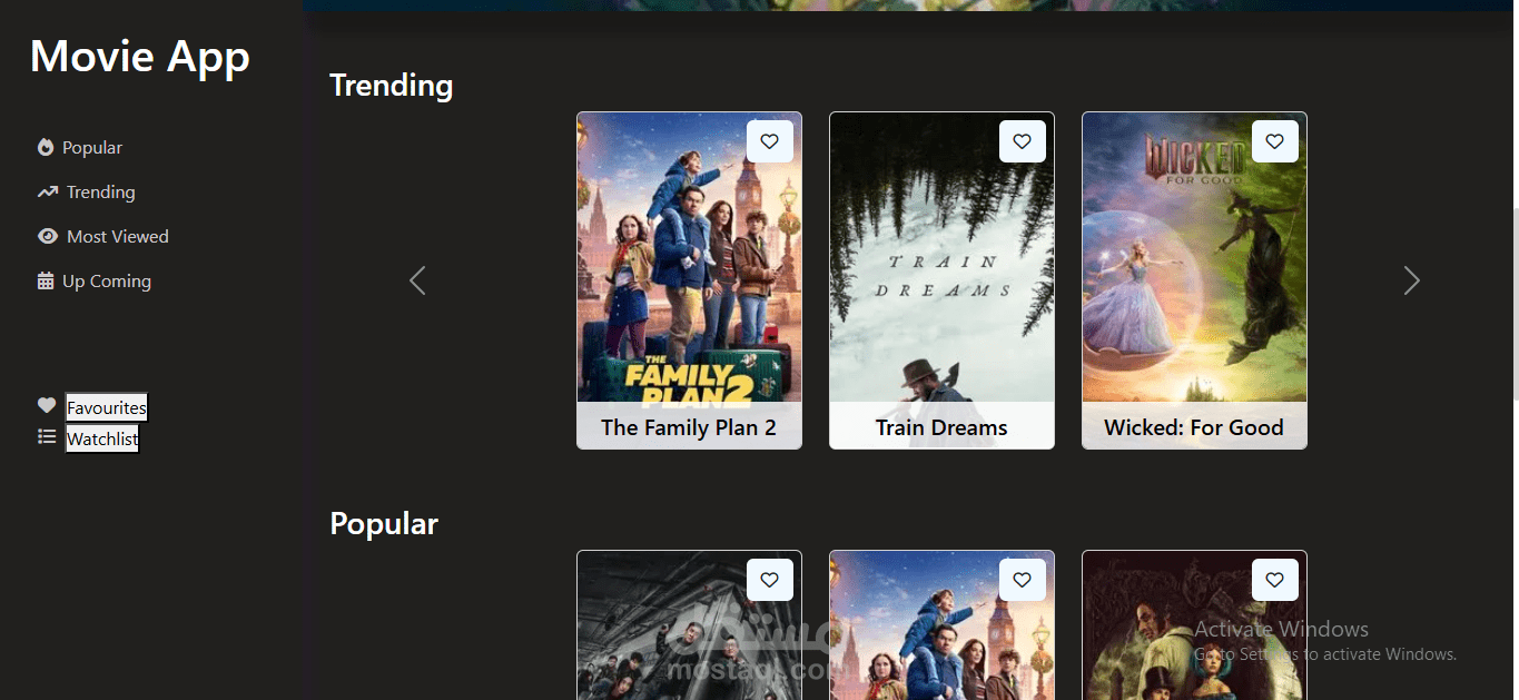هذا مشروع عرض أفلام مطور باستخدام JavaScript، بيهدف لتقديم تجربة تفاعلية وسلسة للمستخدمين بدون الحاجة لاستخدام إطار عمل زي React. المشروع بيقدم واجهة مستخدم نظيفة وعصرية بتسمح للمستخدمين بتصفح أحدث الأفلام والمعلومات المرتبطة بيها. من أهم مميزات المشروع: