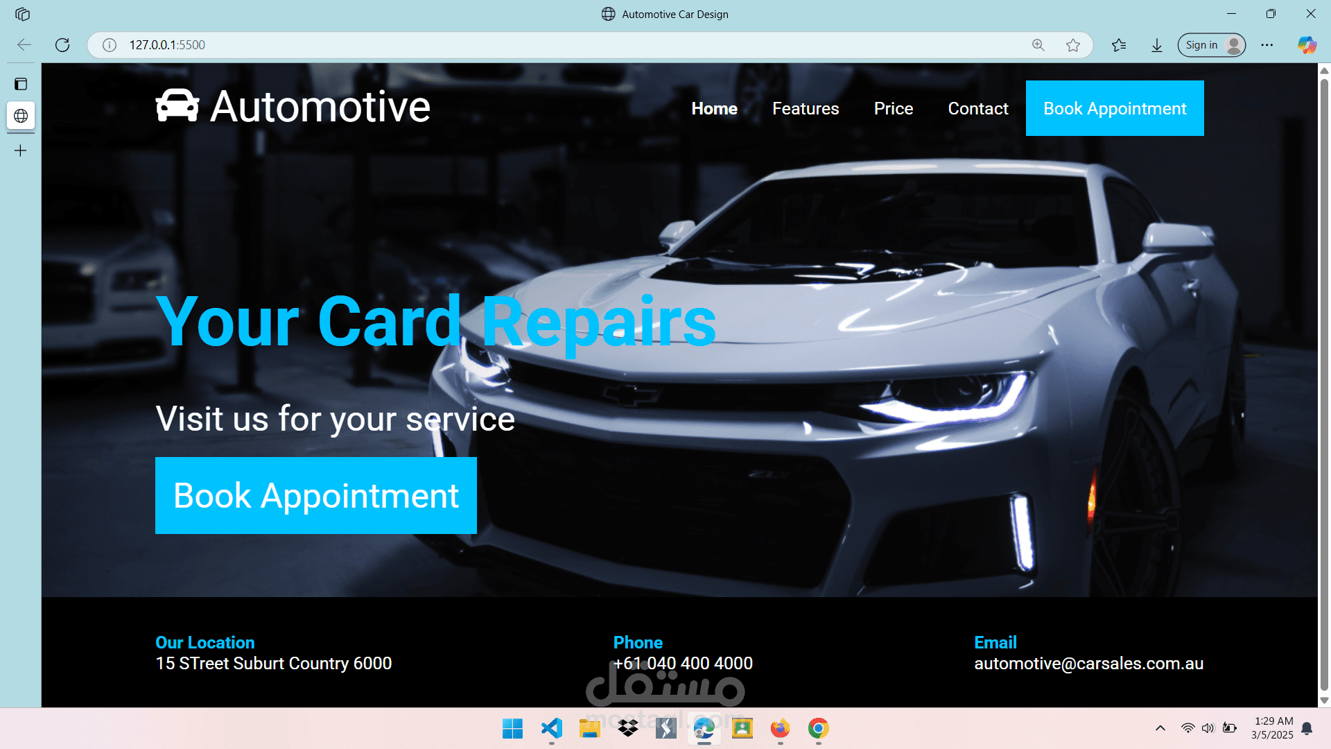 ذا المشروع هو موقع ويب خاص بخدمات إصلاح وصيانة السيارات، حيث يوفر واجهة جذابة وسهلة الاستخدام للعملاء لحجز المواعيد والاطلاع على الميزات المتاحة. يعتمد الموقع على تصميم حديث مع صورة خلفية لسيارة لإضفاء طابع احترافي.