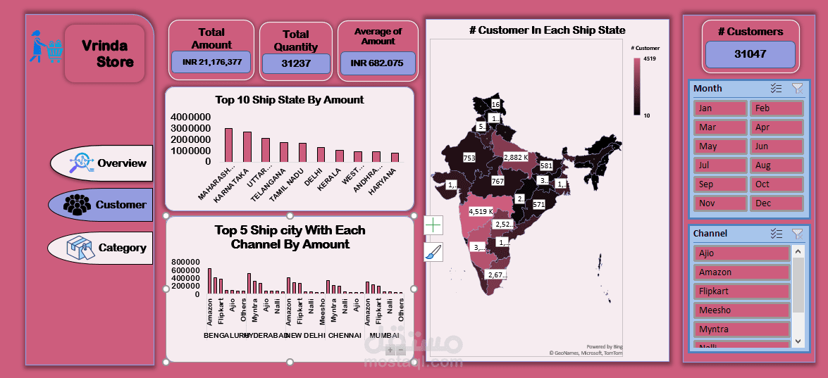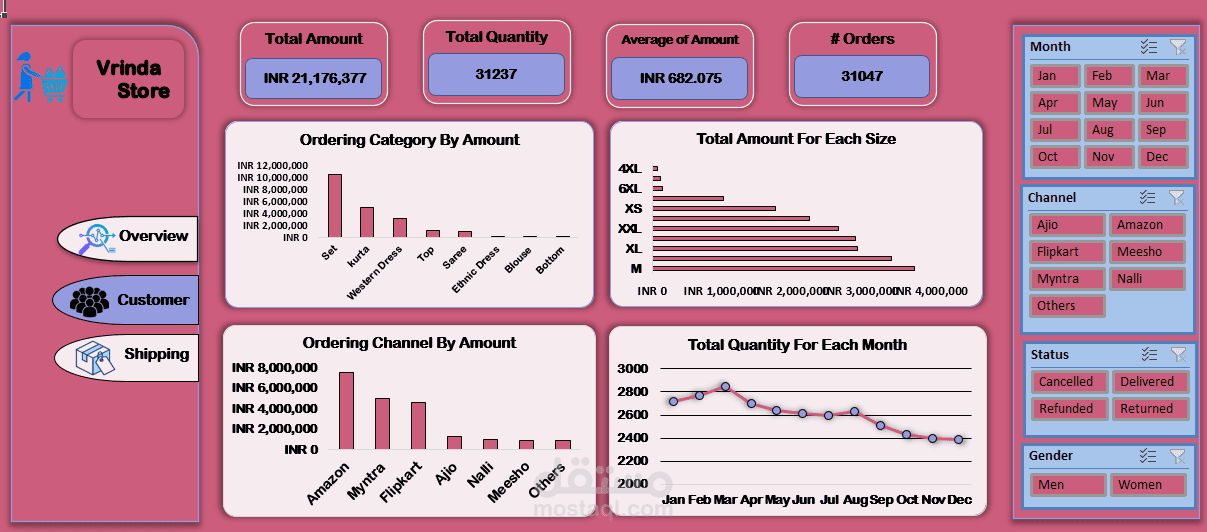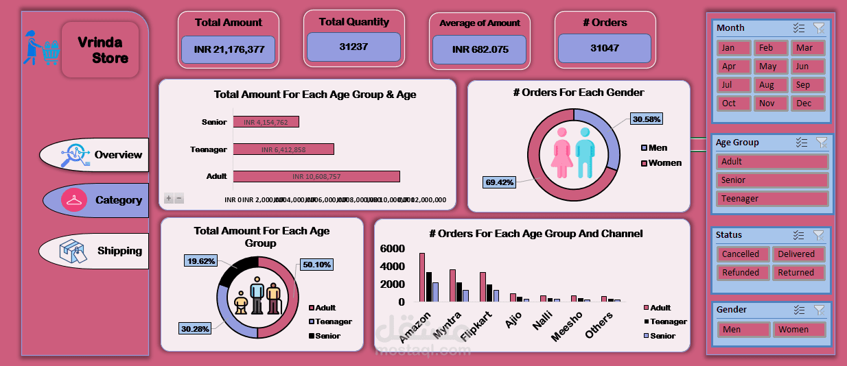 The dashboard provides insights into Category, Age Group, Gender, Date, Ship City, Size, Status