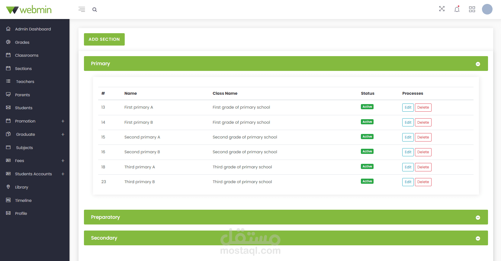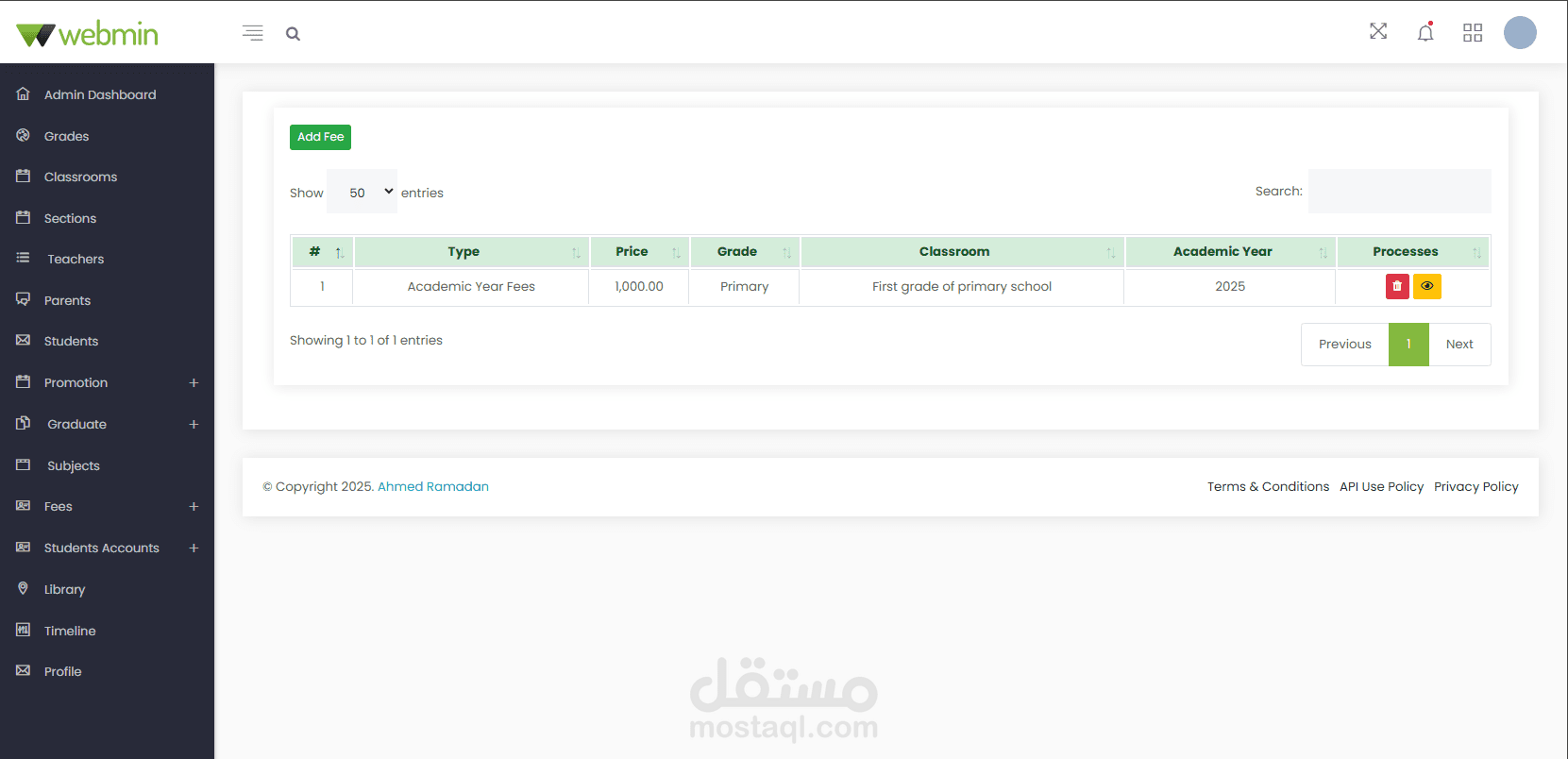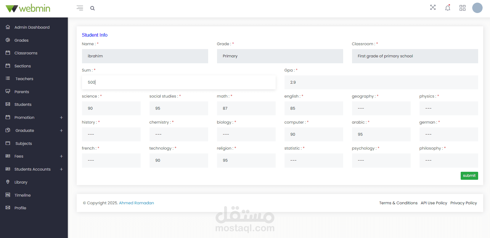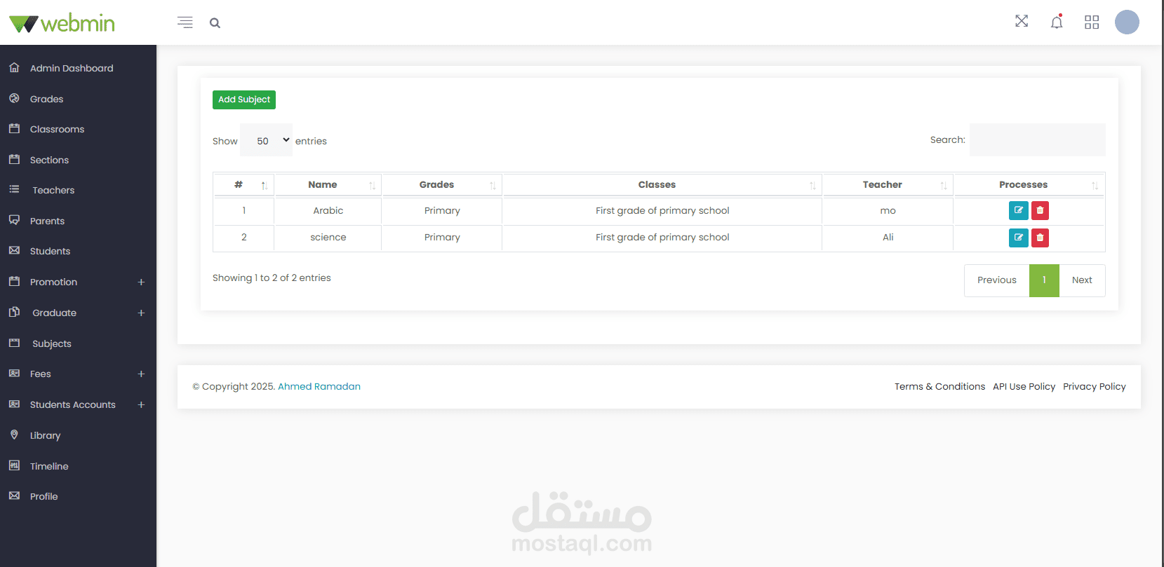 Administrator Dashboard: Create, edit, and manage student classes, sections, subjects, and books in the library. Manage all user accounts and profiles. Notices are displayed on the calendar in the dashboard. Manage and print payments, fees, and payment receipts. Create, edit, and manage student promotions to the next stage after the results are announced.