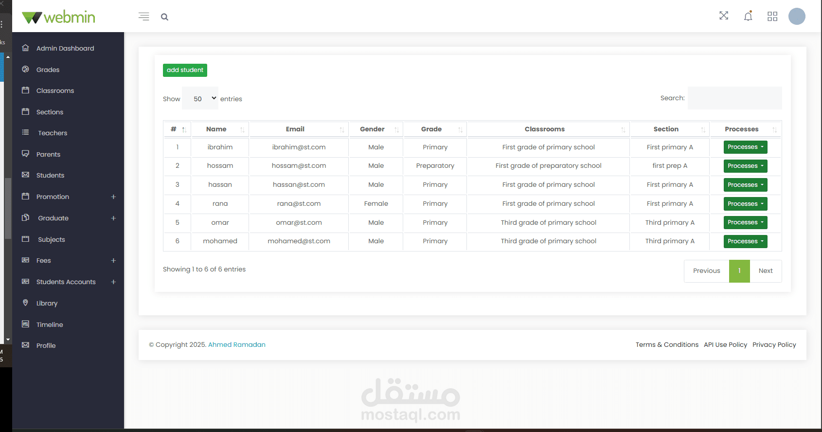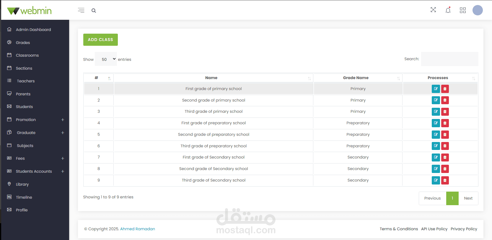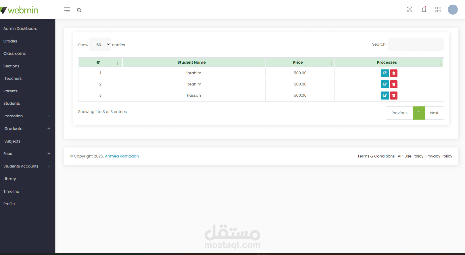 Administrator Dashboard: Create, edit, and manage student classes, sections, subjects, and books in the library. Manage all user accounts and profiles. Notices are displayed on the calendar in the dashboard. Manage and print payments, fees, and payment receipts. Create, edit, and manage student promotions to the next stage after the results are announced.
