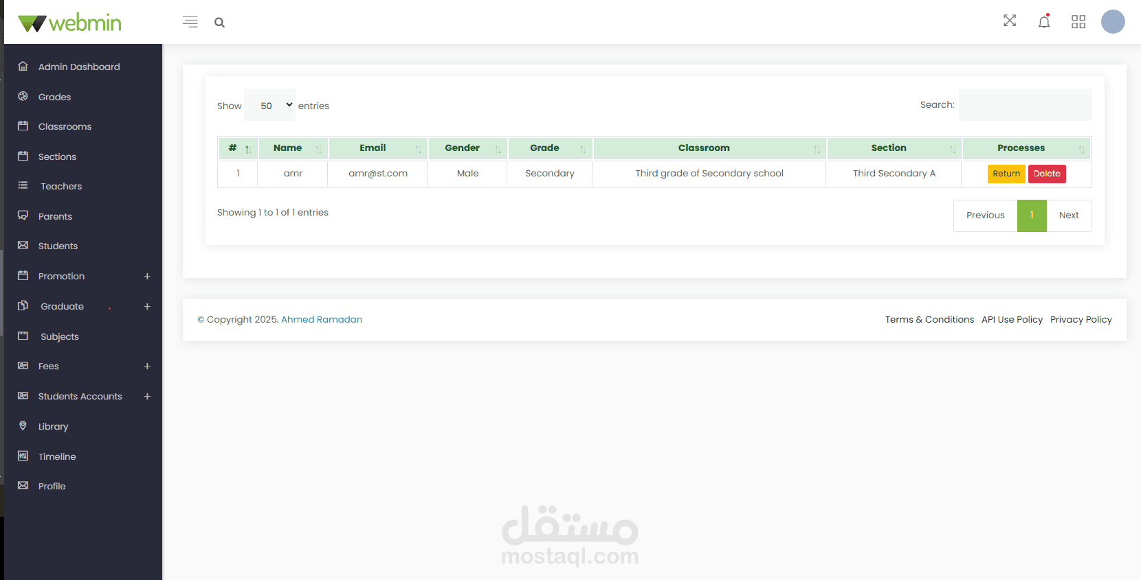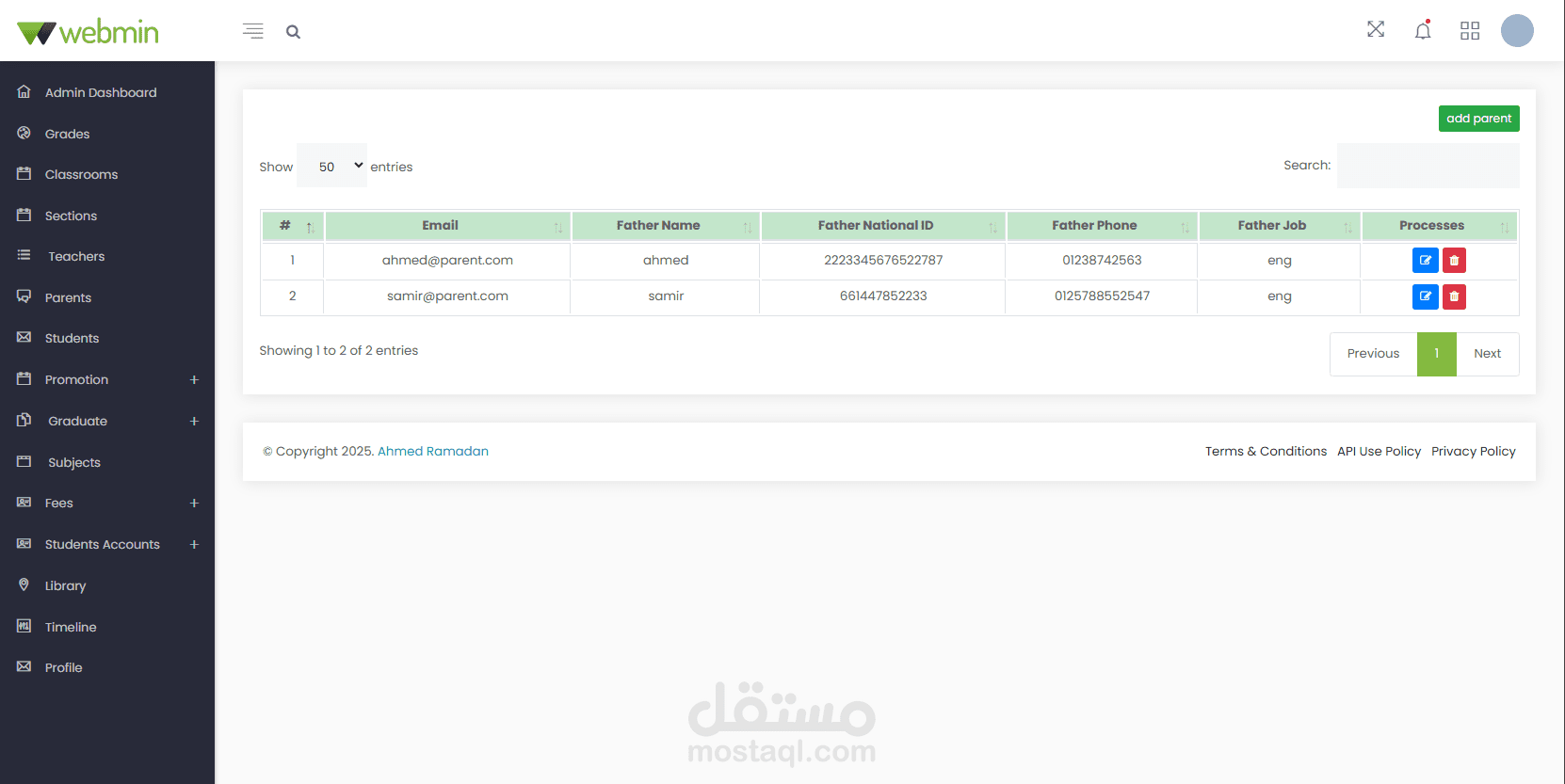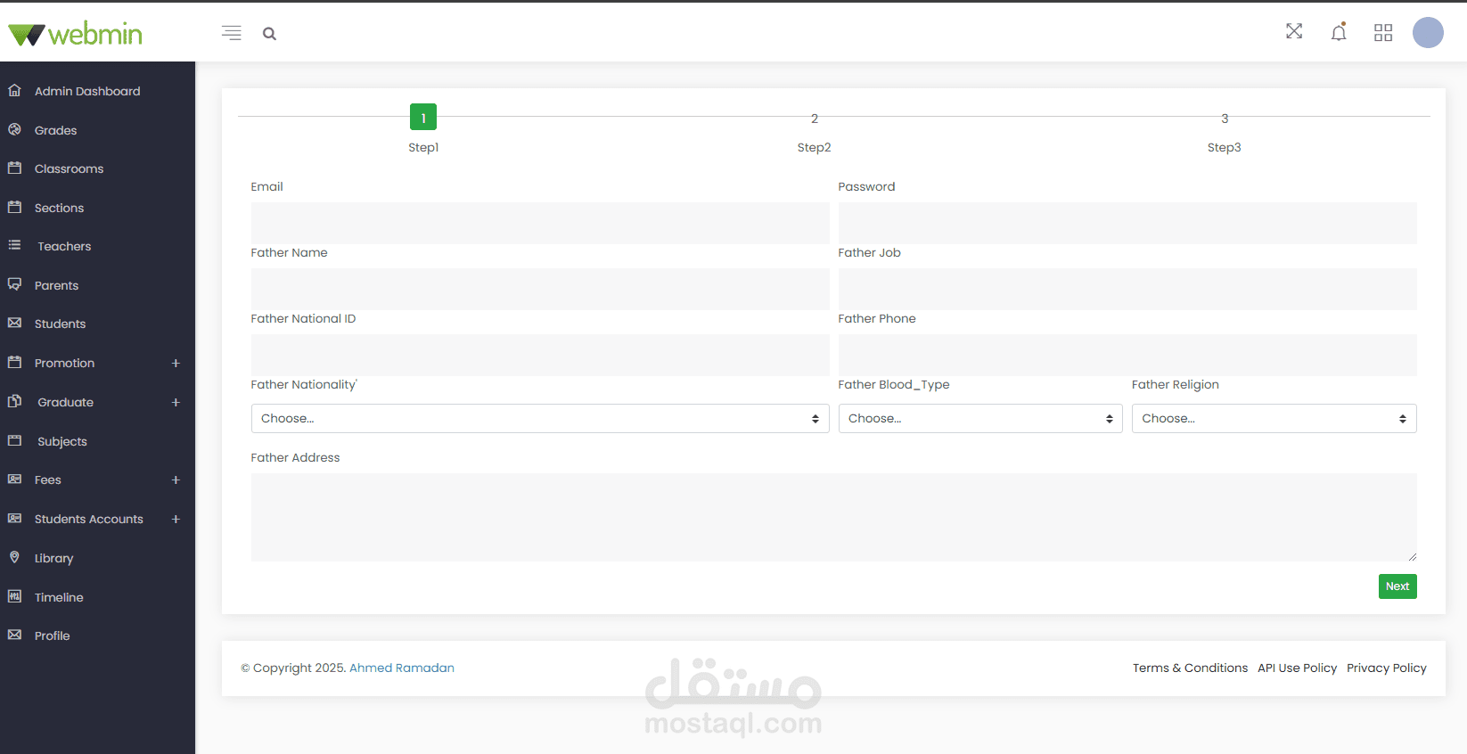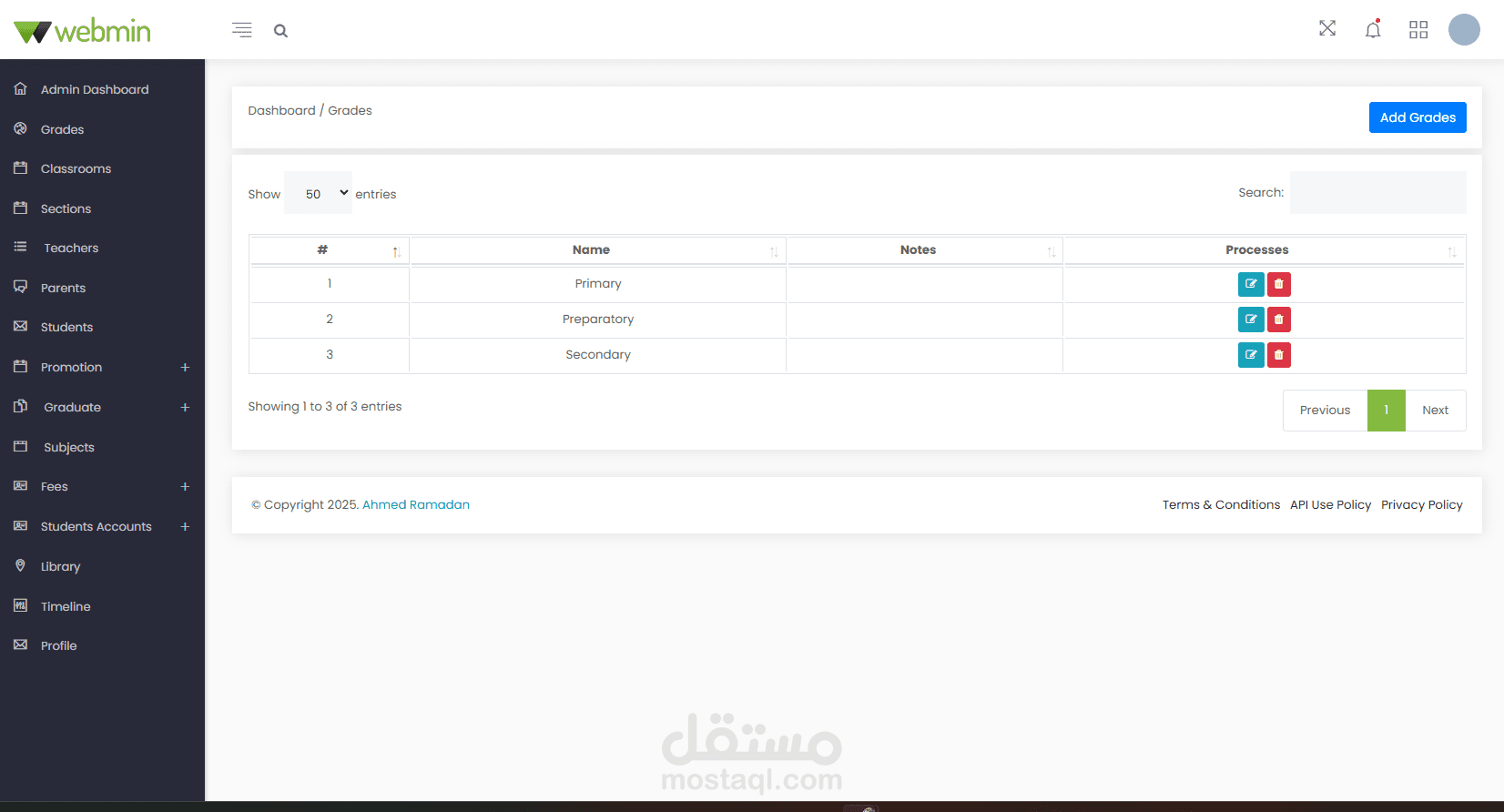 Administrator Dashboard: Create, edit, and manage student classes, sections, subjects, and books in the library. Manage all user accounts and profiles. Notices are displayed on the calendar in the dashboard. Manage and print payments, fees, and payment receipts. Create, edit, and manage student promotions to the next stage after the results are announced.