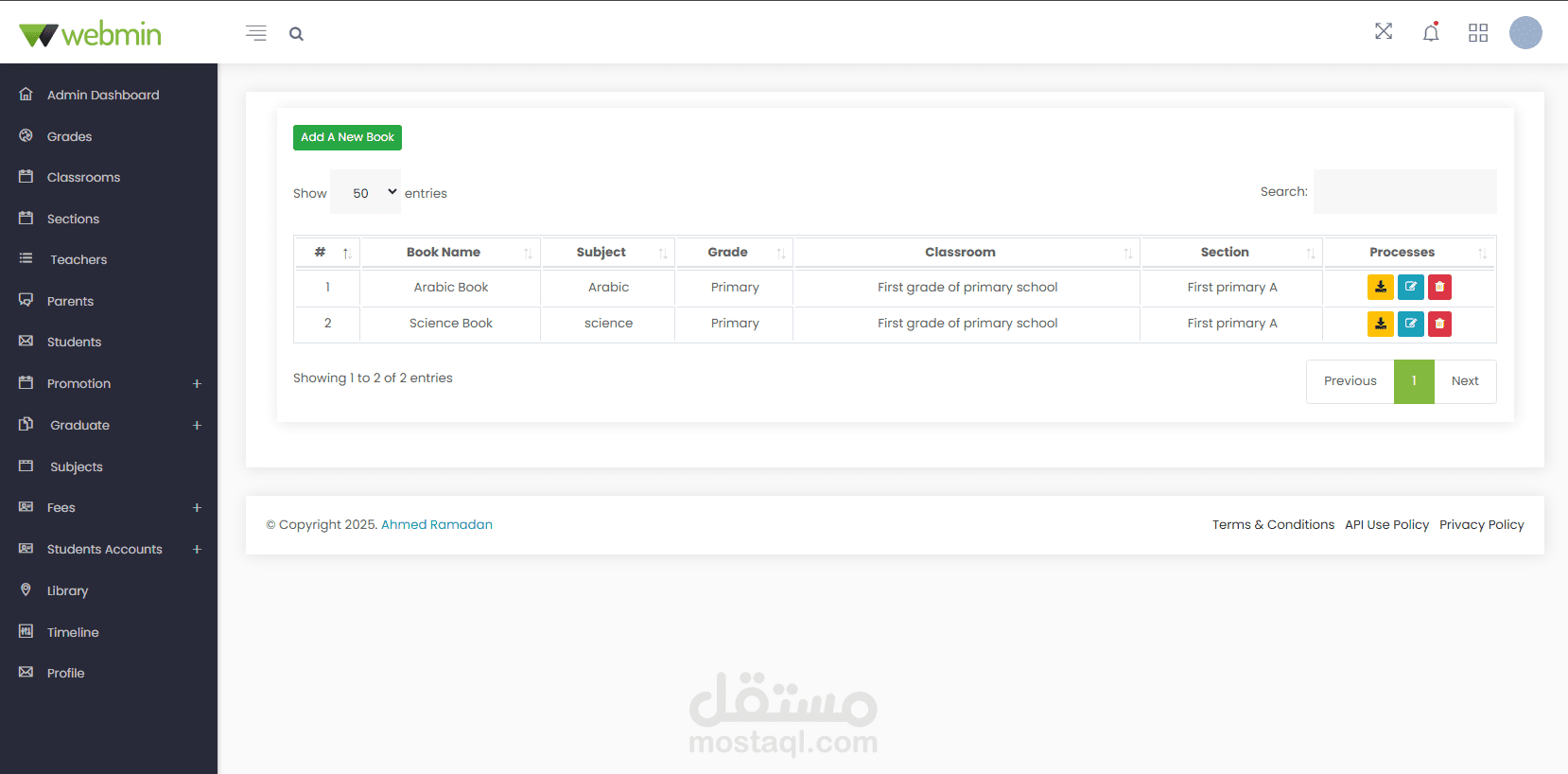 إنشاء وتحرير وإدارة فصول الطلاب، والأقسام، والمواد الدراسية، والكتب في المكتبة.