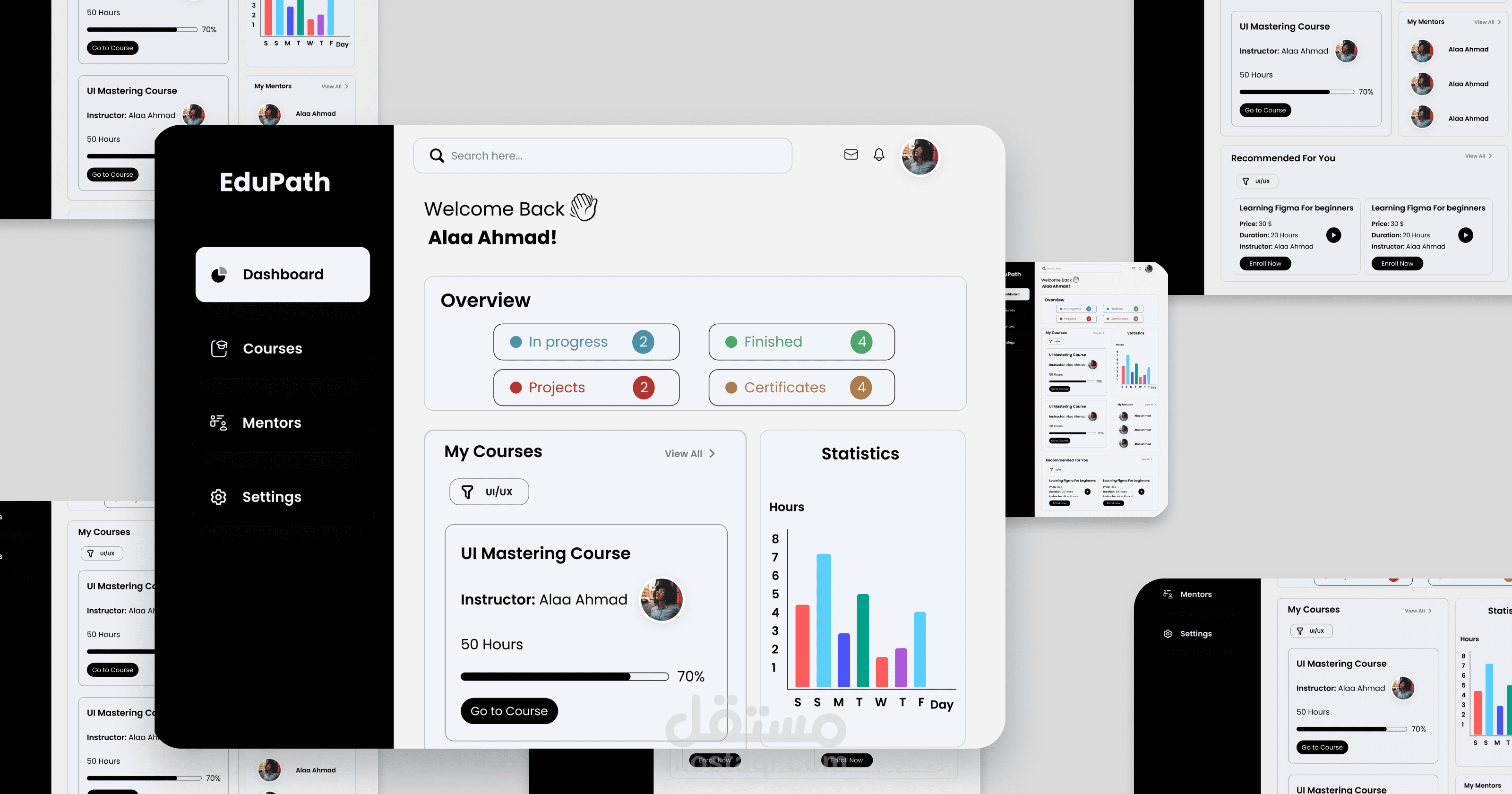 Educational Dashboard: يعرض تقدم الطلاب، الكورسات، والمواد الدراسية بطريقة مبسطة تمكن المتعلم من متابعة أدائه بسهولة.