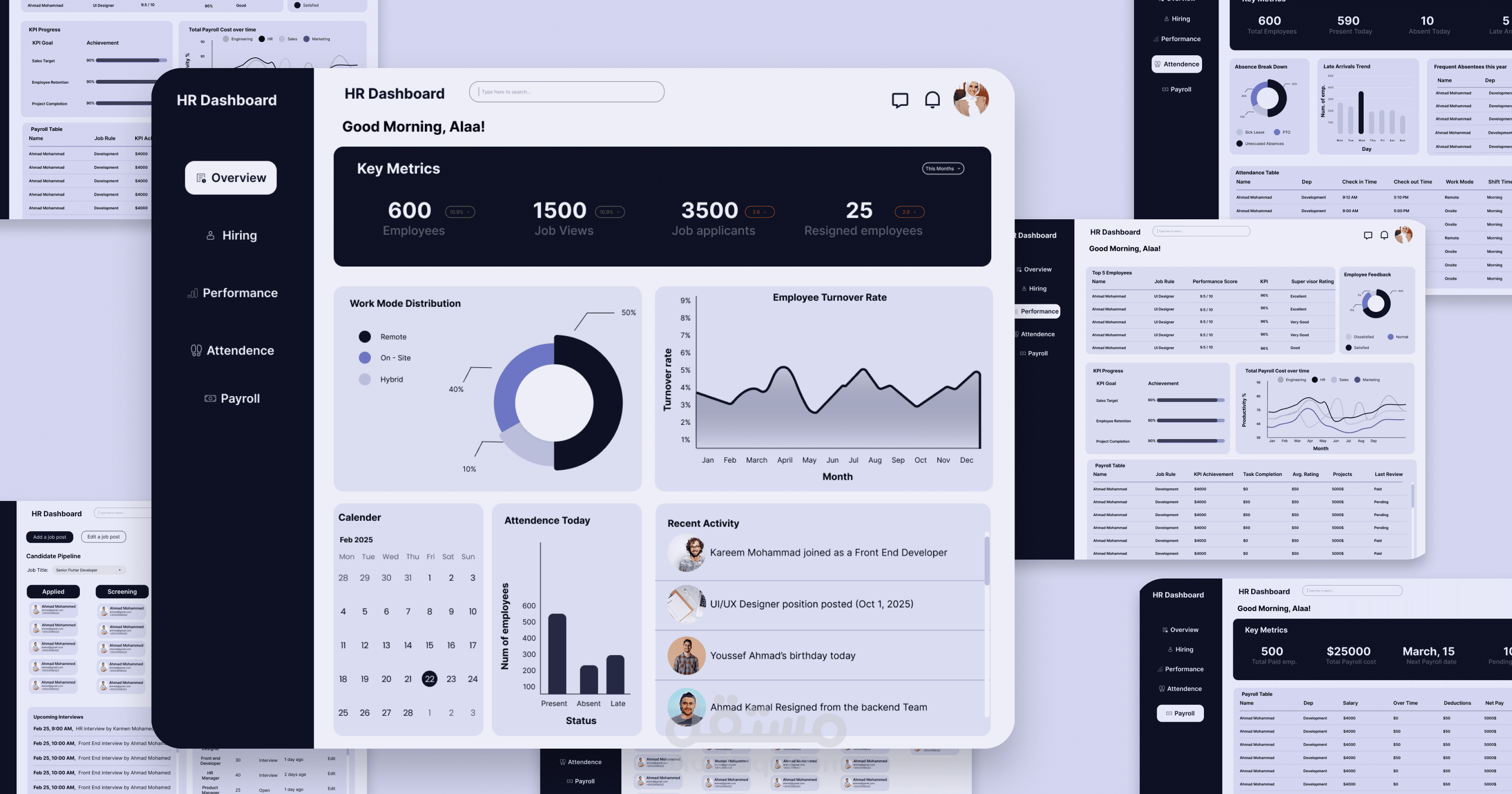 HR Dashboard: يعرض إحصائيات الموظفين، الحضور، الأداء مع رسوم بيانية تسهّل متابعة المؤشرات الرئيسية.