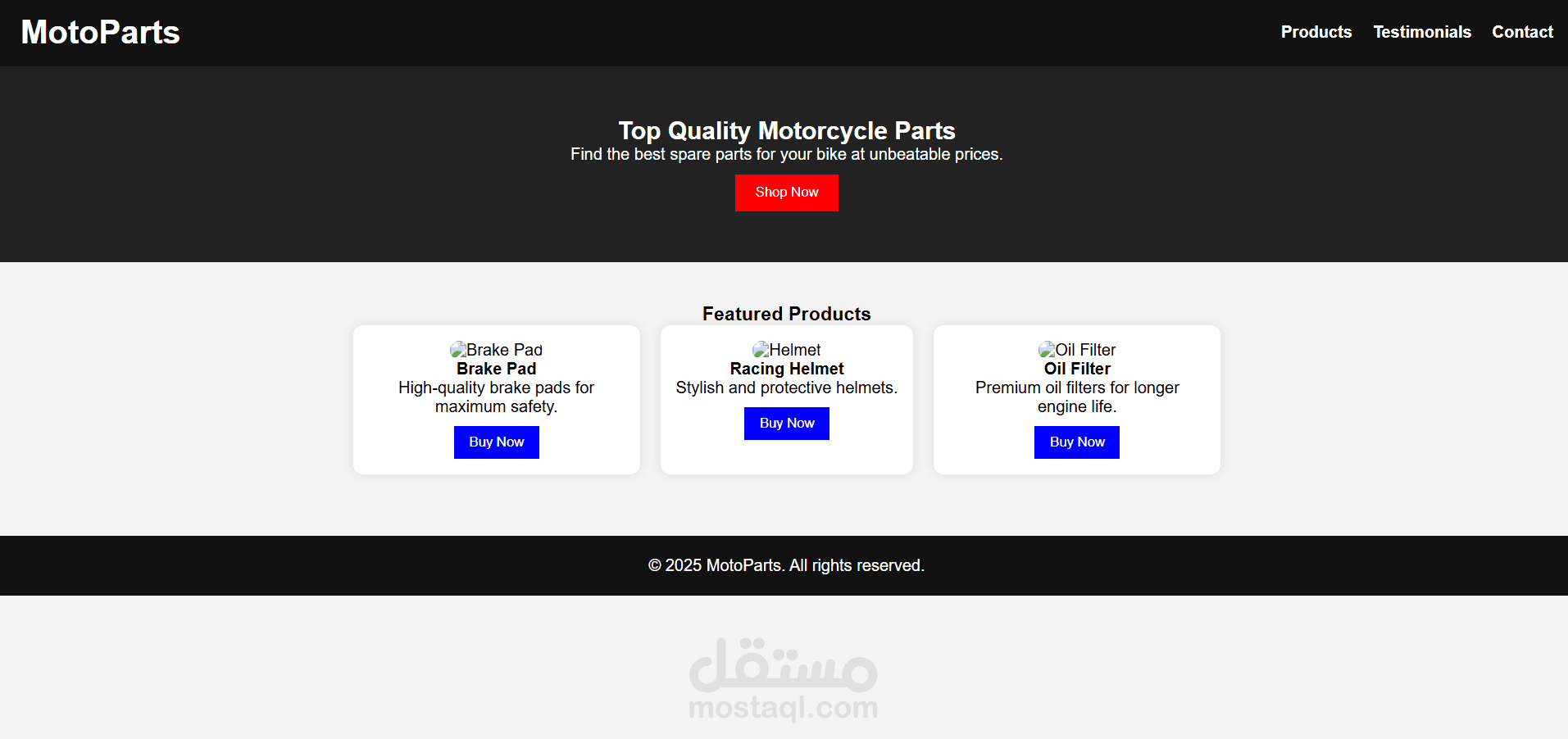 هذا المشروع عبارة عن صفحة هبوط (Landing Page) لمتجر يبيع قطع غيار الموتوسيكلات، وهو مكوّن من: