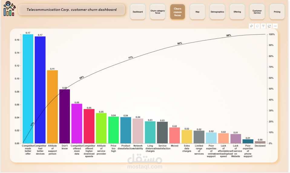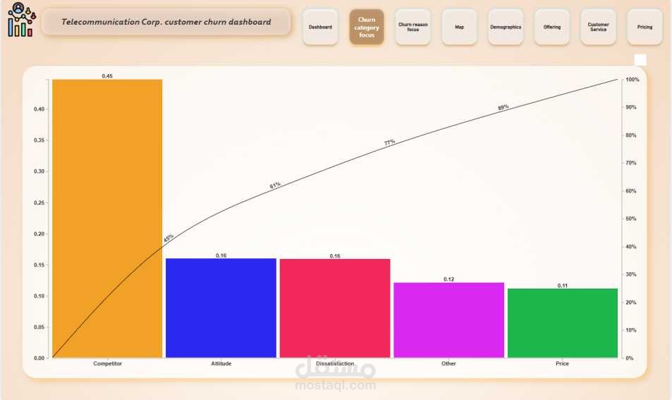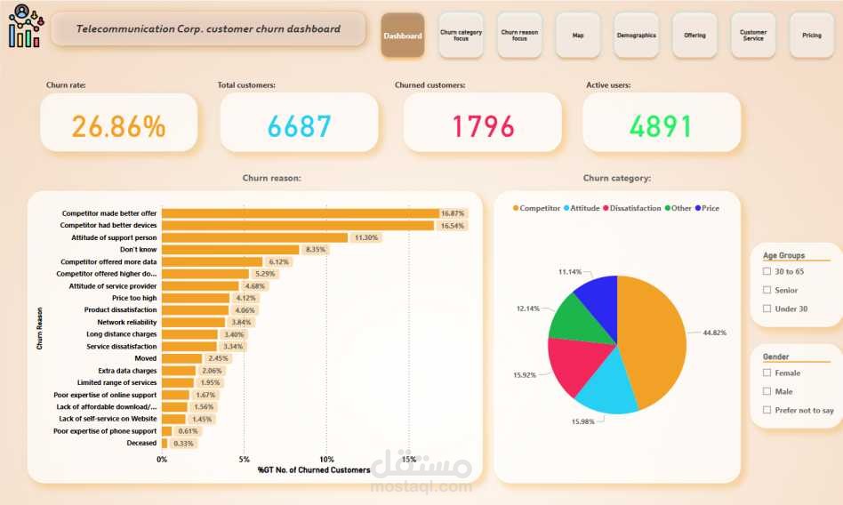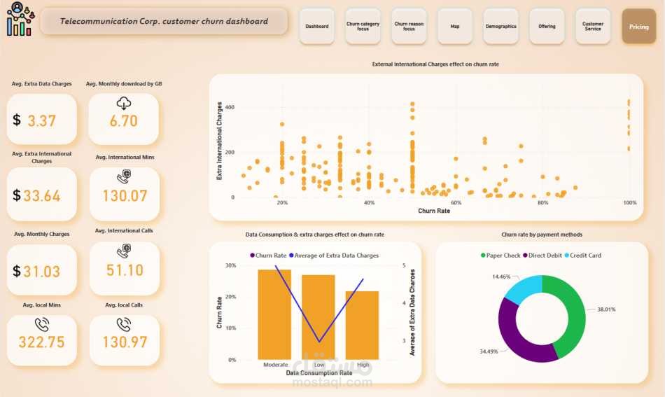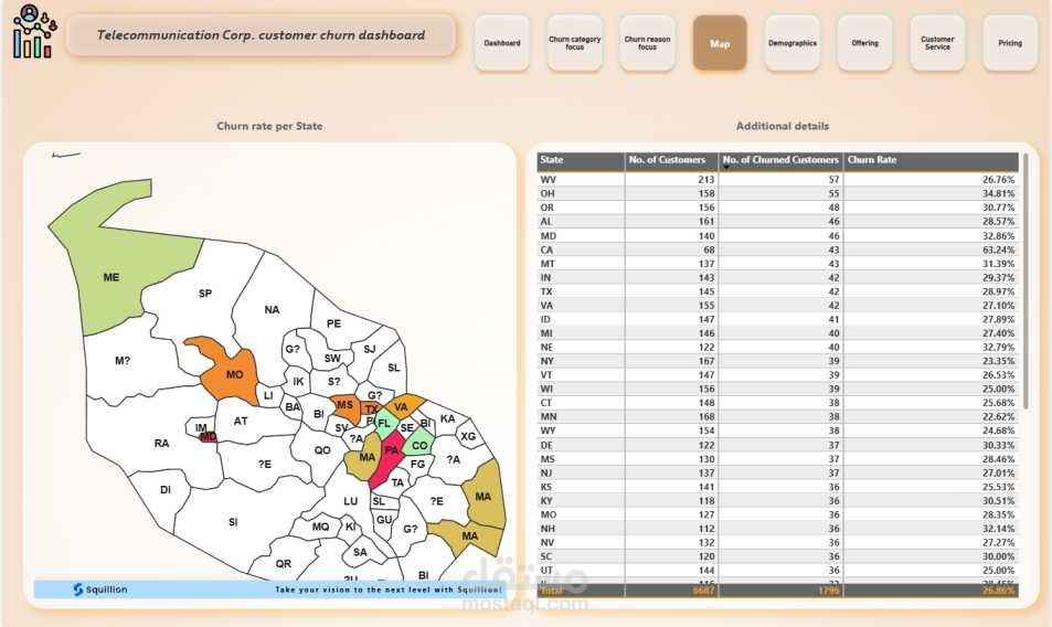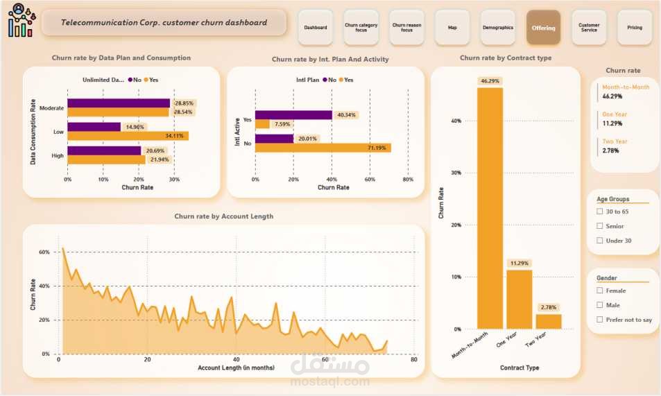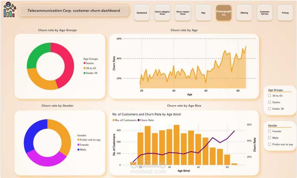 لوحة معلومات تعرض معدلات الاضطراب مقسمة حسب التركيبة السكانية للعملاء ونوع الاشتراك ، وتحديد الأنماط الرئيسية والمجالات المحتملة للتحسين في استراتيجيات الاحتفاظ.